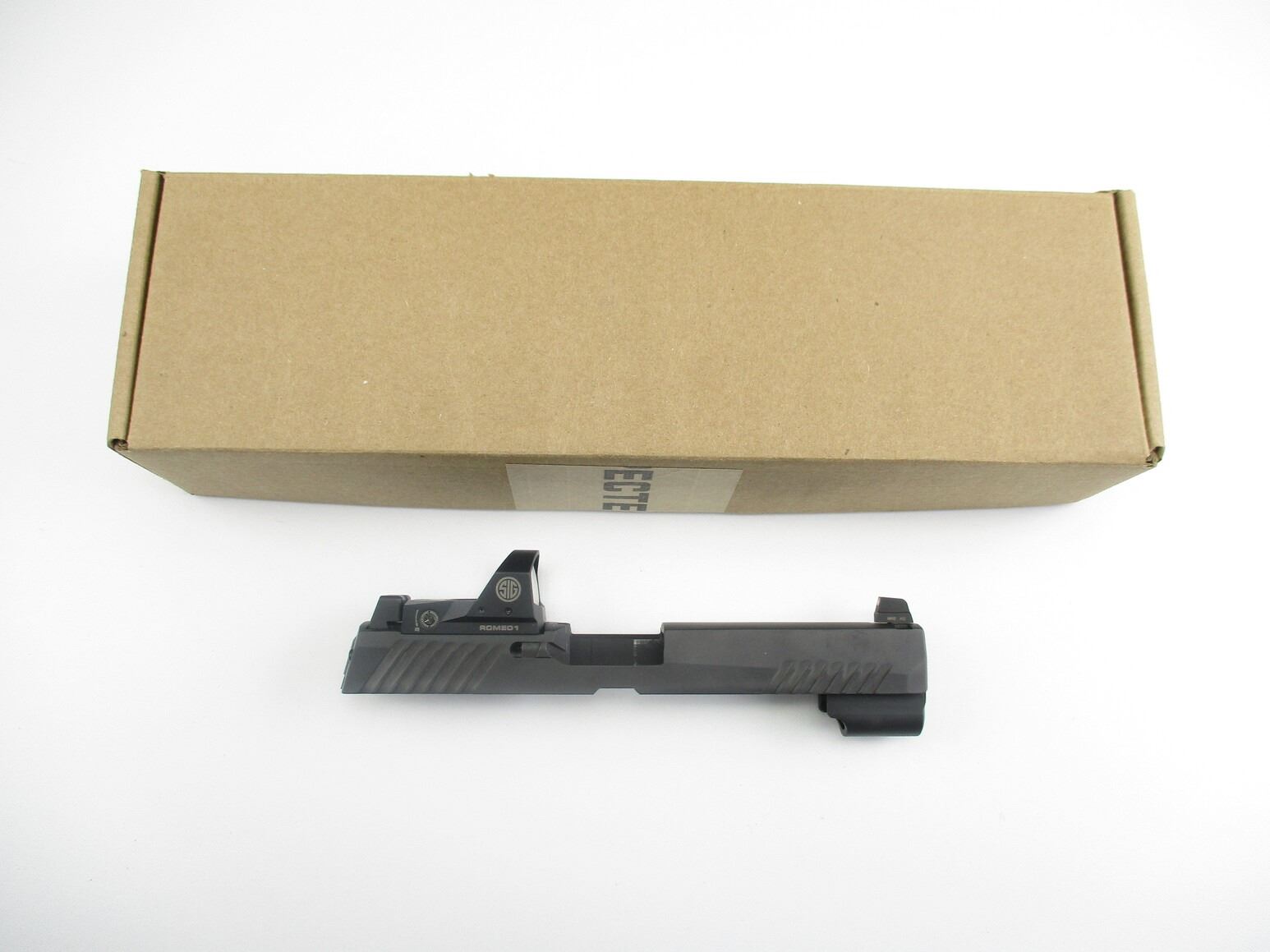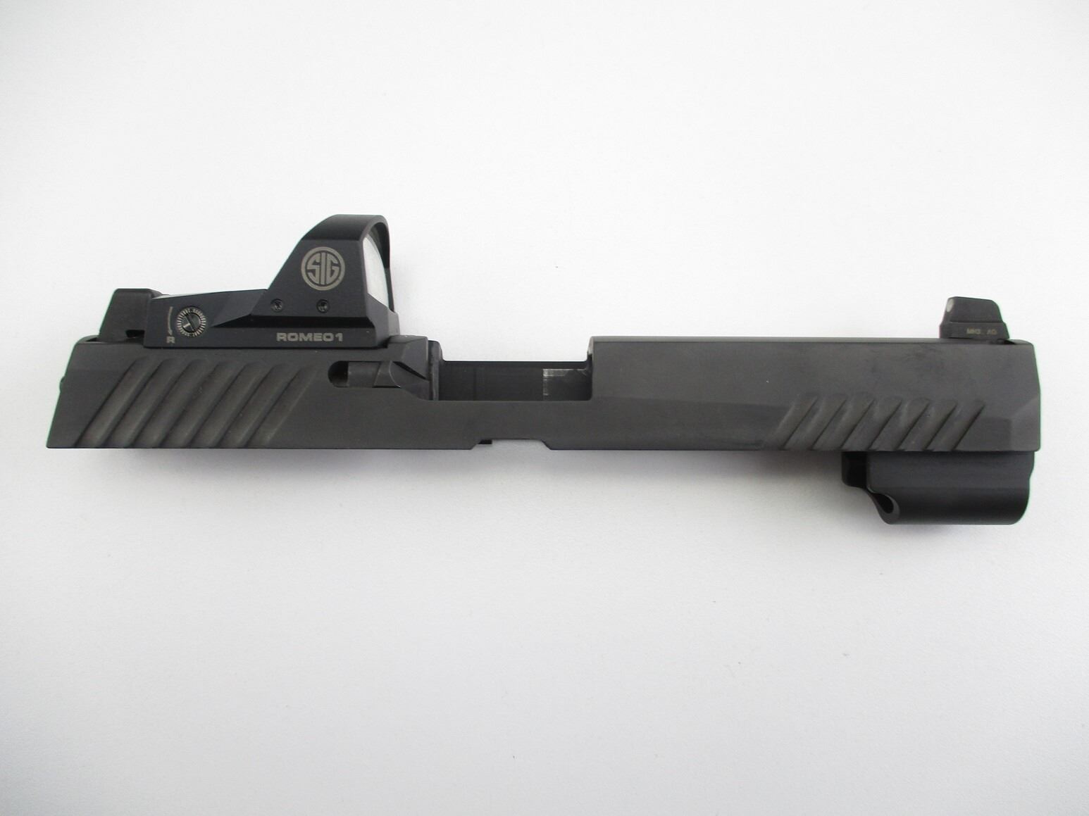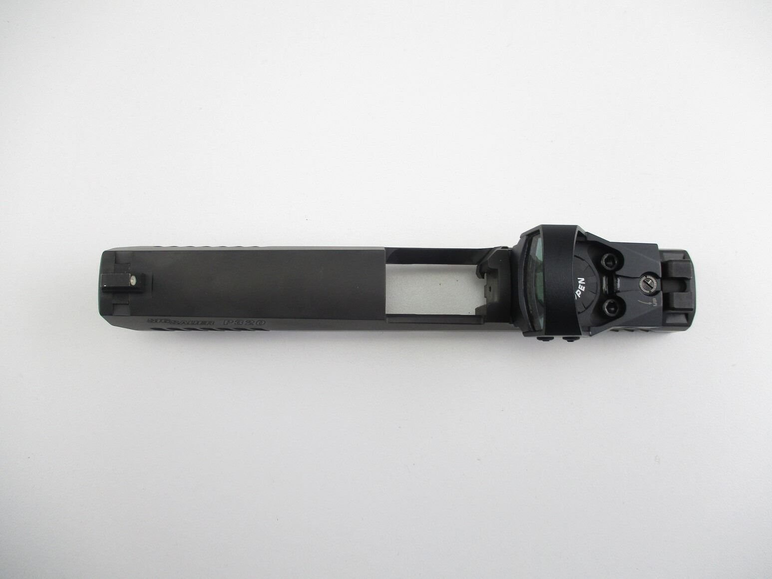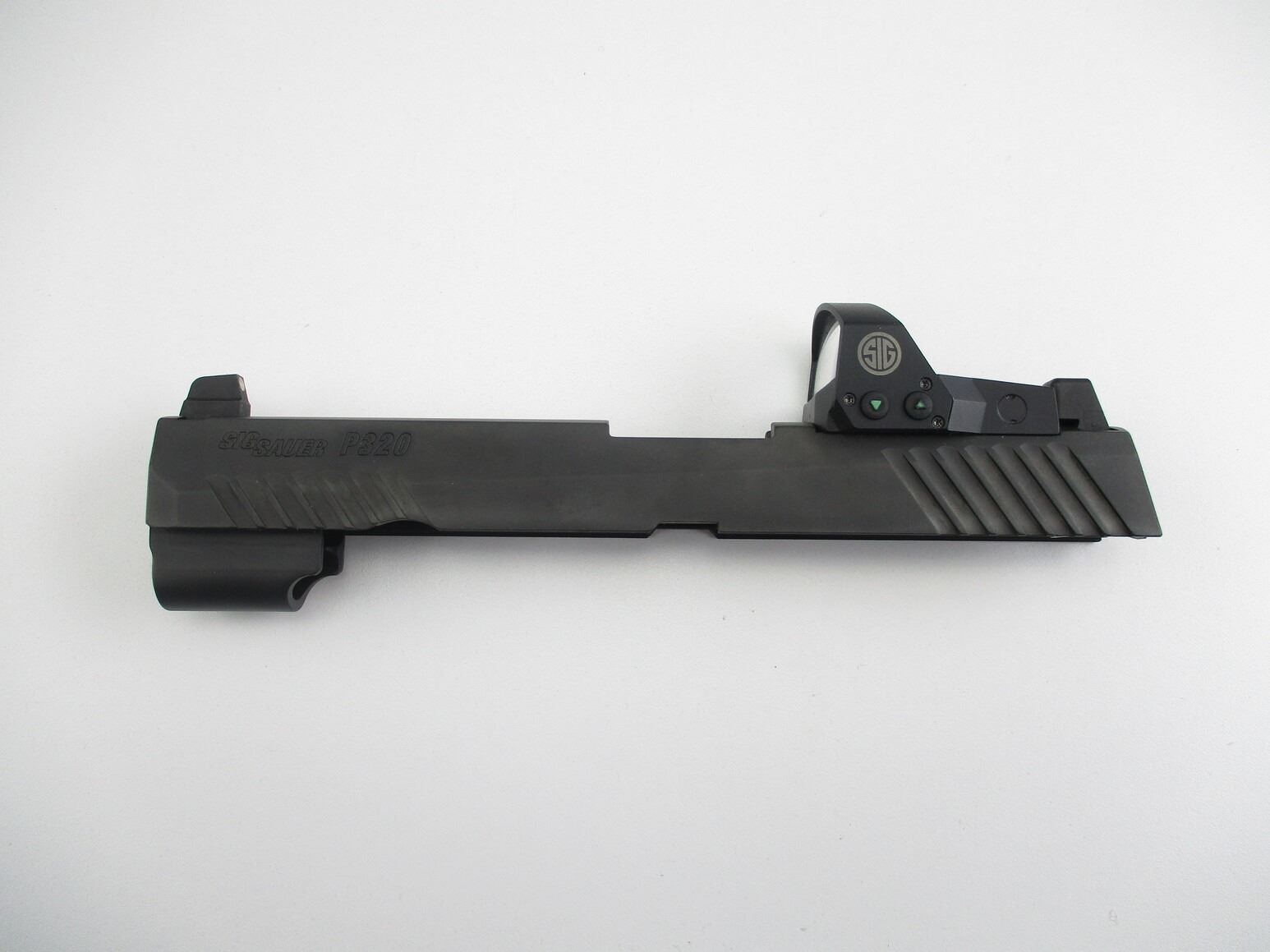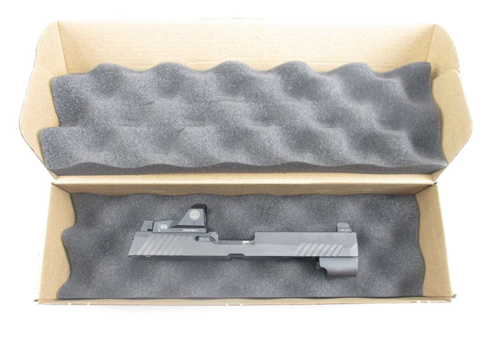 SIG SAUER P320 PISTOL SLIDE WITH RED DOT SIGHT , SLIDE WITH COMPLETE FIRING PIN ASSEMBLY, FRONT & REAR PISTOL NIGHT SIGHTS, COMES WITH ROMEO1 RED-DOT SIGHT, WORKS, MOUNTED TO SLIDE. COMES IN PADDED PACKAGING.