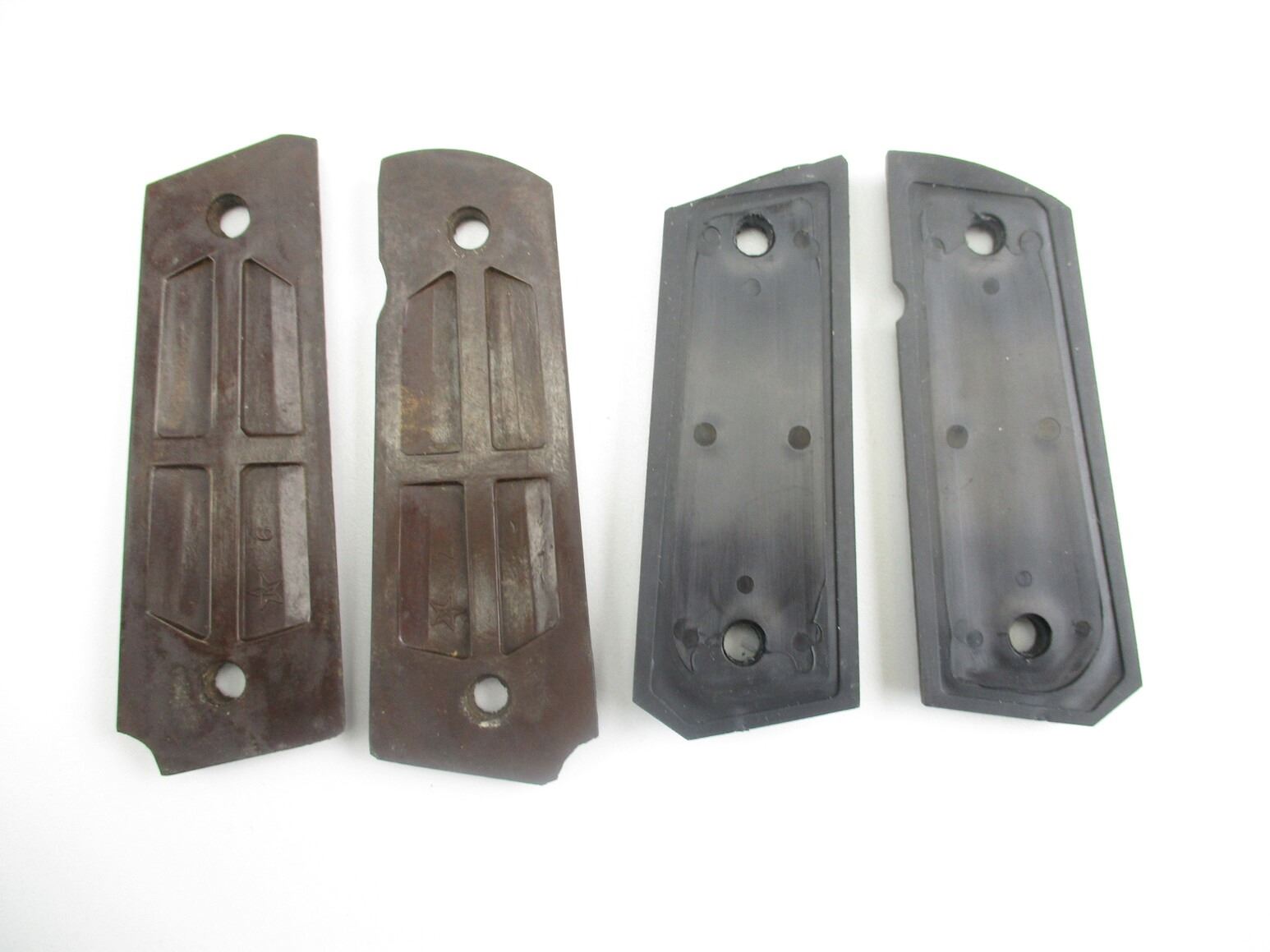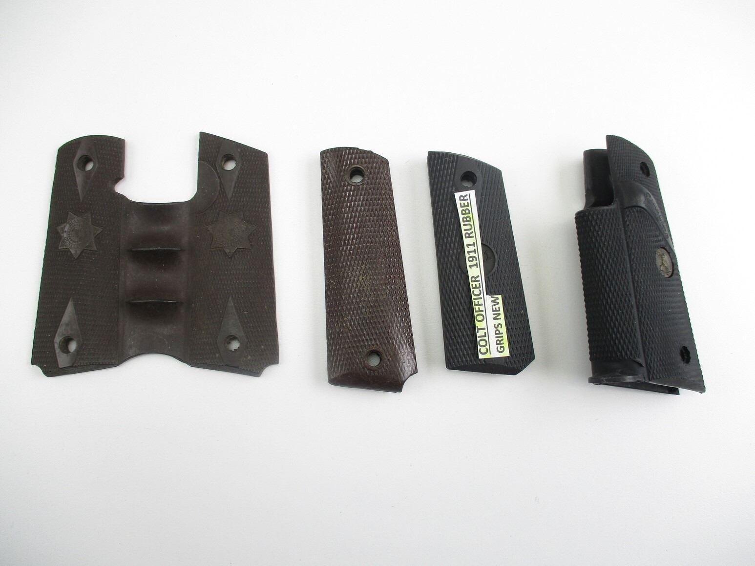 ASSORTED 1911 PISTOL GRIPS , (1) PAIR OF RUGGER BIANCHI GRIPS, WARN & CRACKED BY FINGER GROOVES, (1) PAIR OF PACHMAYR GRIPS, (1) PAIR OF 1911 COLT OFFICER RUBBER GRIPS. (1) PAIR OF PLASTIC 1911 GRIPS.
