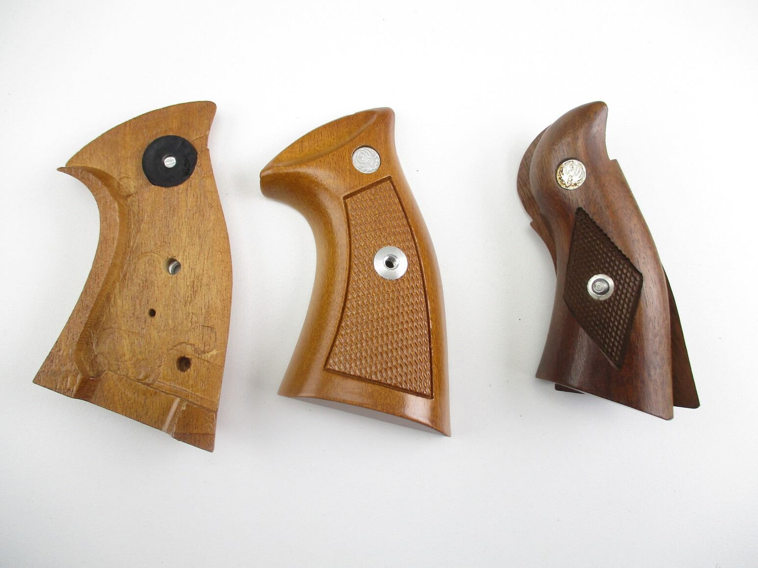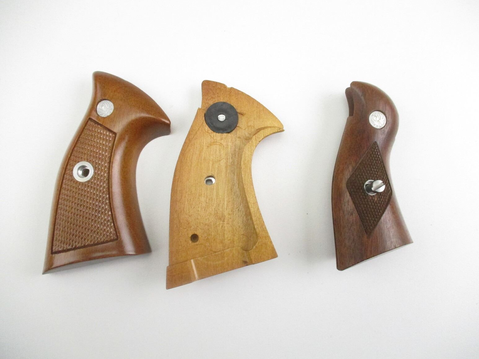 RUGER SECURITY SIX REVOLVER GRIPS , (1) COMPLETE PAIR OF WALNUT GRIPS, CHECKERED, NO MOUNTING SCREW, (1) WALNUT GRIPS WITH MOUNTING SCREW.