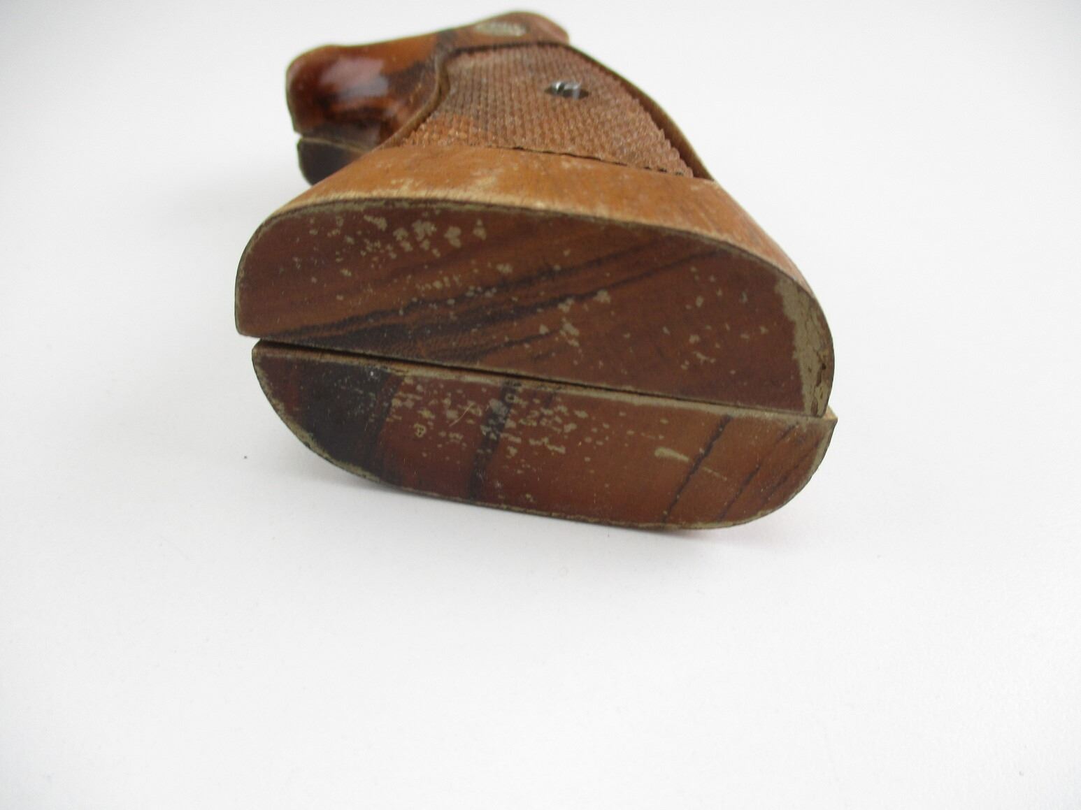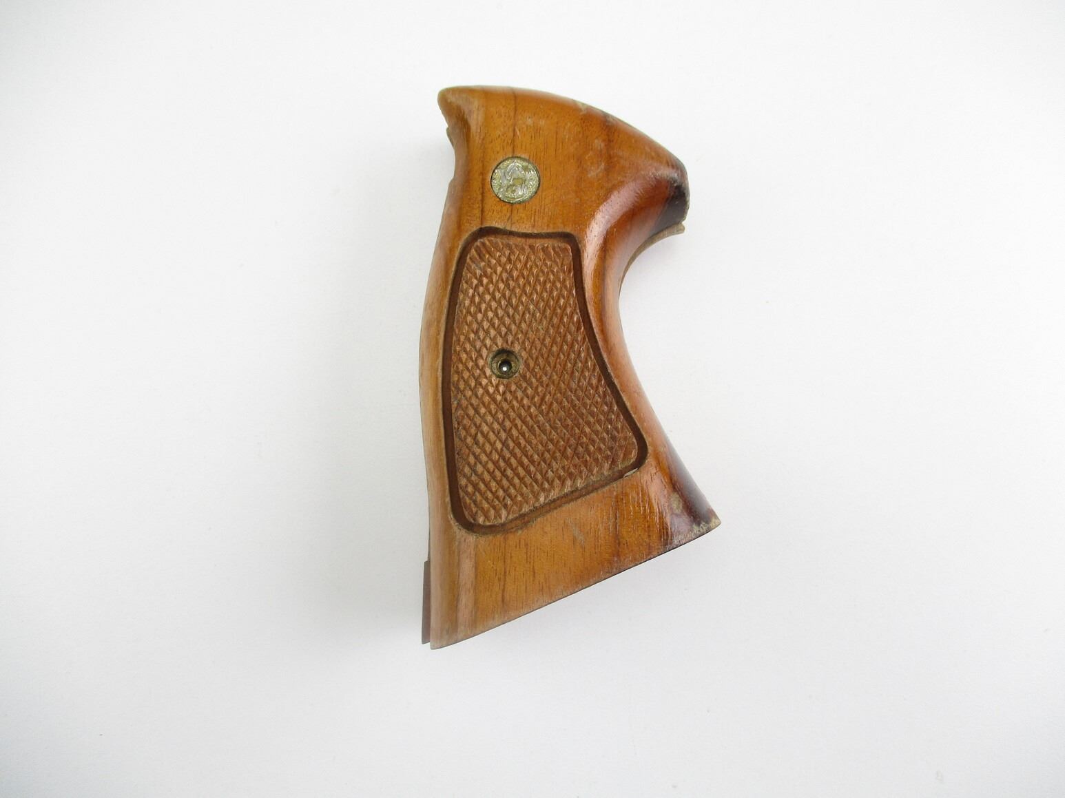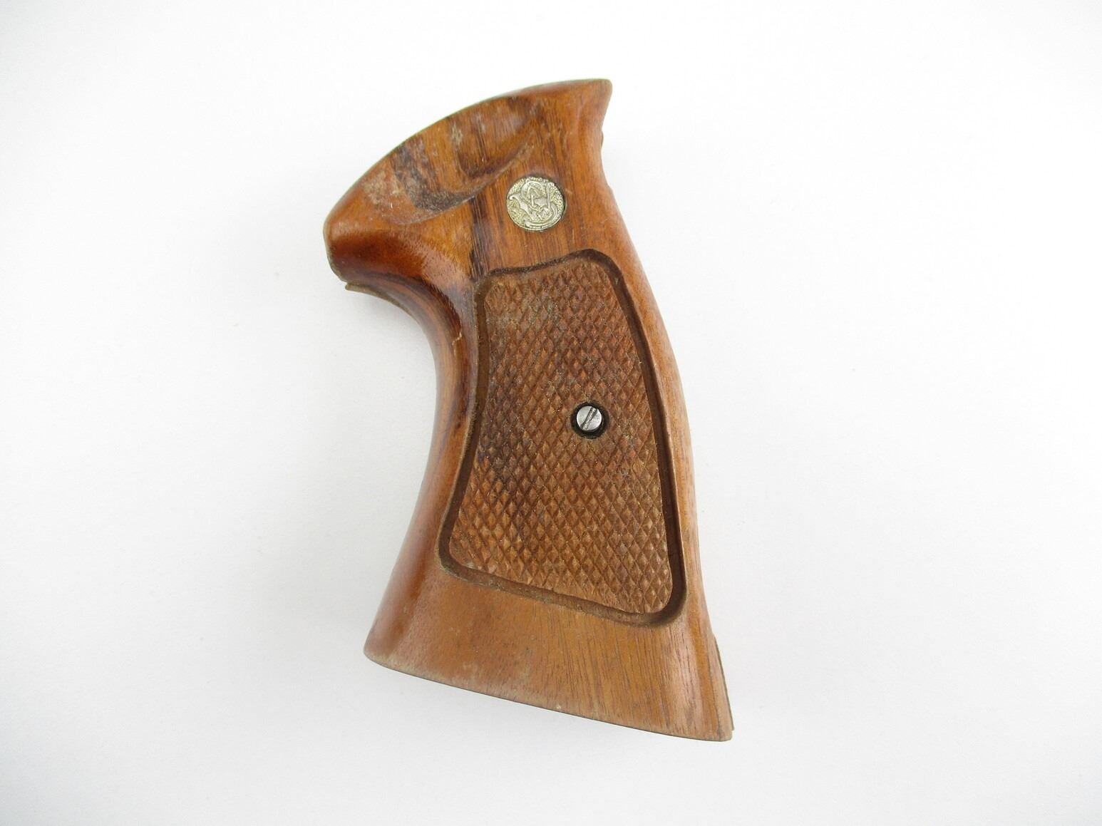SMITH & WESSON K FRAME REVOLVER GRIPS , WOODEN, CHECKERED, S&W LOGO, WITH MOUNTING SCREWS. APPEARS USED, MAY REQUIRE FITTING.