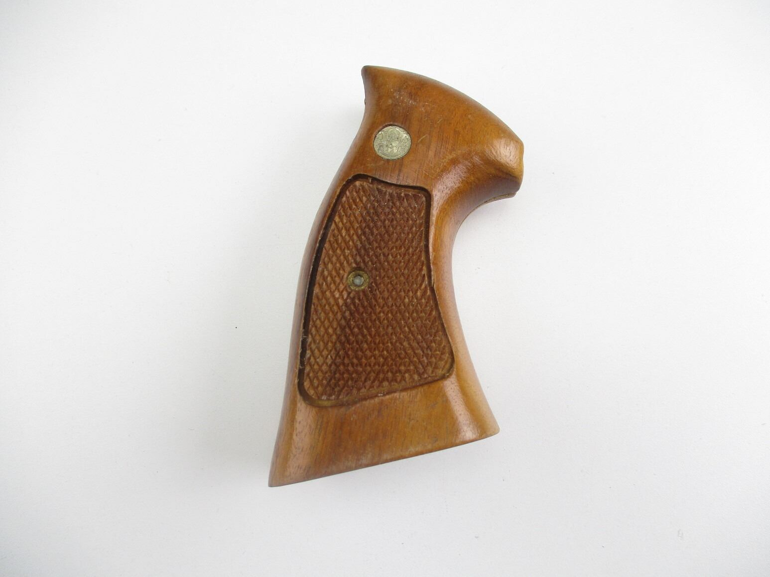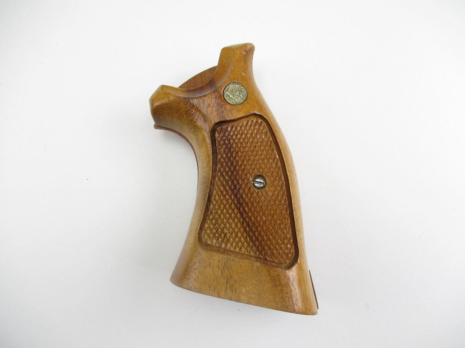SMITH & WESSON K FRAME REVOLVER GRIPS , WOODEN, CHECKERED, S&W LOGO, WITH MOUNTING SCREWS, MAY REQUIRE FITTING.
