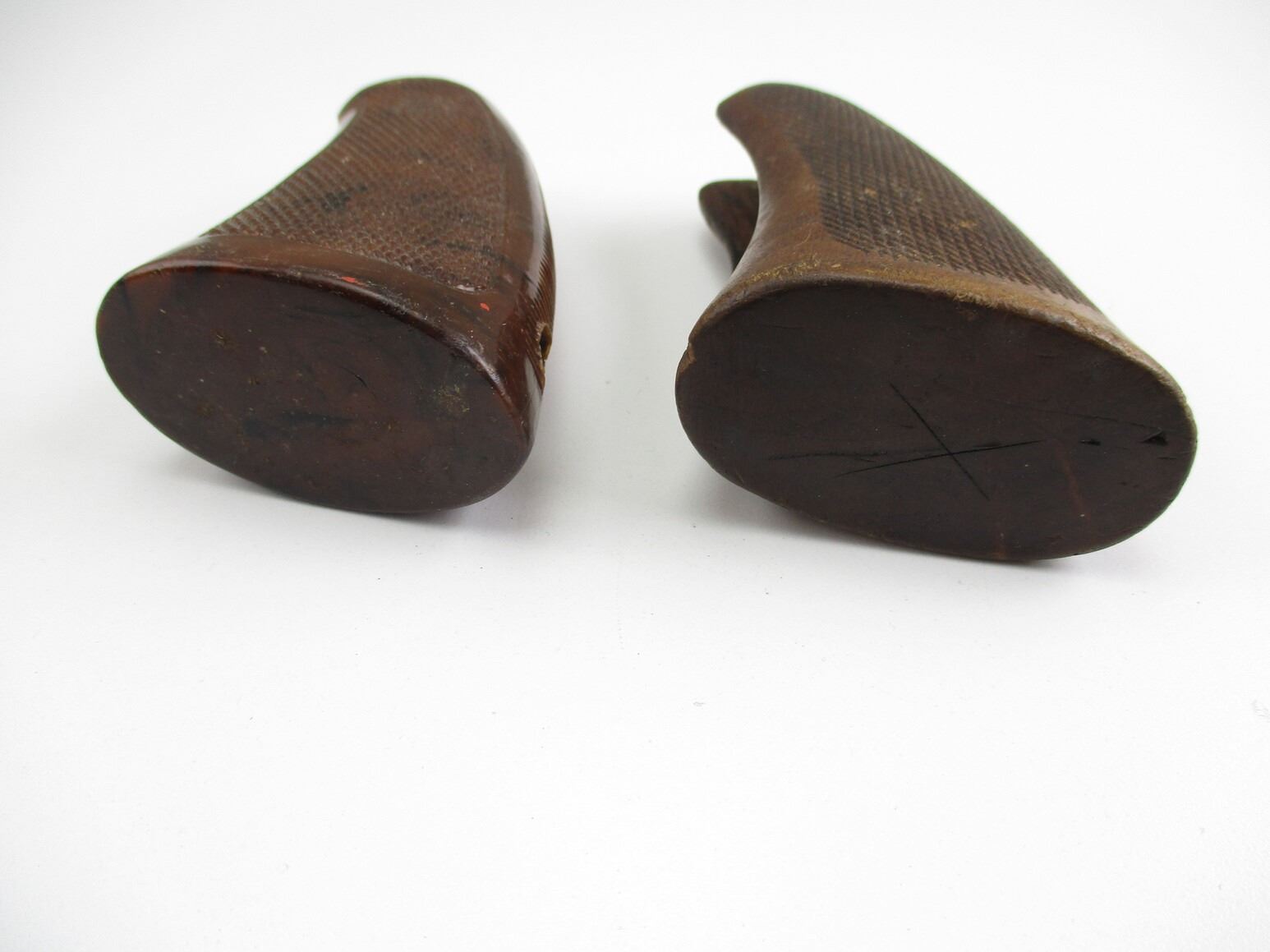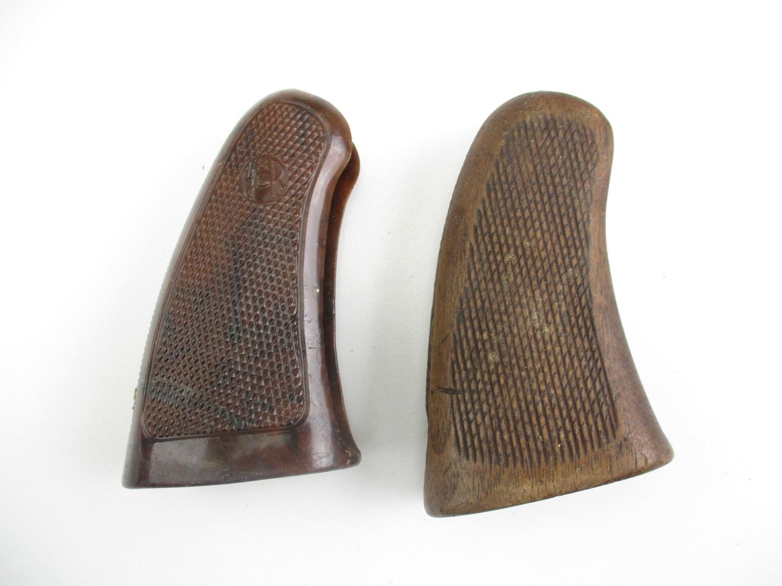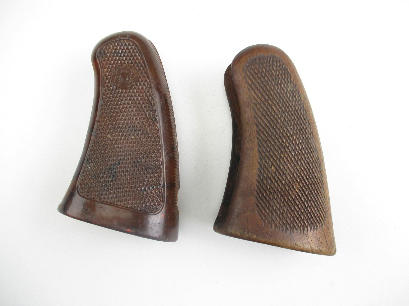 HARRINGTON & RICHARDSON REVOLVER GRIPS , LOT OF 2. POSSIBLY FOR MODEL 999 SPORTSMAN, (1) HARD PLASTIC, MARKED H&R, (1) WOODEN, INCLUDES MOUNTING SCREW, BOTH CHECKERED, MAY REQUIRE FITTING.
