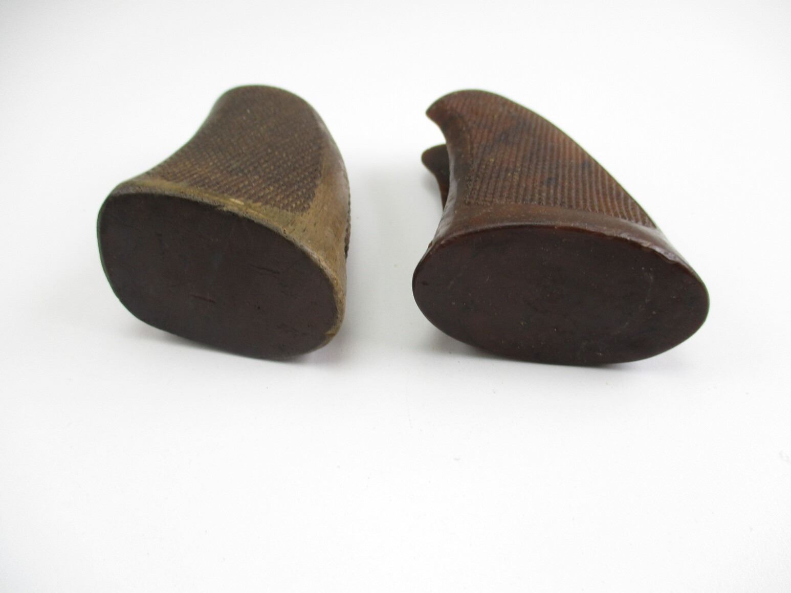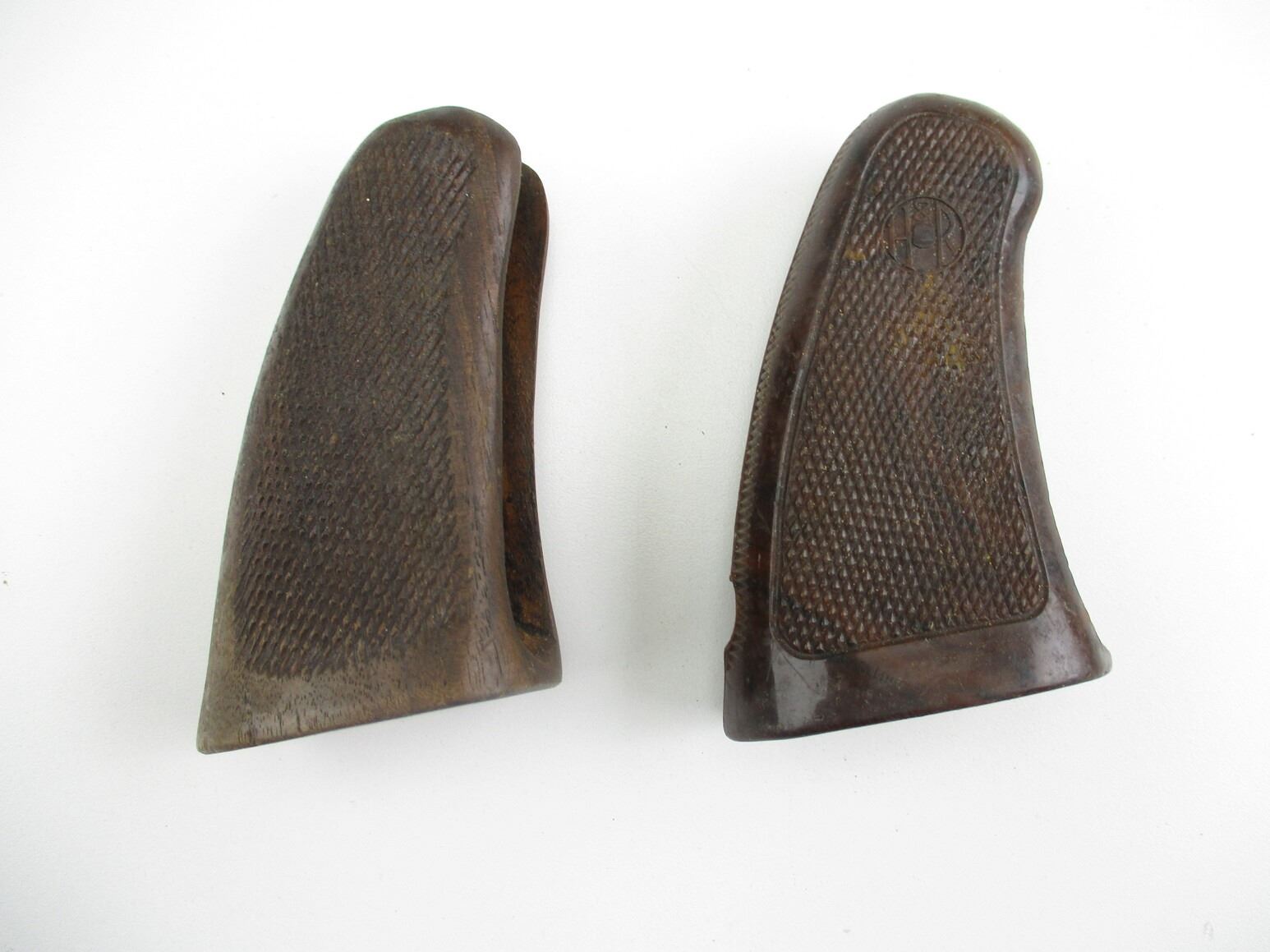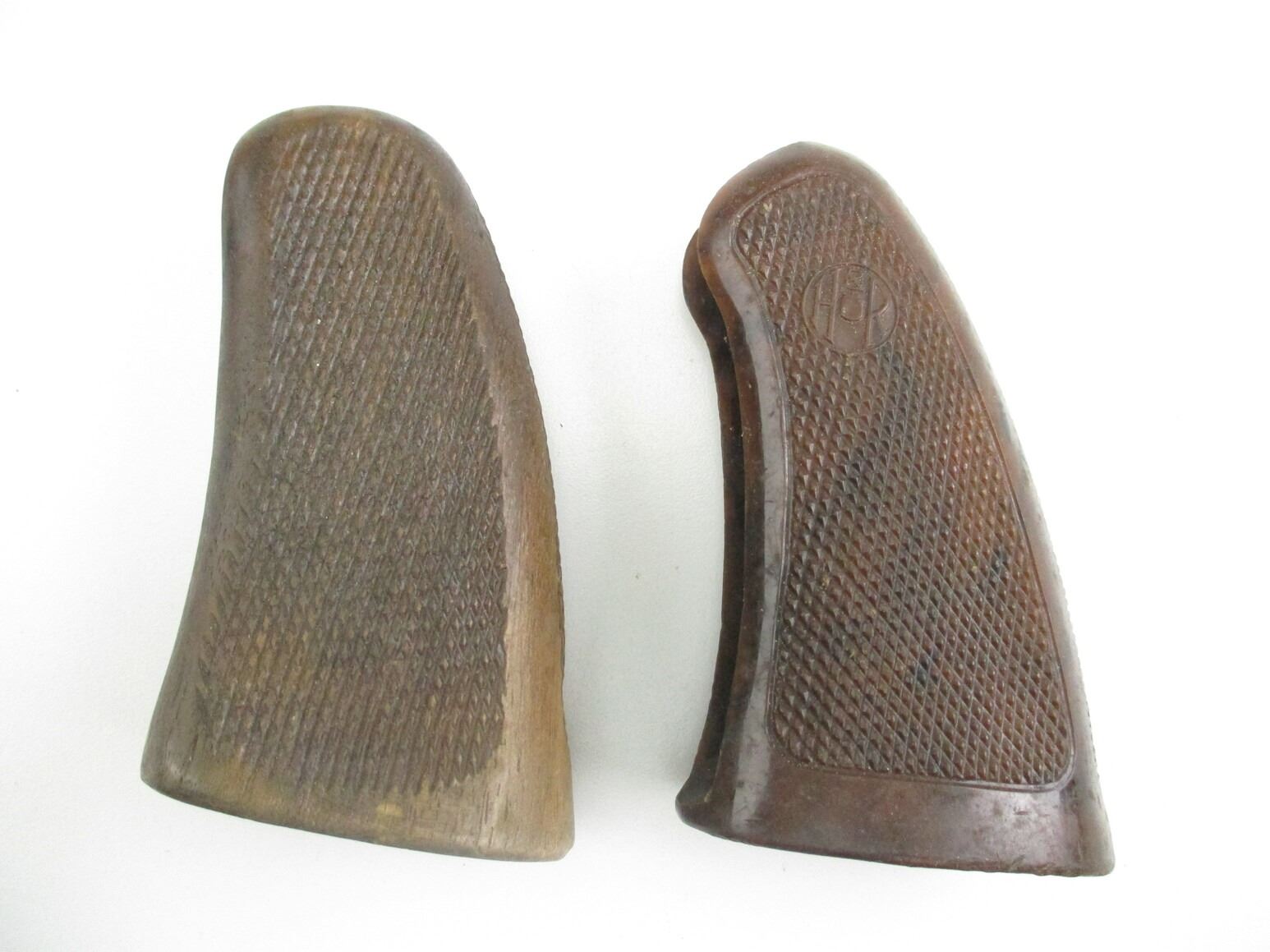 HARRINGTON & RICHARDSON REVOLVER GRIPS , LOT OF 2. POSSIBLY FOR MODEL 999 SPORTSMAN, (1) HARD PLASTIC, MARKED H&R, (1) WOODEN, INCLUDES MOUNTING SCREW, BOTH CHECKERED, MAY REQUIRE FITTING.