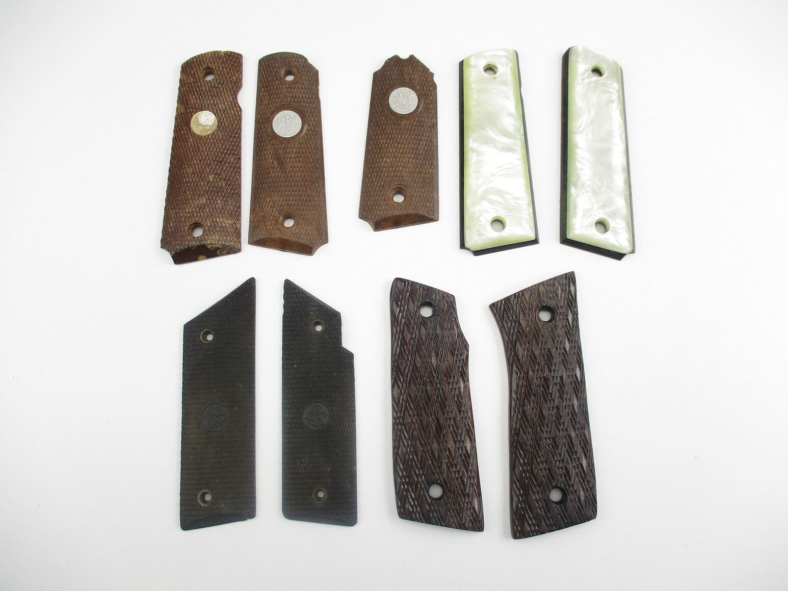 ASSORTED SEMI-AUTO PISTOL GRIPS , INCLUDES: 1911 COLT, HS, & UNKNOWN PISTOL GRIPS, MISSING MOUNTING SCREWS.