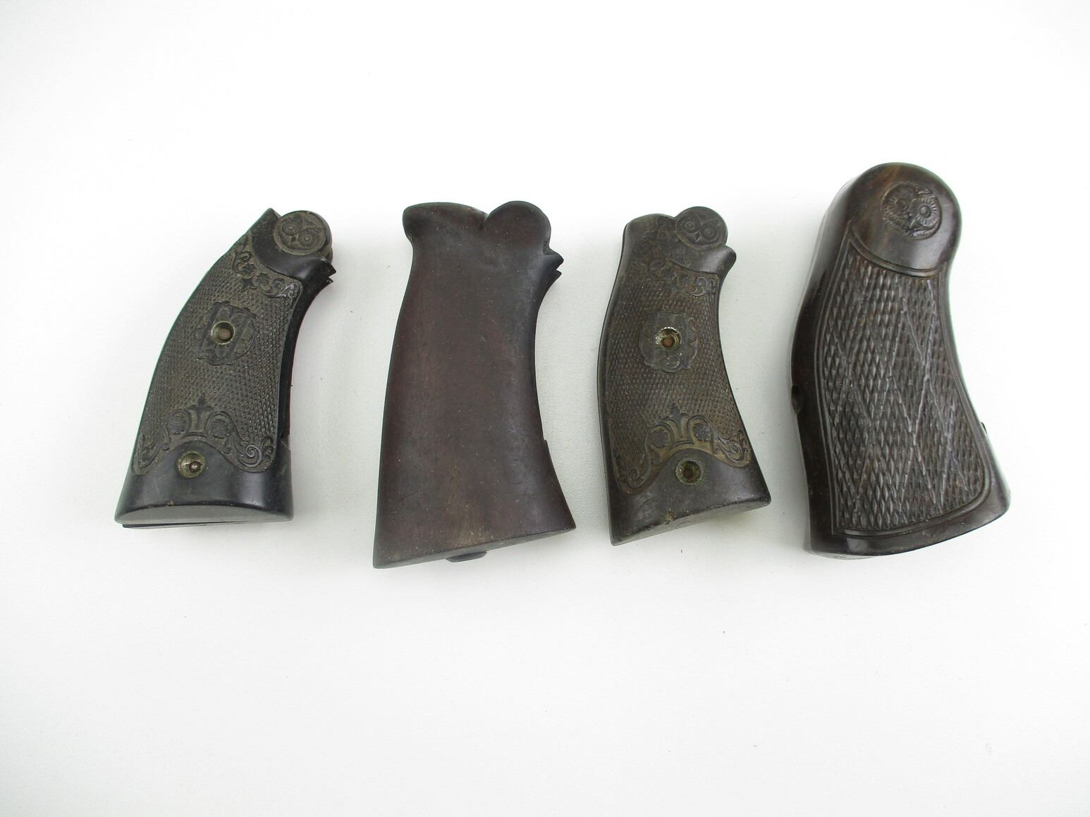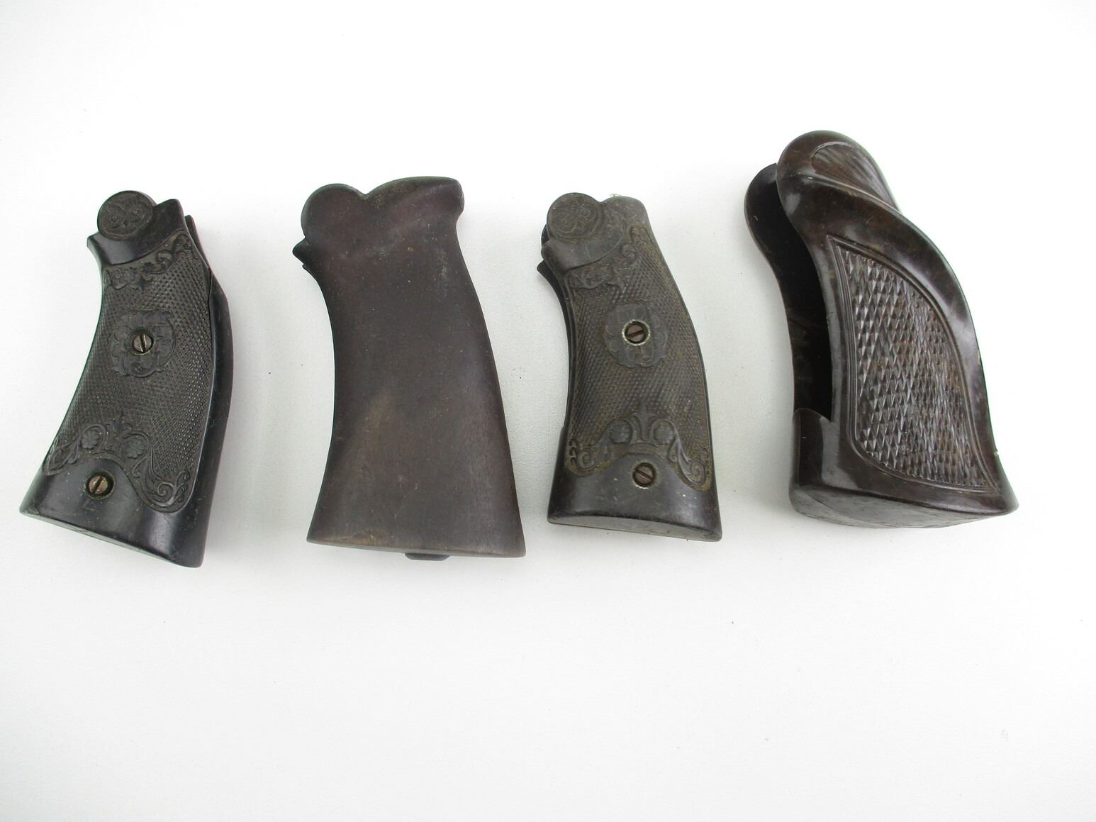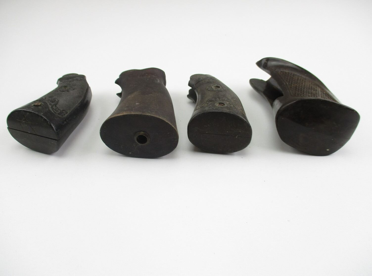 IVER JOHNSON REVOLVER GRIPS, INCLUDES: MONO GRIP FOR MODEL 57, PLASTIC, WITH THUMB REST, CHECKERED, MISSING MOUNTING SCREW, (2) MEDIUM FRAMED REVOLVER GRIPS, WITH MOUNTING SCREWS, (1) WOODEN UNMARKED MONO GRIP, FOR TOP BREAK LARGE FRAMED IVER JOHNSON REVOLVER. NO MOUNTING SCREW.