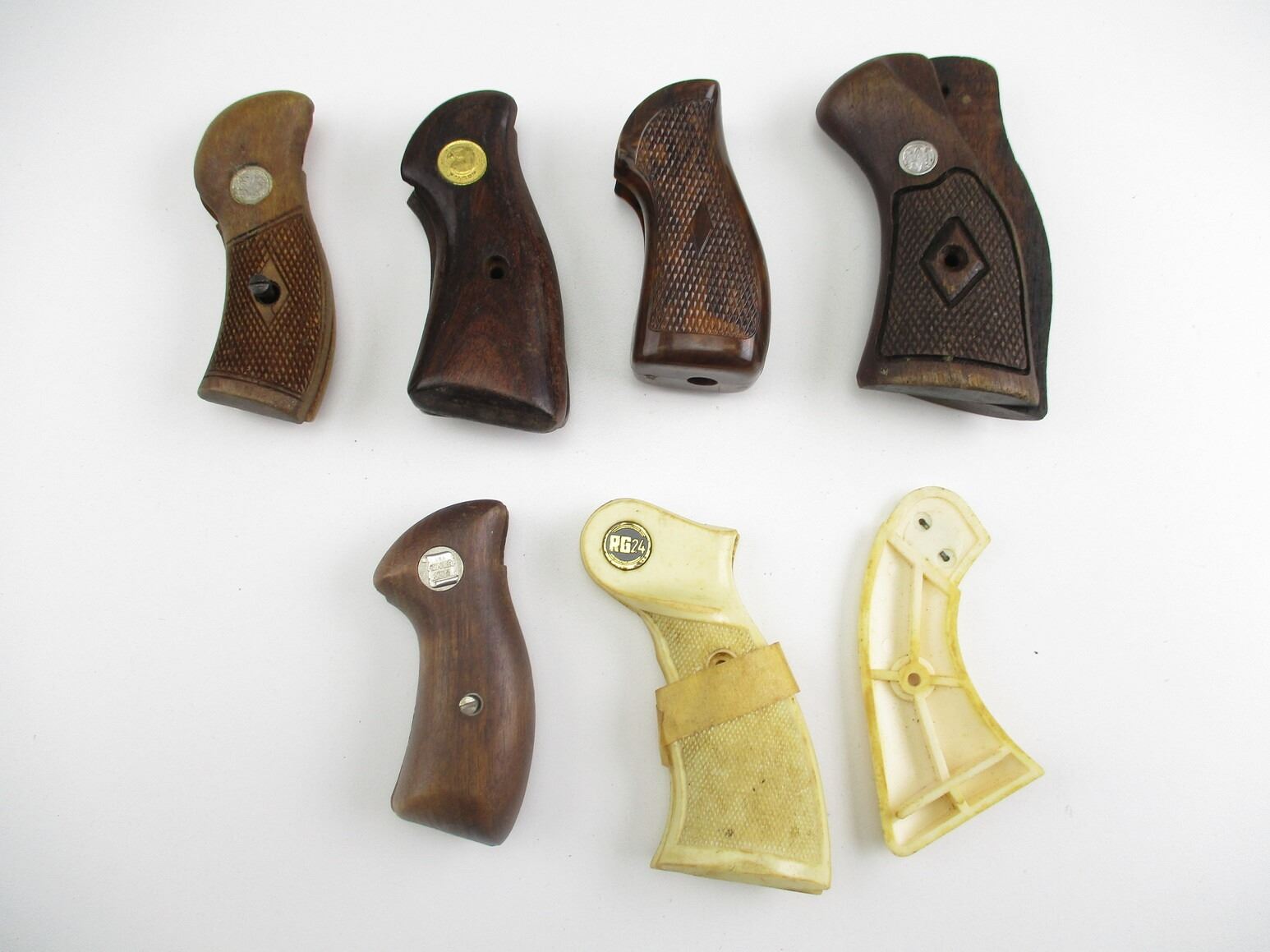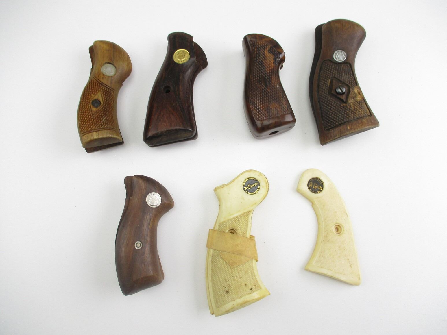 ASSORTED MEDIUM FRAME REVOLVER GRIPS , INCLUDES: FALCON, CHARTER ARMS, ROHM, ETC. PLASTIC & WOODEN GRIPS, SOME WITH MOUNTING SCREWS.
