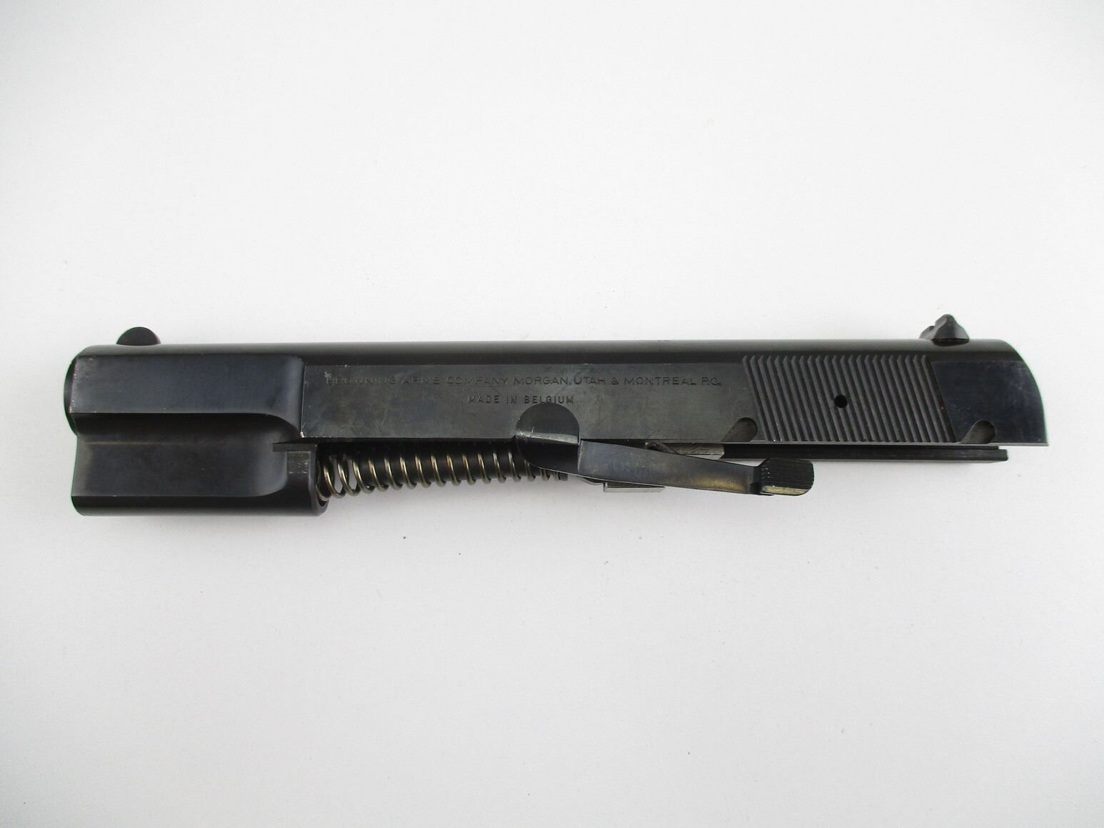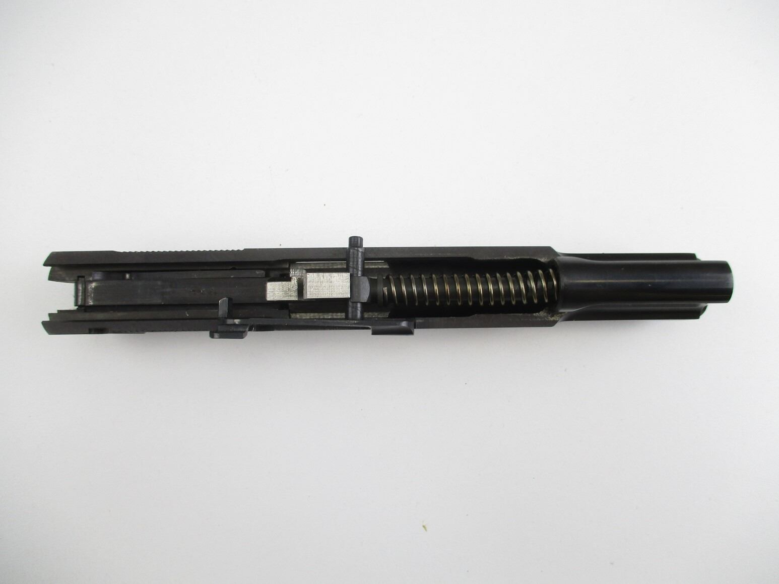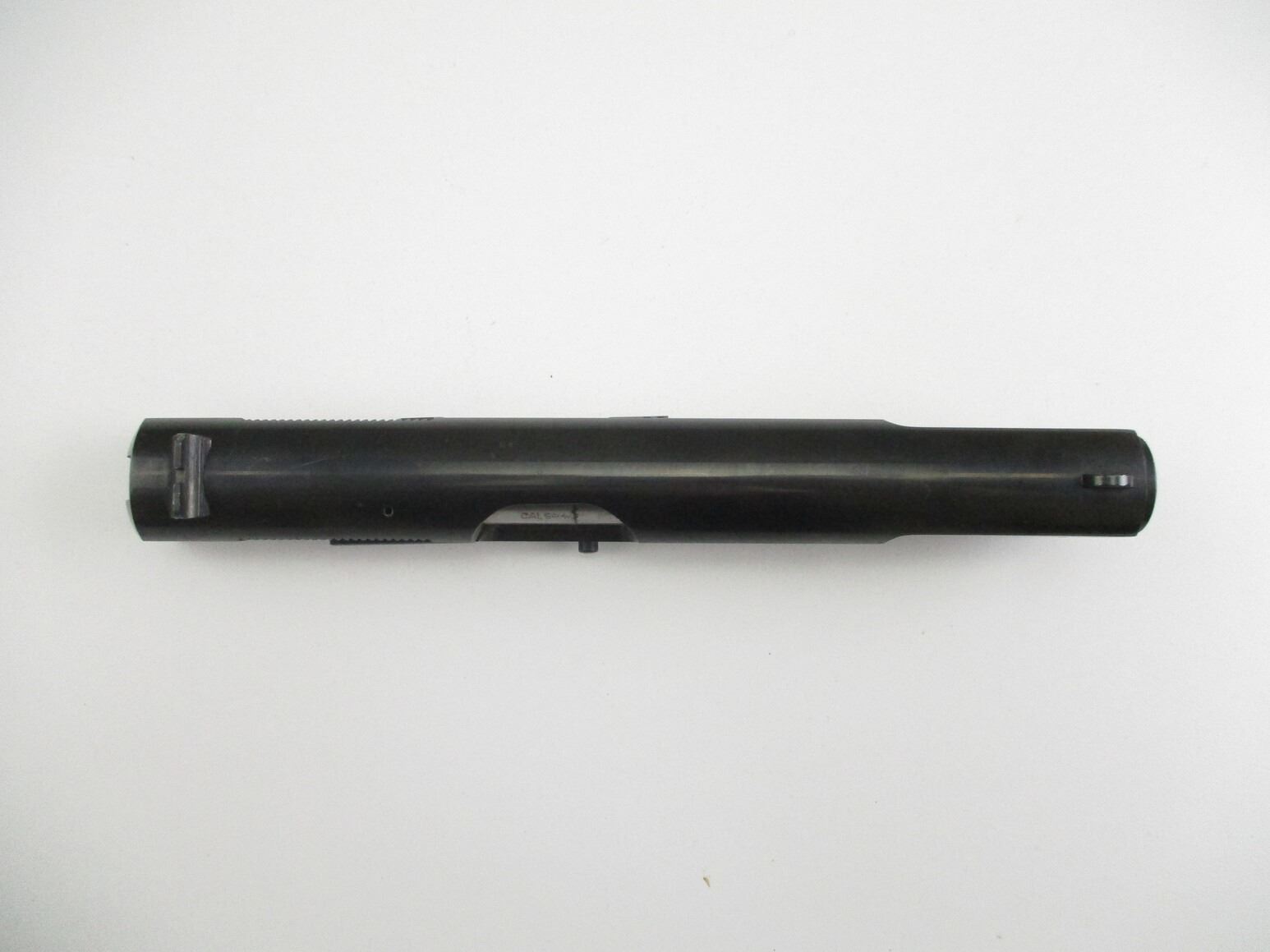 BROWNING HI-POWER PISTOL SLIDE , COMPLETE SIDE, 9MM, PISTOL BARREL, APPROX. 4.75" OAL, VERY GOOD / SHINY BORE, FIRING PIN ASSEMBLY, EXTRACTOR, SLIDE CATCH, PISTOL SIGHTS, ETC. BLUED STEEL, MAY REQUIRE FITTING.