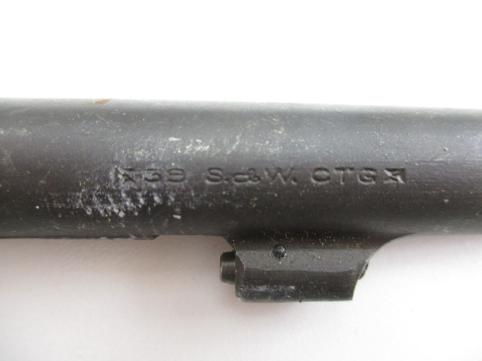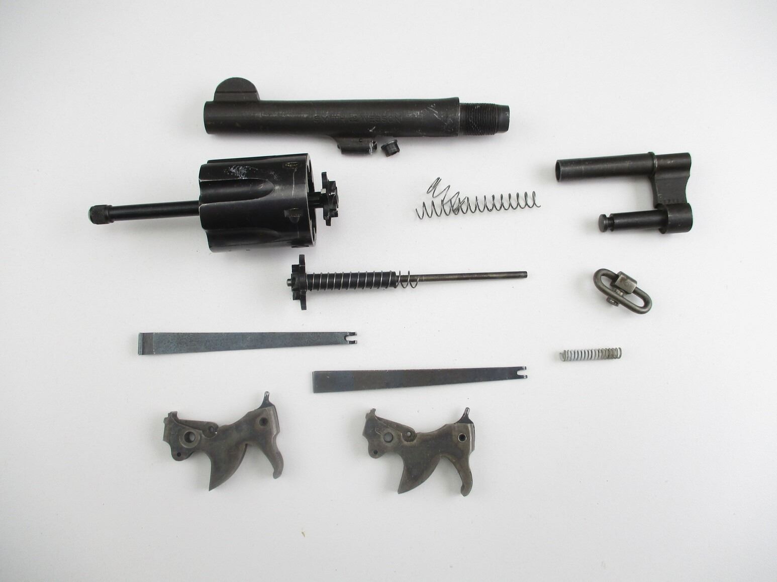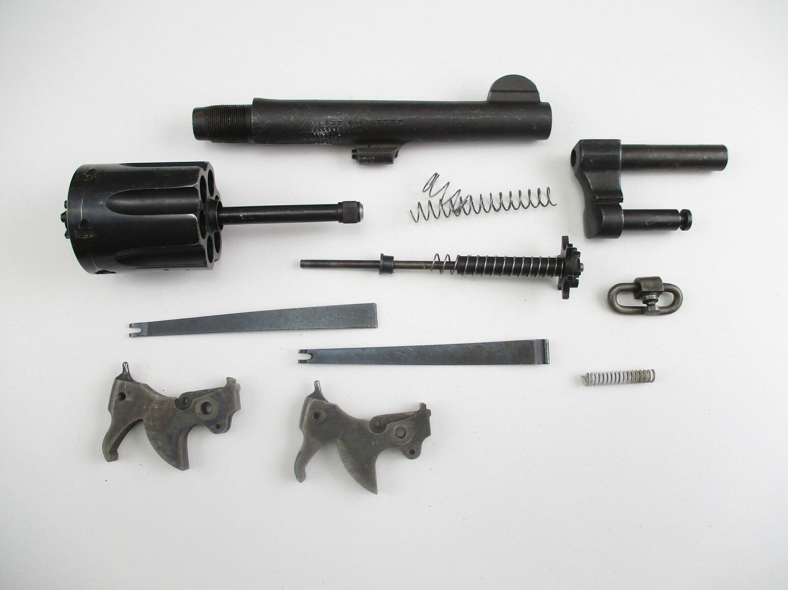 SMITH & WESSON .38 S&W REVOLVER PARTS , INCLUDES: REVOLVER BARREL, APPROX. 5" BARREL, GOOD / SHINY BORE, ALSO INCLUDES: CRANE, HAMMERS, CYLINDER WITH EXTRACTOR, SPRINGS, ETC. PARTS MAY REQUIRE FITTING.