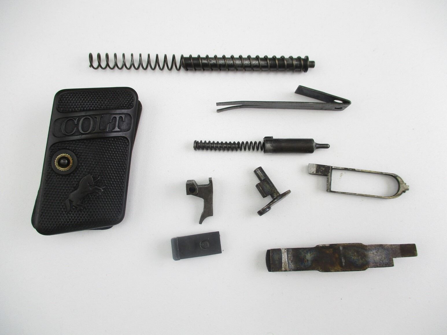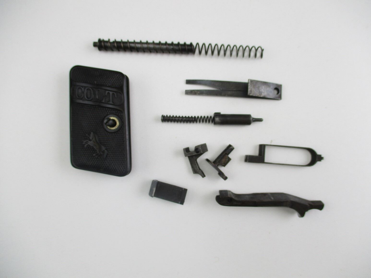 COLT MODEL 1908 PARTS , INCLUDES: PISTOL GRIPS WITH MOUNTING SCREW, GRIP SAFETY, SEAR SPRING, FIRING PIN ASSEMBLY, RECOIL SPRING & GUIDE, ETC.