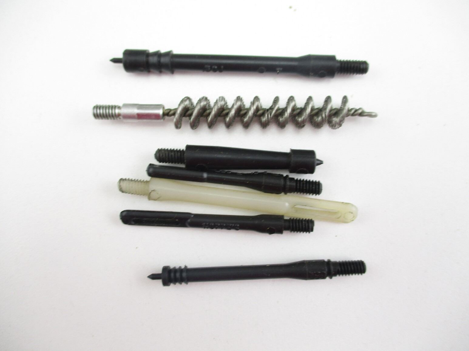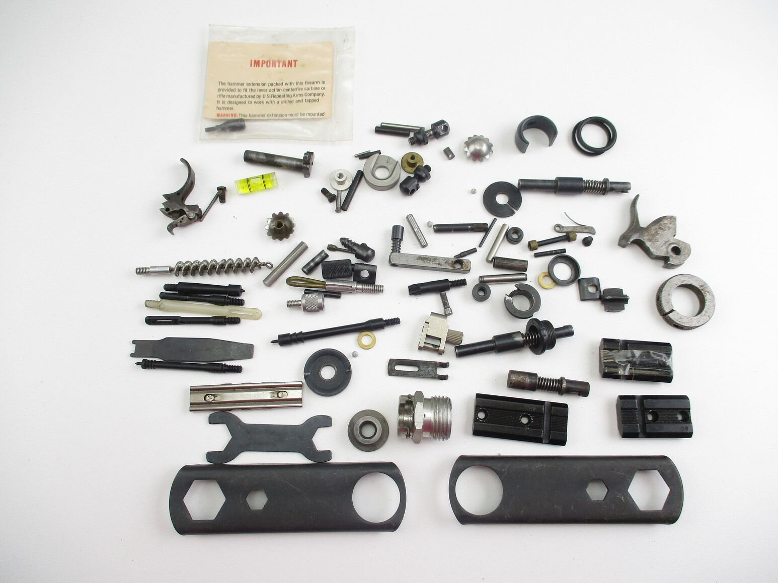 ASSORTED GUN PARTS ETC, INCLUDES: UNKNOWN REVOLVER HAMMER, TRIGGER, ETC, RELOADING ACCESSORIES, TOOLS, LEVEL, HAMMER EXTENSION, GUN CLEANING ACCESSORIES ETC.