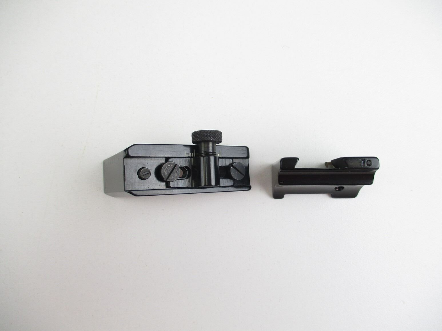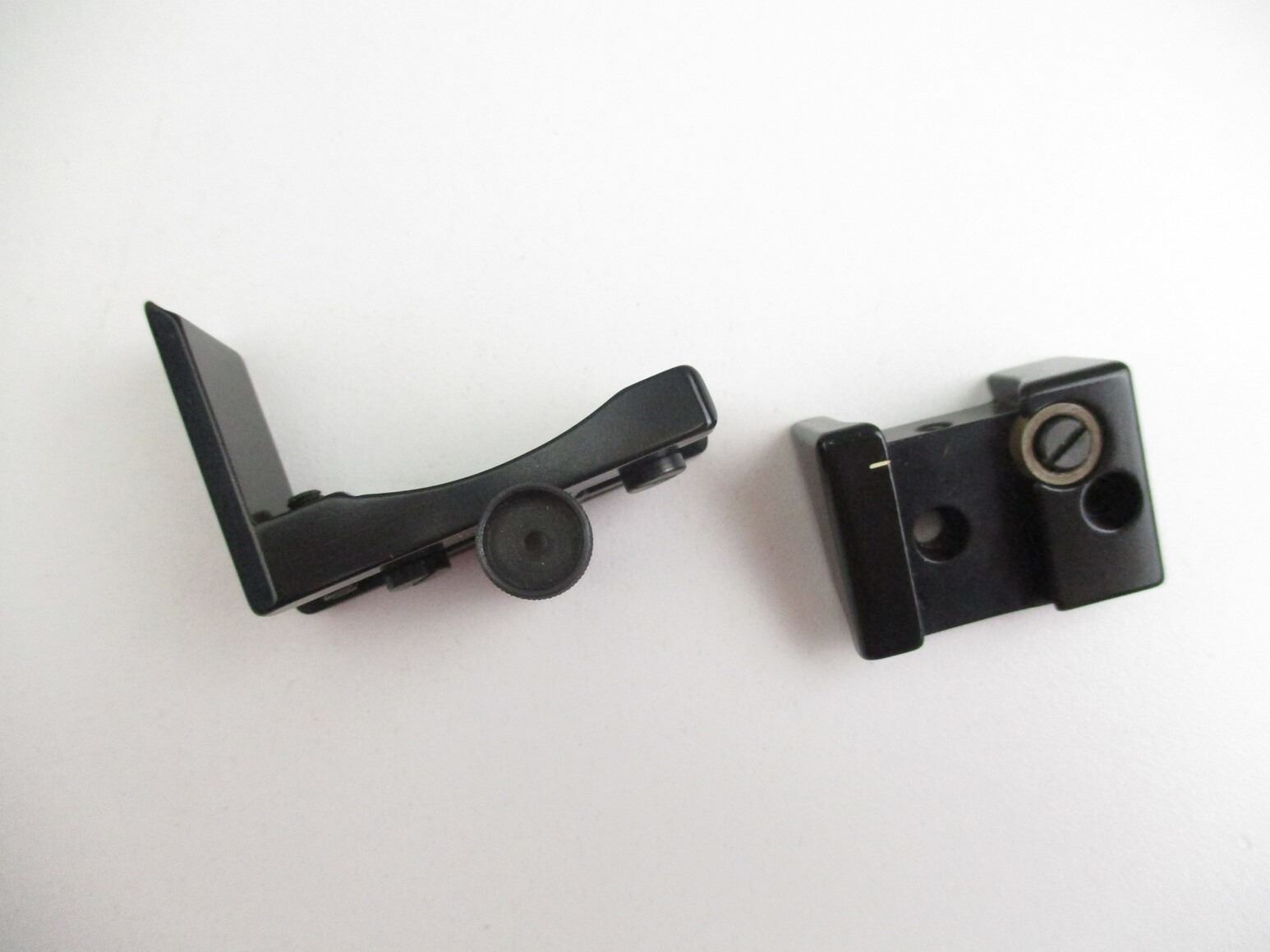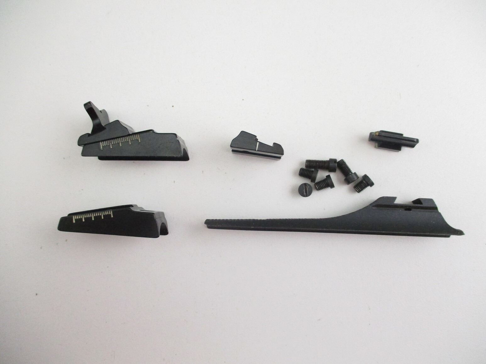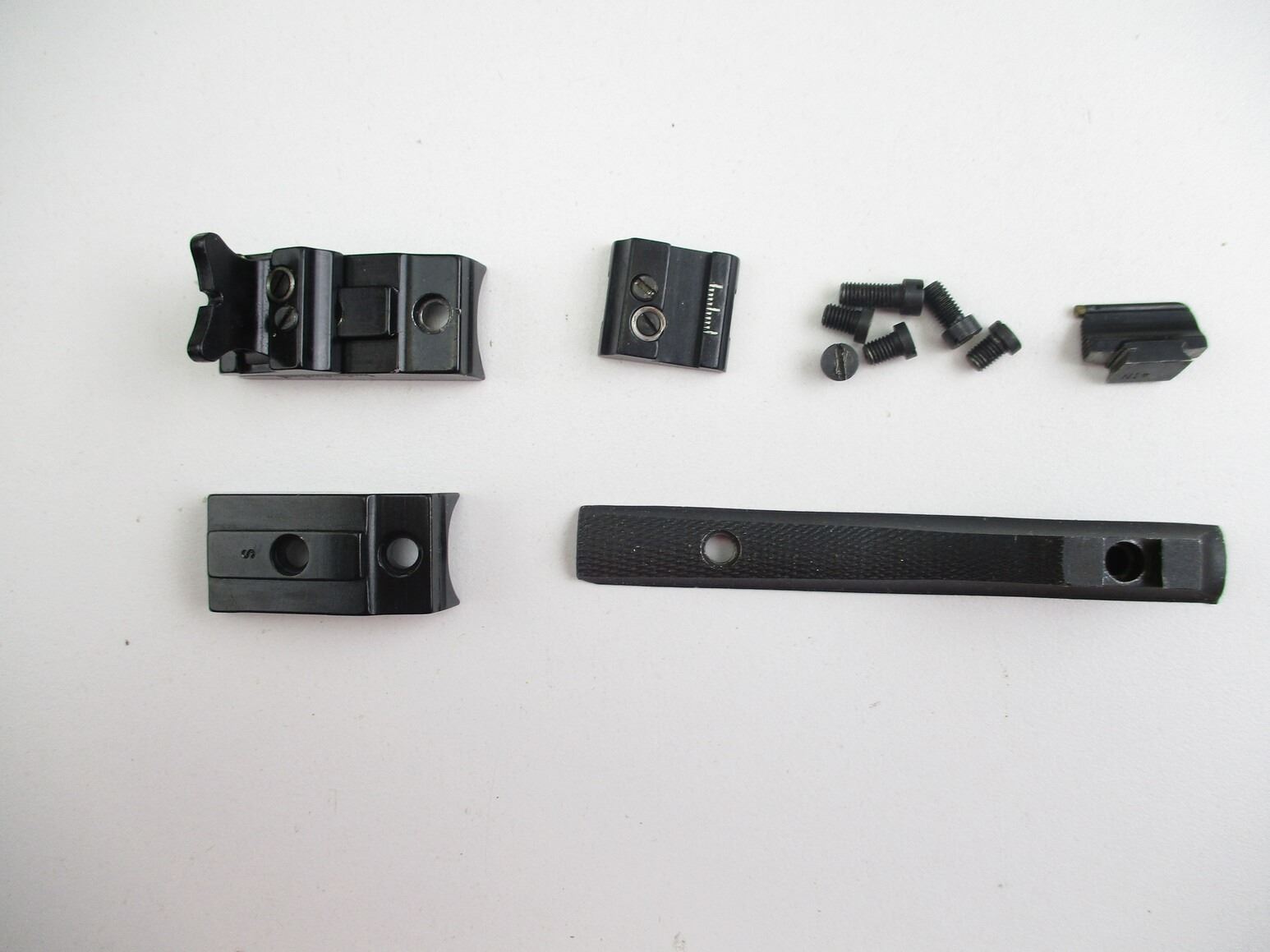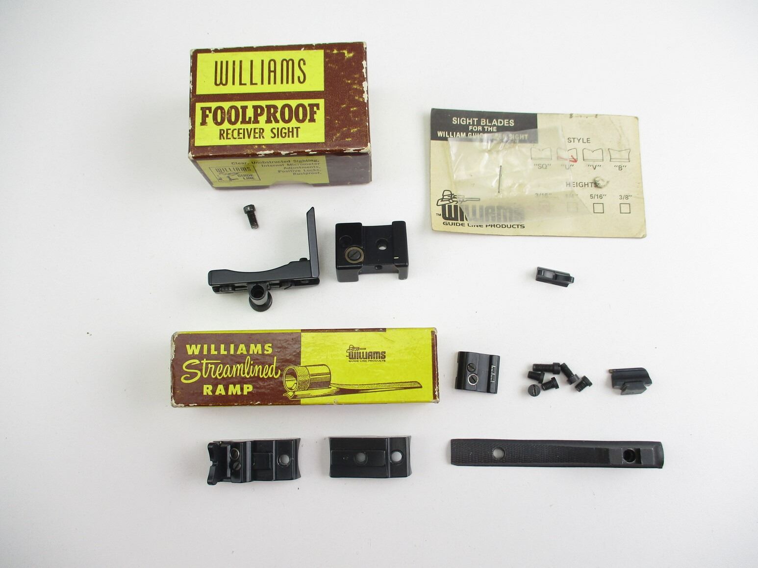 WILLIAMS FOOL PROOF RECEIVER PEEP SIGHT + FRONT RAMP , MODEL 70 RECEIVER PEEP SIGHT, MISSING 1 SCREW, WILLIAMS STREAMLINED FRONT RAMP & 2 REAR, APPROX. 2.120" HOLE SPACE RAMP, APPROX. .700" FOR REAR, INCLUDES REAR SIGHT BLADE FOR 1 REAR BASE, & FRONT SIGHT BLADE, WITH SCREWS. (1) UNKNOWN 1 FRONT RAMP. (1) 3/16" U STYLE SIGHT BLADE SEE PHOTO.