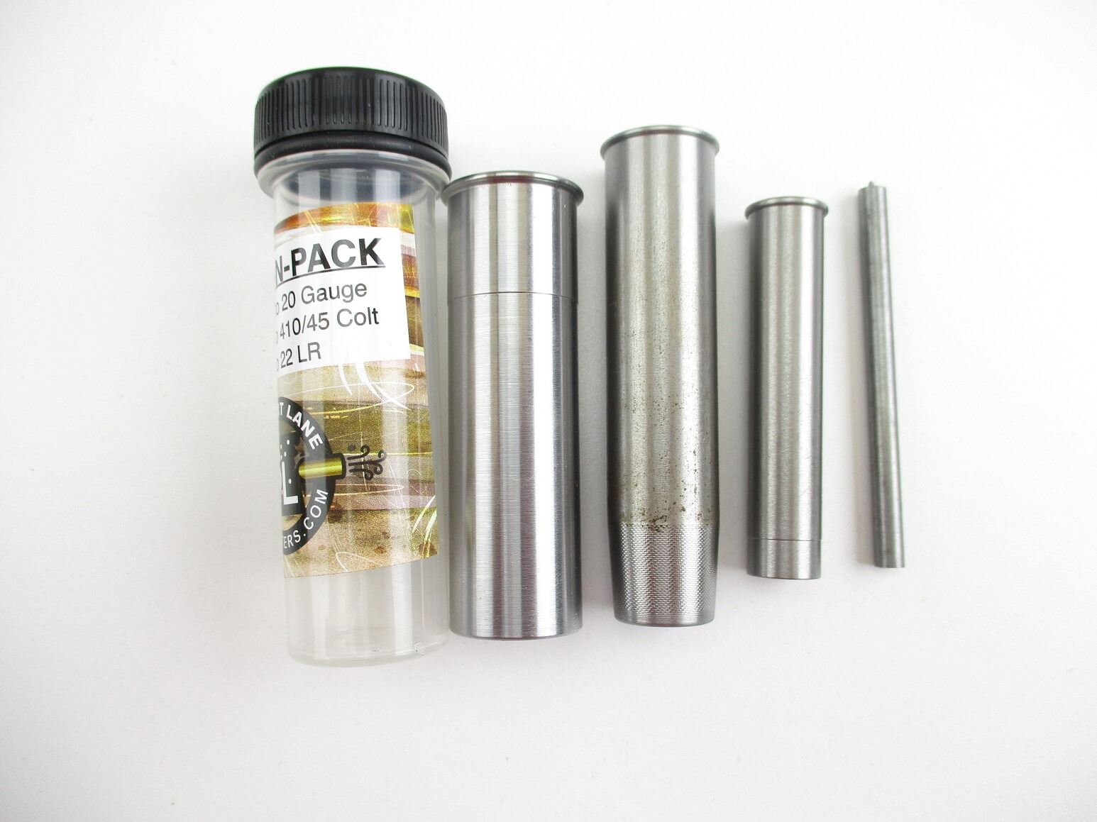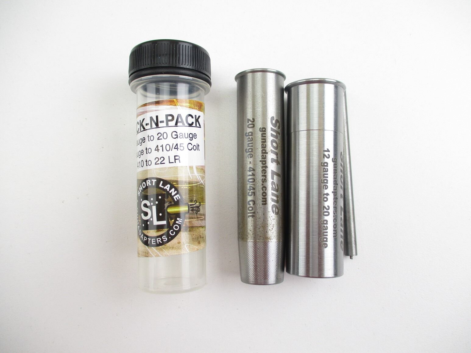 STACK-N-PACK SHOTGUN CHAMBER ADAPTERS , INCLUDES 12 GAUGE TO 20 GAUGE, 20 GAUGE TO .410 / 45 COLT, .410 TO .22LR. SEE PHOTO.