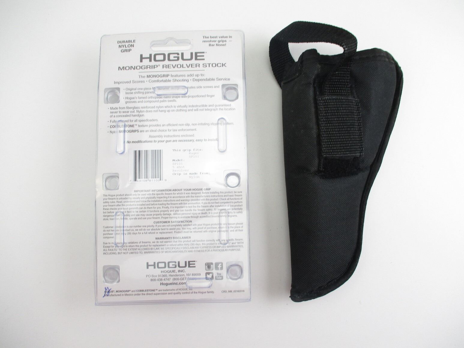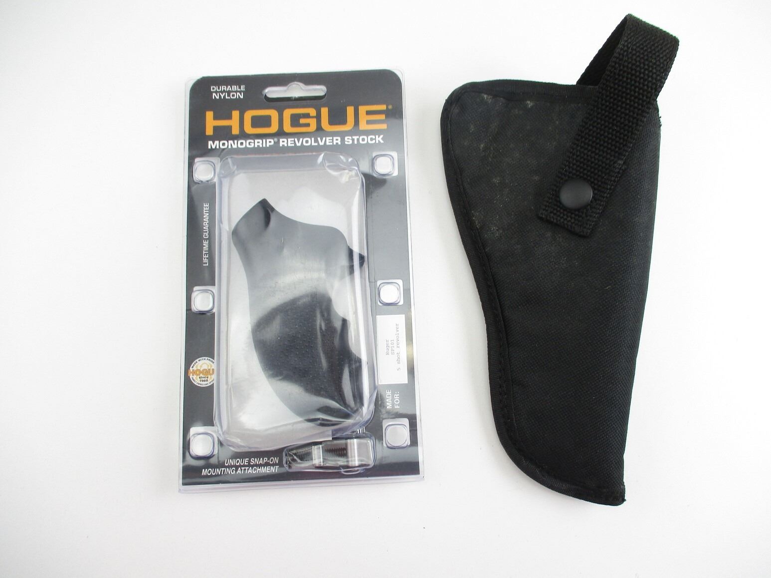 RUGER SP101 5 SHOT REVOLVER GRIP & NYLON HOLSTER , MONO GRIP, HARD RUBBER, MFG'D BY HOGUE, INCLUDES MOUNTING HARDWARE, IN ORIGINAL PACKAGE, (1) NYLON REVOLVER STYLE HOLSTER, APPROX. 7".
