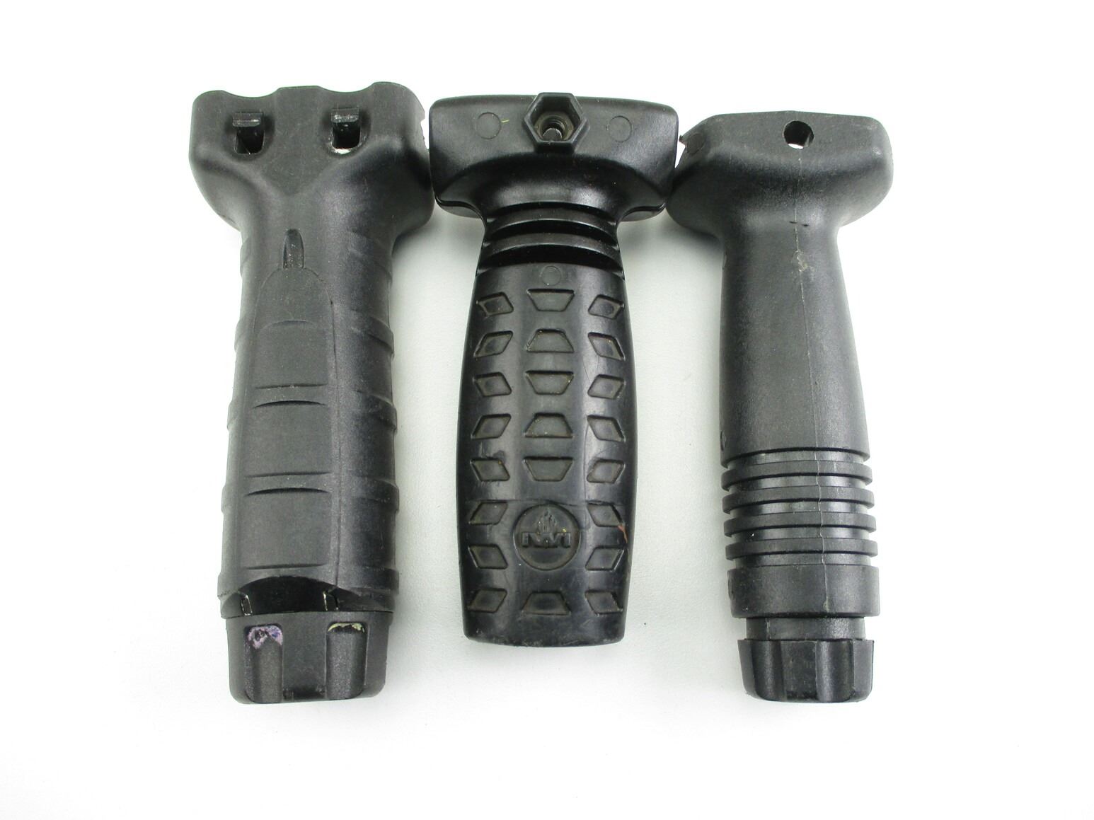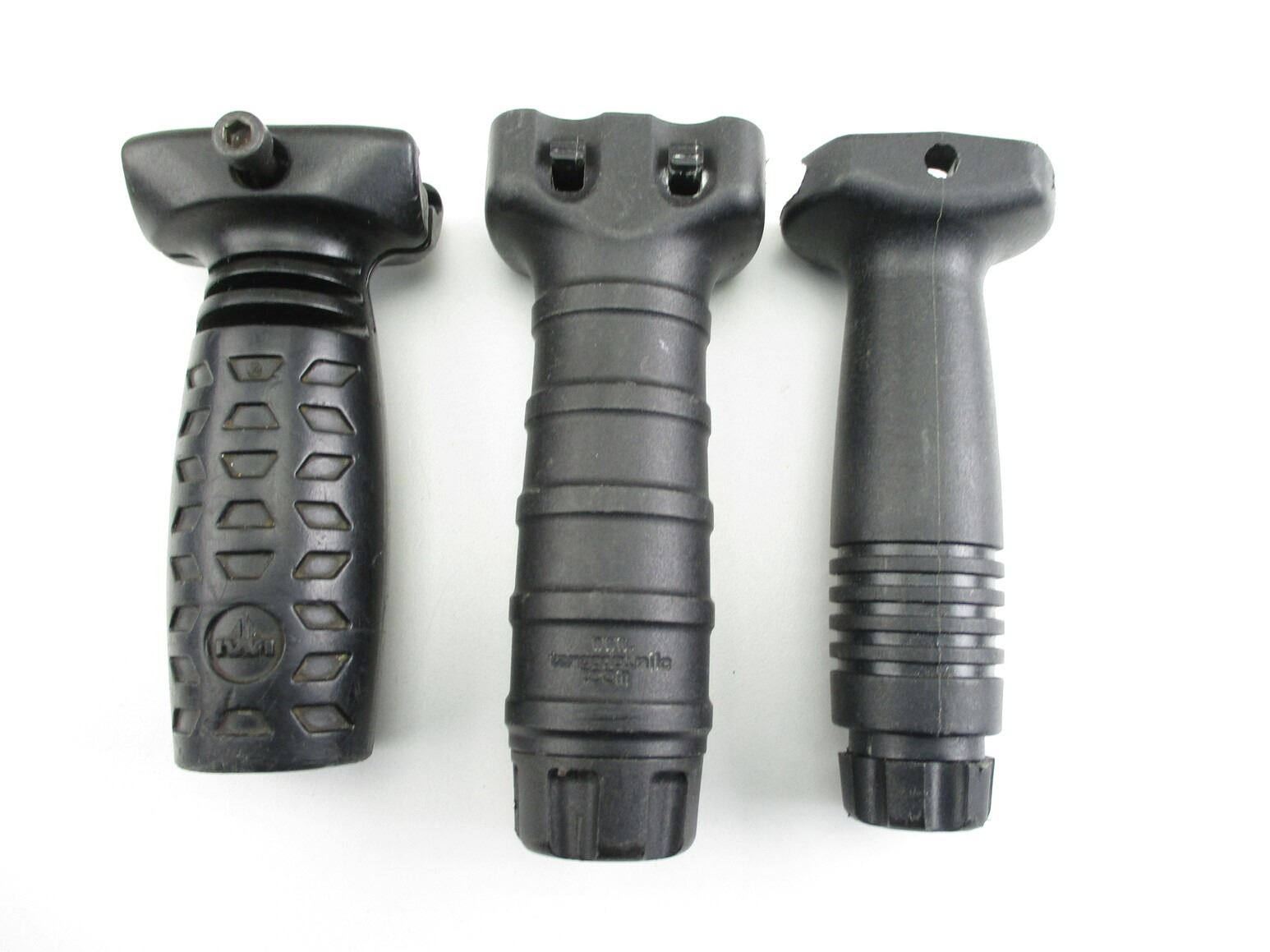 ASSORTED POLYMER VERTICAL GRIPS , INCLUDES: (1) SCARCE IWI X95 GRIP, (1) "TANGO DOWN" GRIP, (1) GENERIC GRIP. GRIPS FIT PICATINNY RAILS.