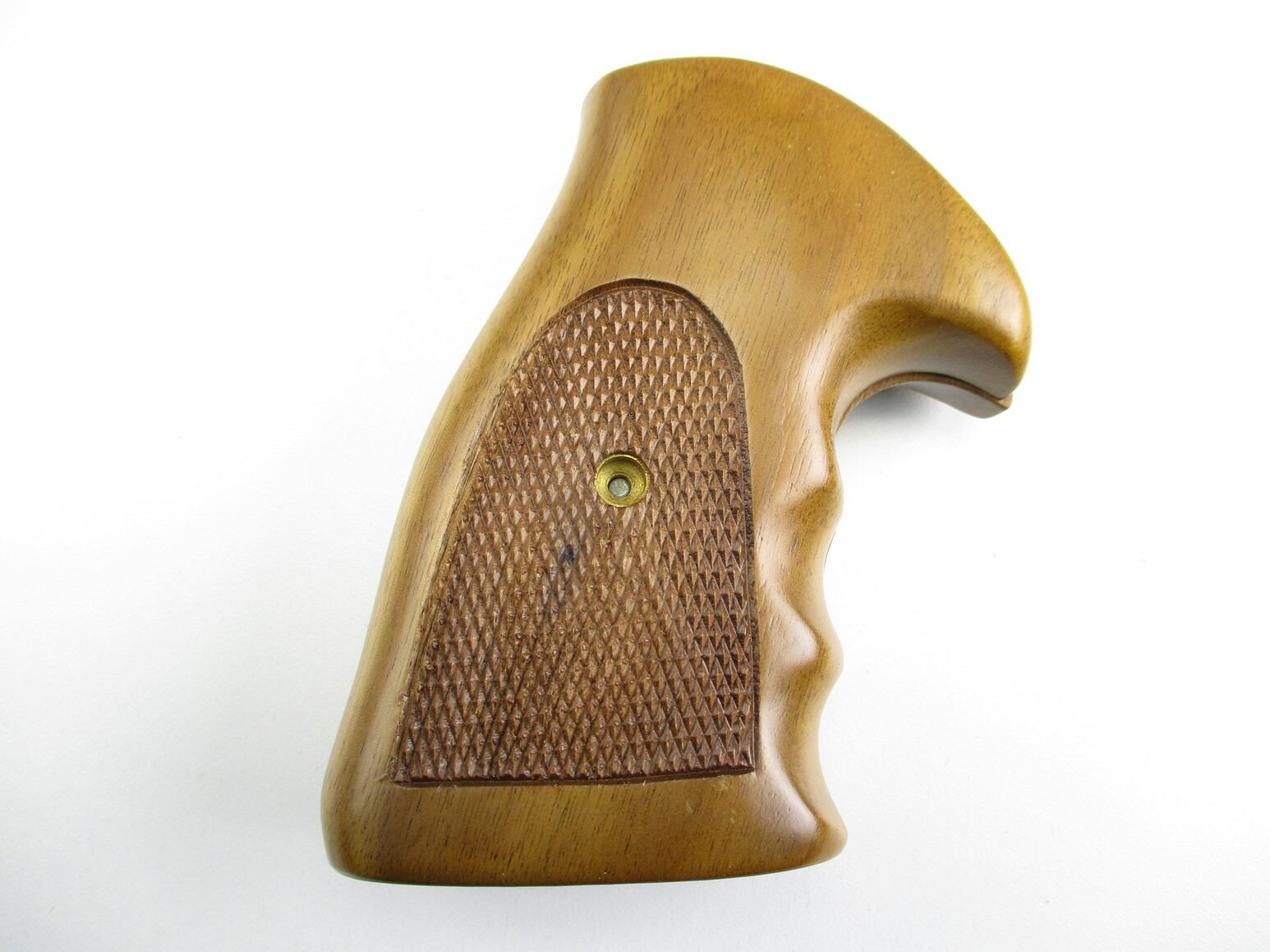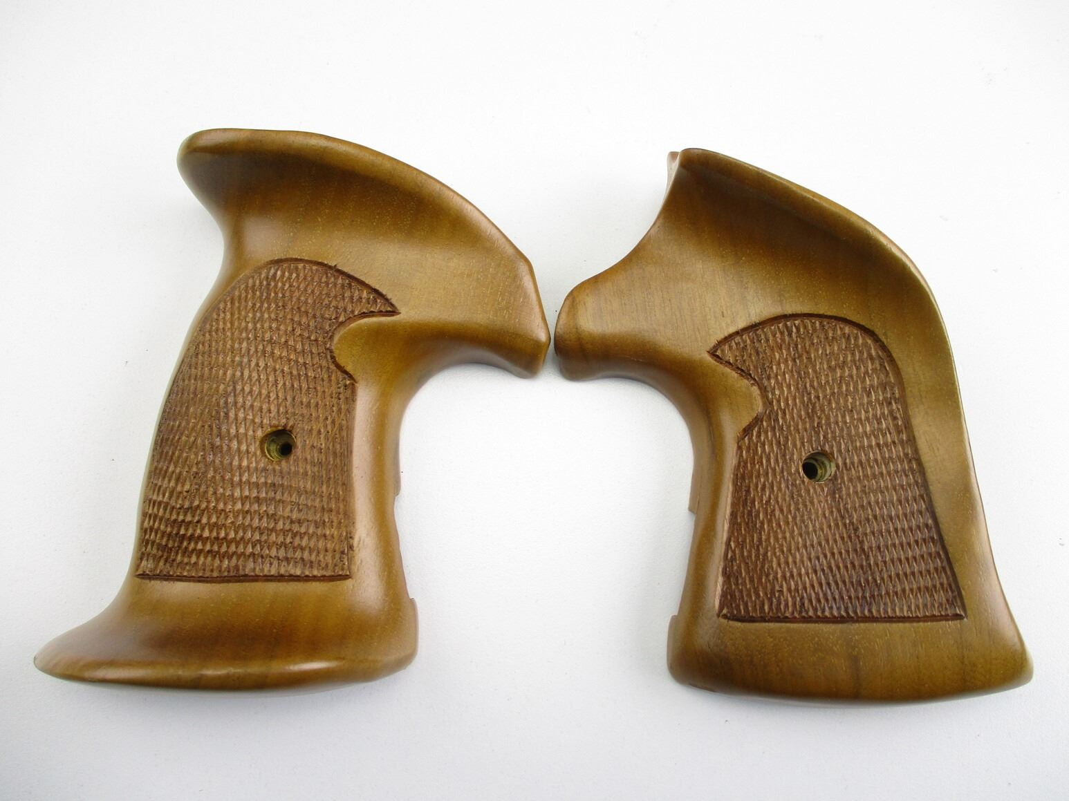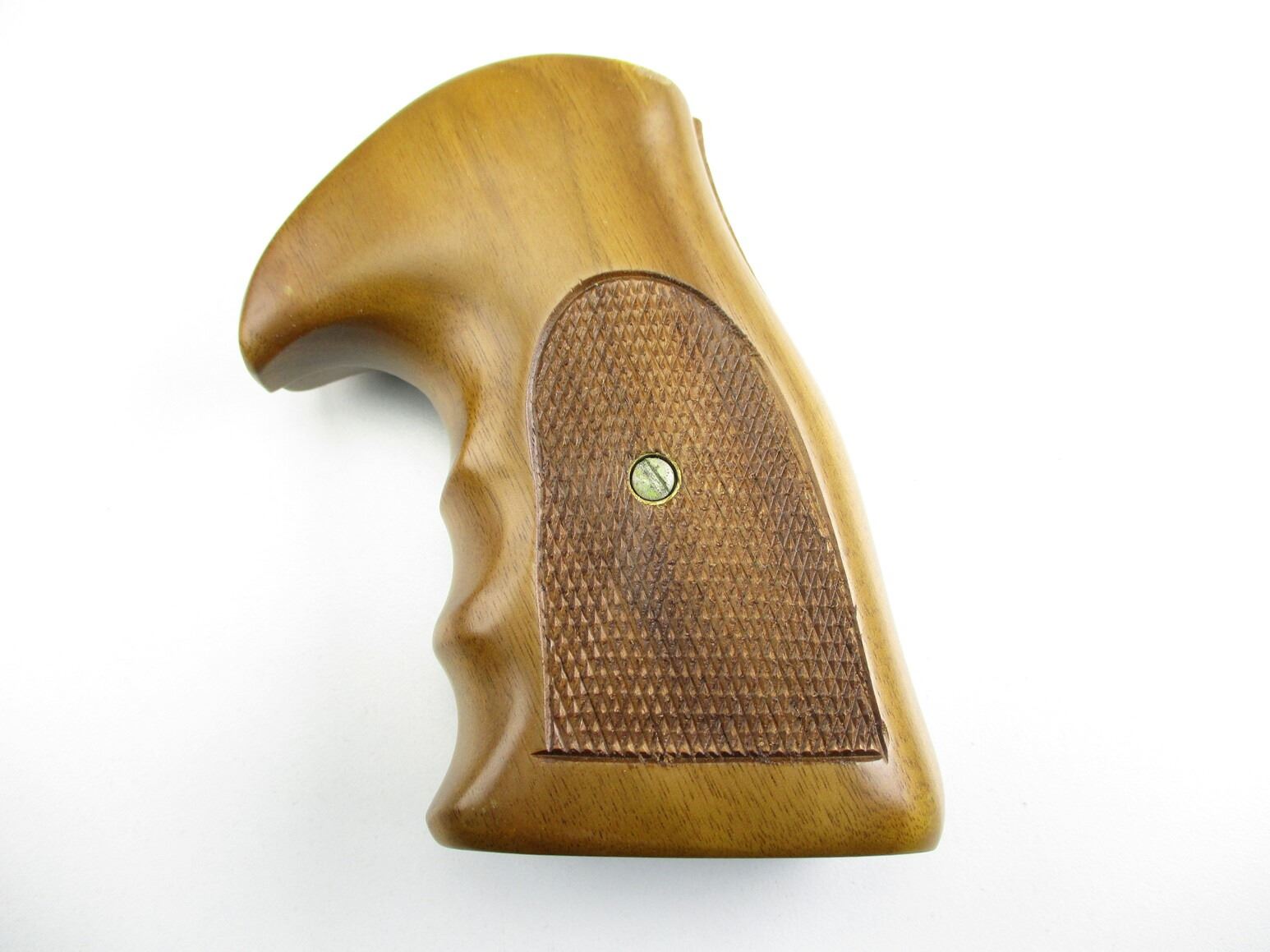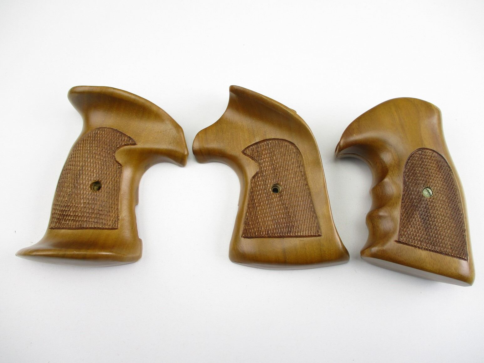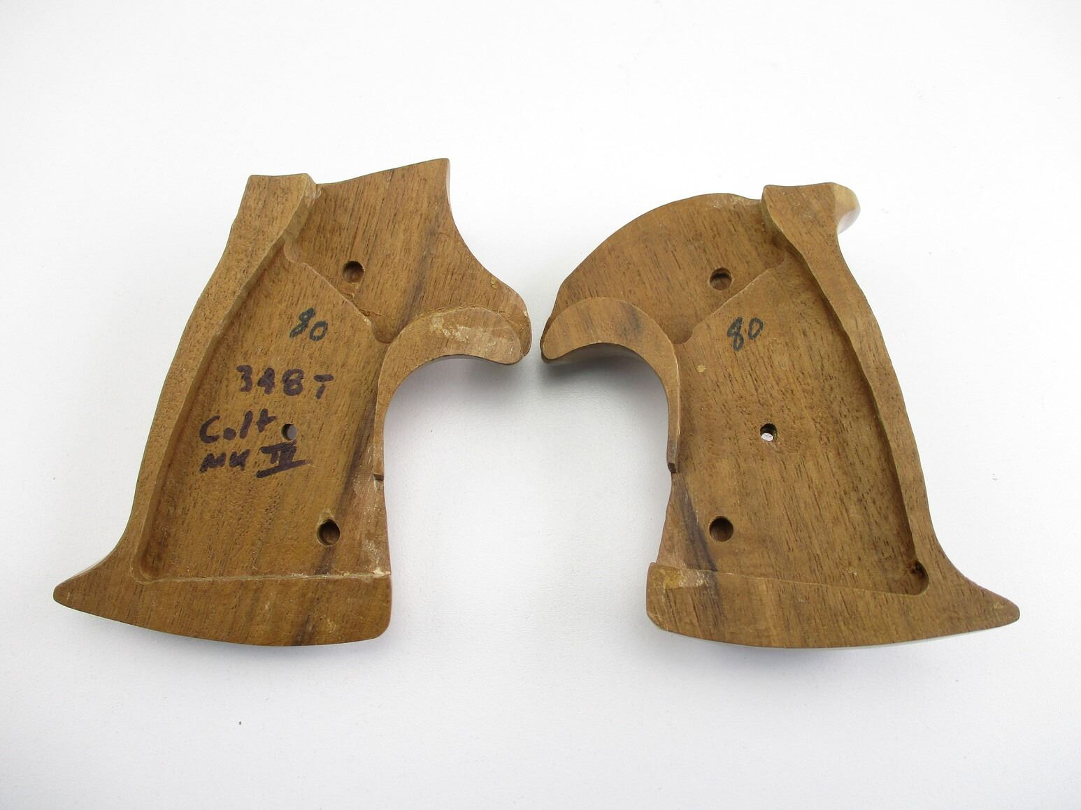 COLT REVOLVER TARGET GRIPS , LARGE FRAME, (1) GRIP WITH THUMB REST, RIGHT HANDED, WOOD, CHECKERED, (1) FINGER GROOVED, WOOD, CHECKERED, WITH MOUNTING SCREW.