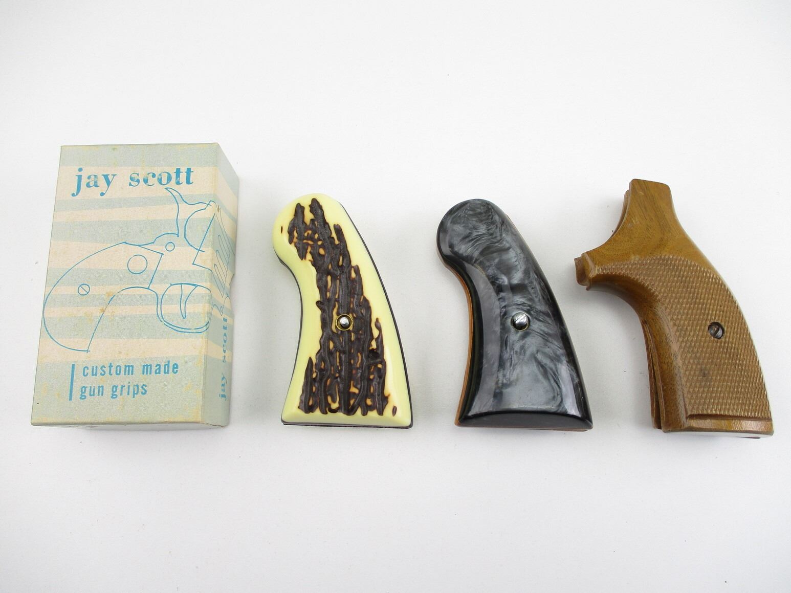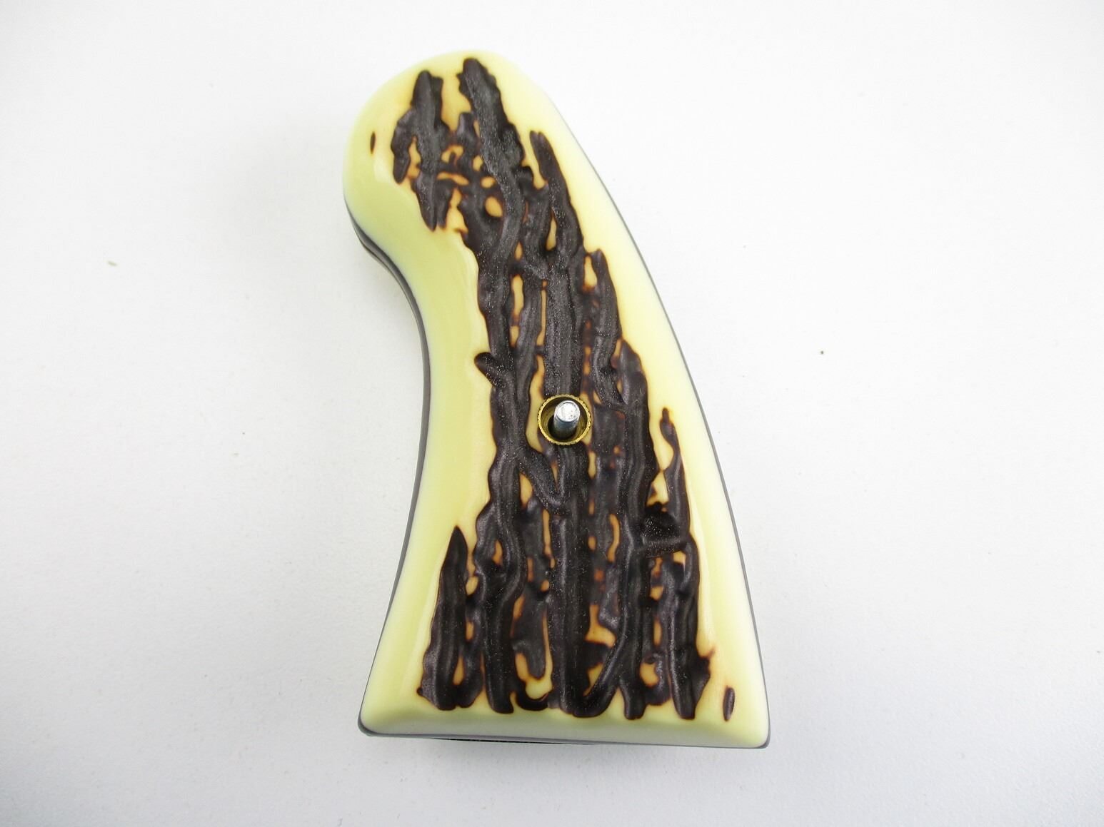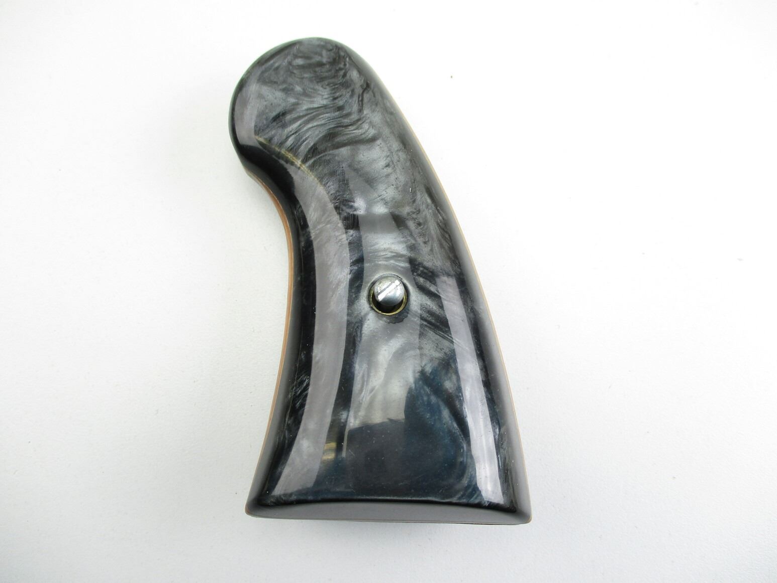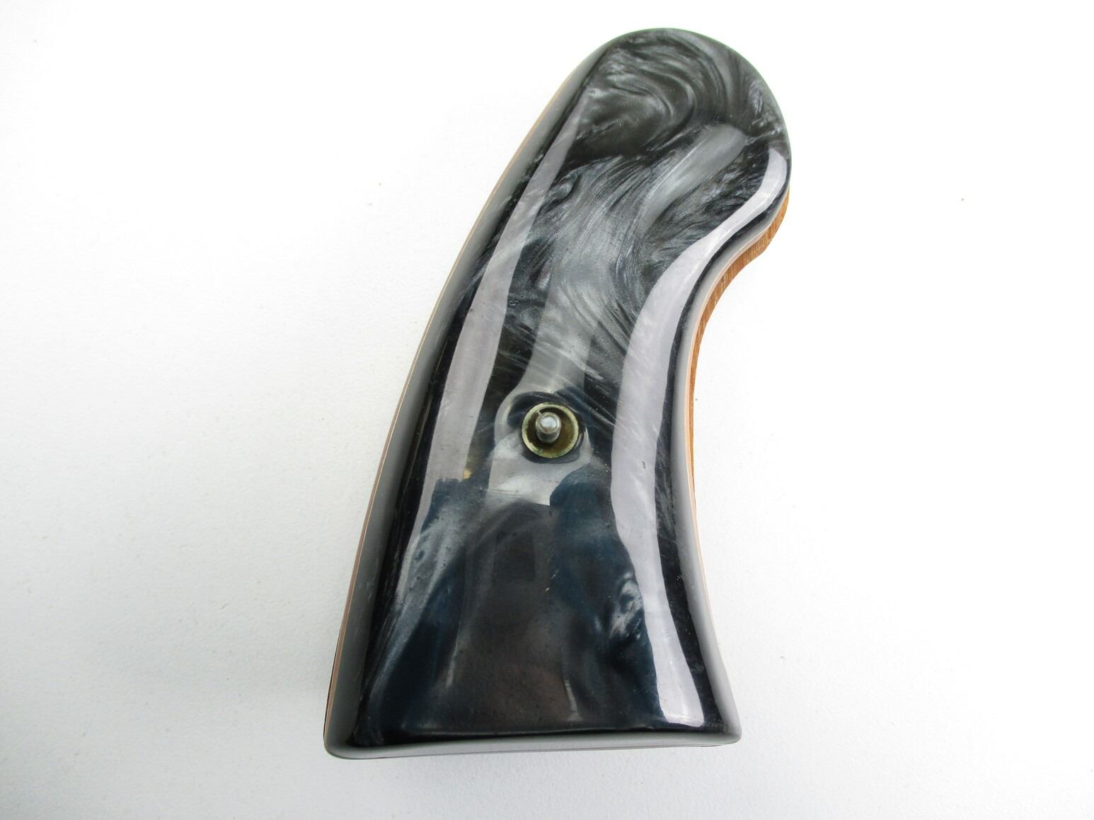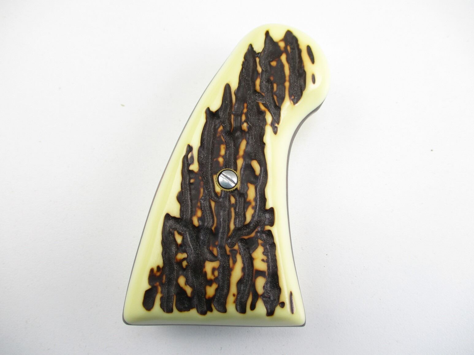 COLT NEW SERVICE REVOLVER GRIPS , (1) PAIR OF BLACK PEARL GRIPS, WITH MOUNTING SCREW, (1) PAIR OF STAG GRIPS WITH MOUNTING SCREW. (1) PAIR OF UNKNOWN REVOLVER GRIPS, WOODEN, CHECKERED.
