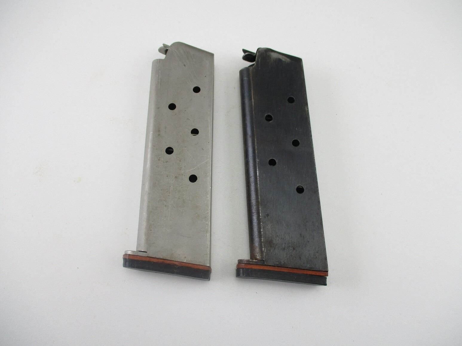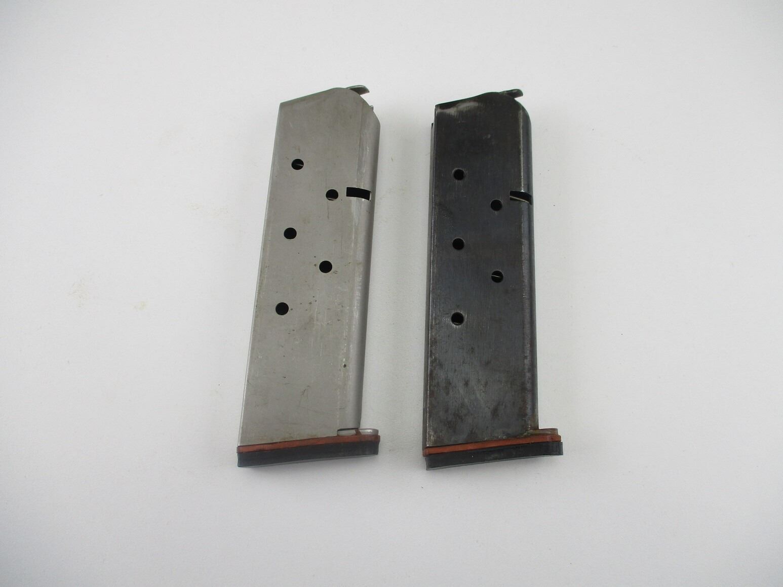 1911 .45 ACP PISTOL MAGAZINES , LOT OF 2. .45 ACP, 7 ROUND, STAINLESS STEEL & BLUED STEEL, PLASTIC BUMPERS.