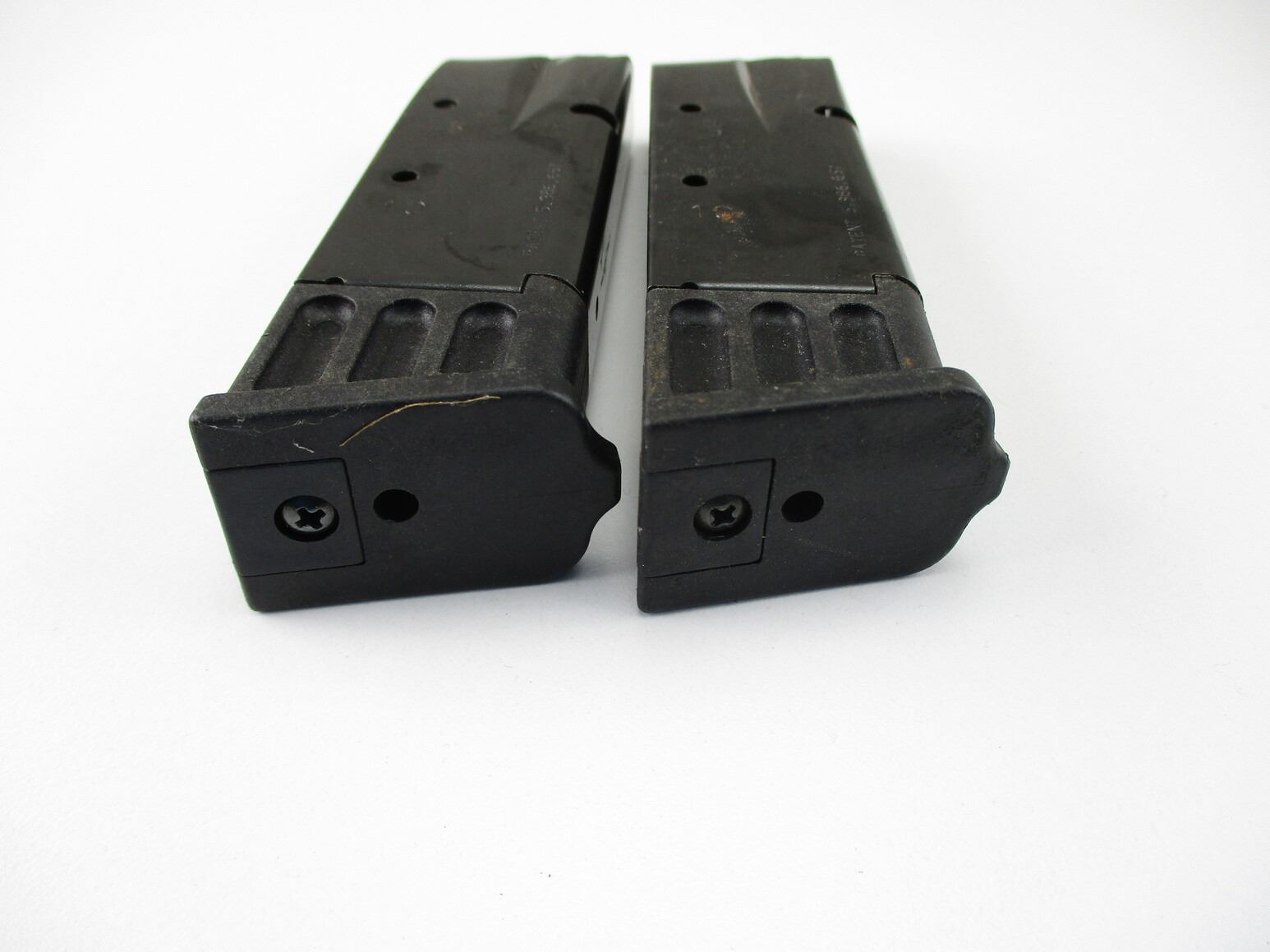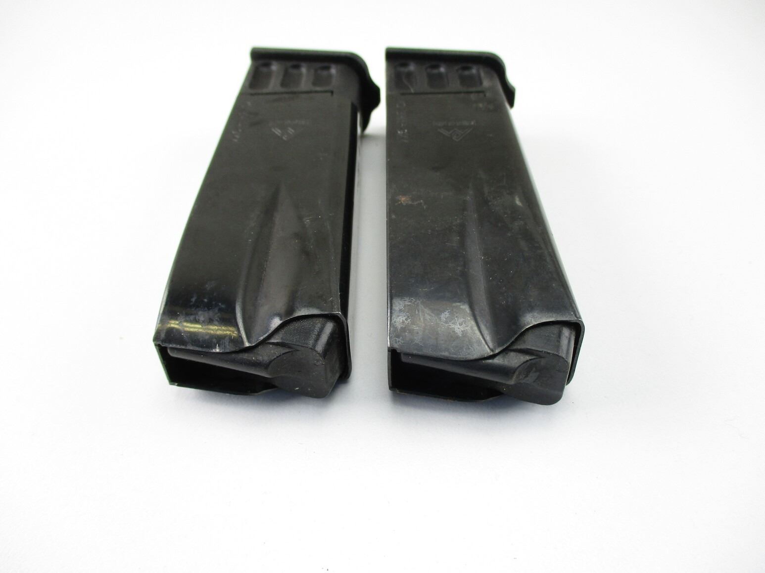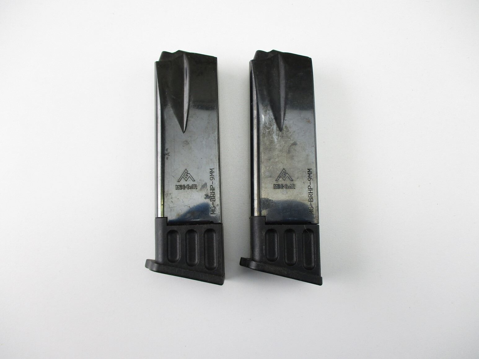 BROWNING HI-POWER PISTOL MAGAZINES , LOT OF 2. 9MM, 10 ROUND MAGS, BLUED STEEL, WITH POLYMER FOLLOWERS & BASES, MFG'D BY MEC-GAR, MISSING MAG EJECTOR SPRINGS.