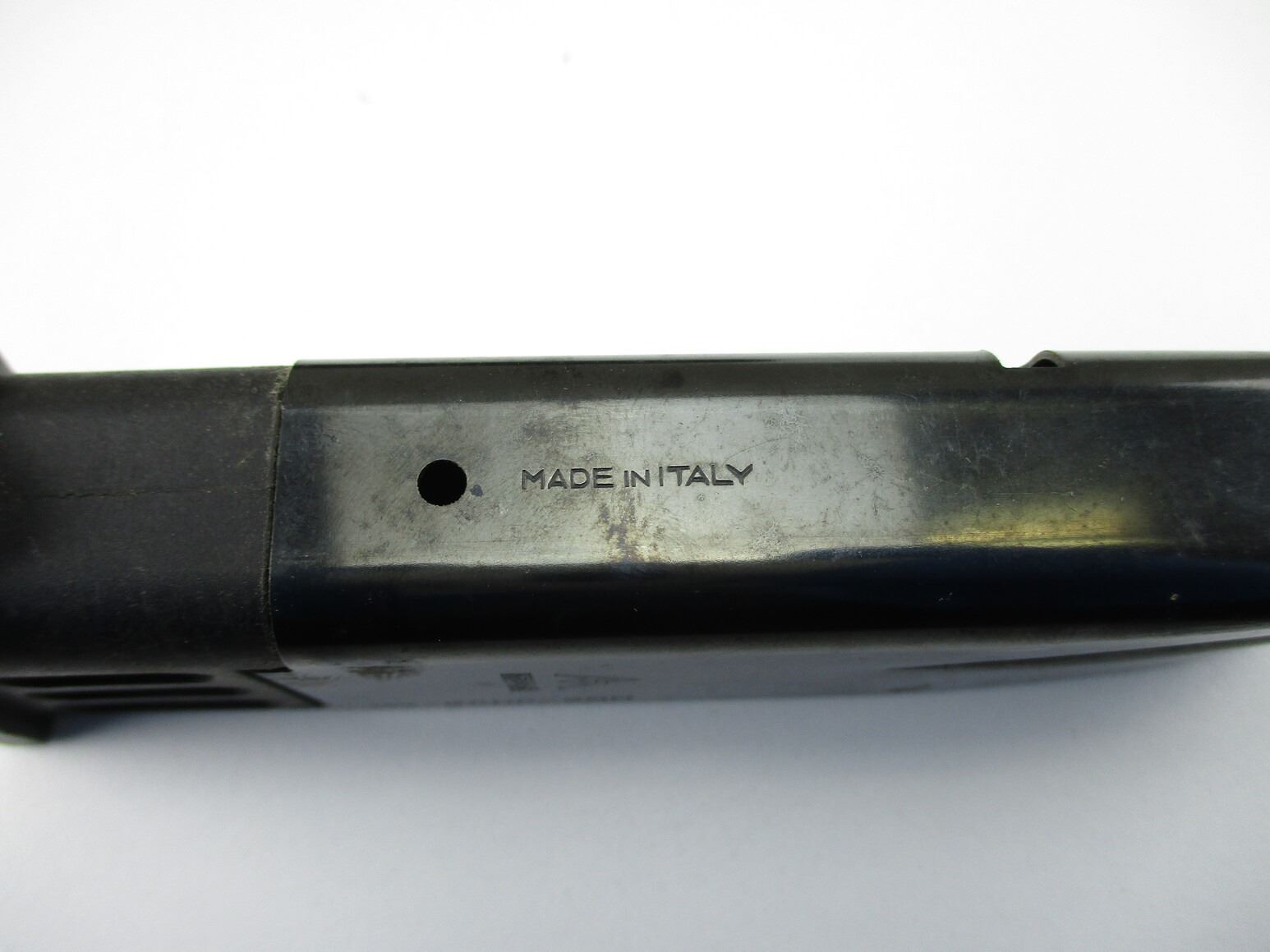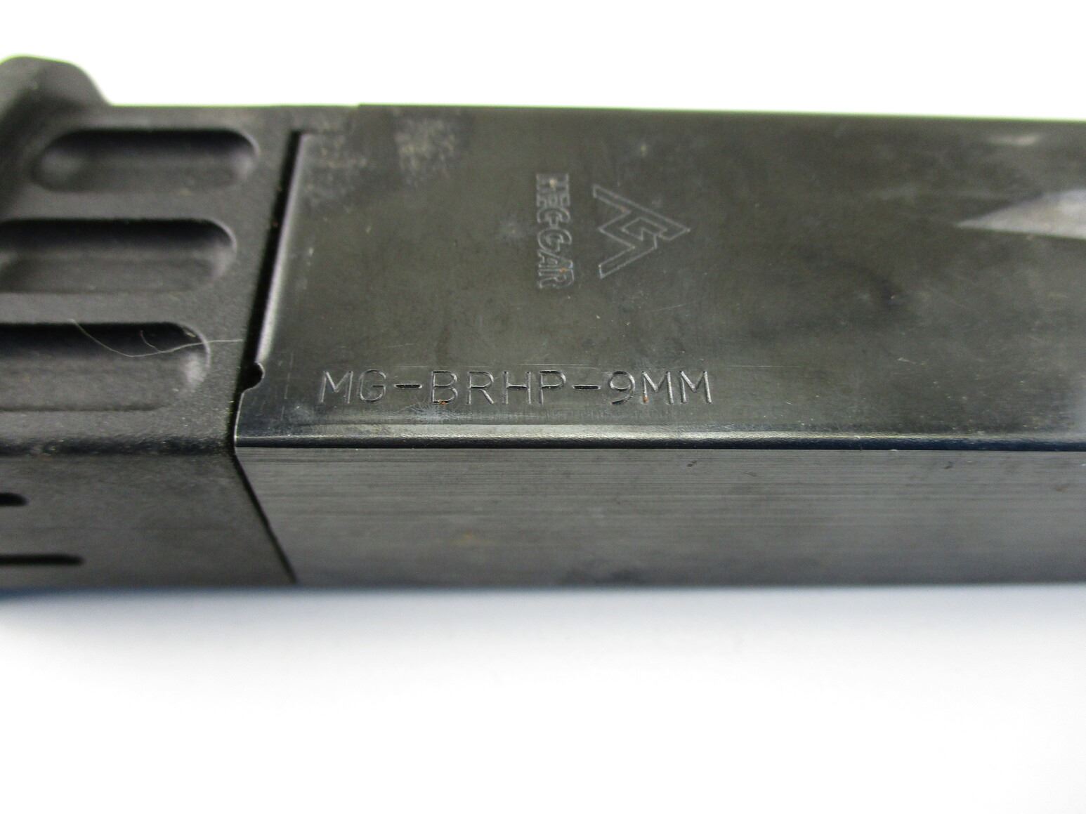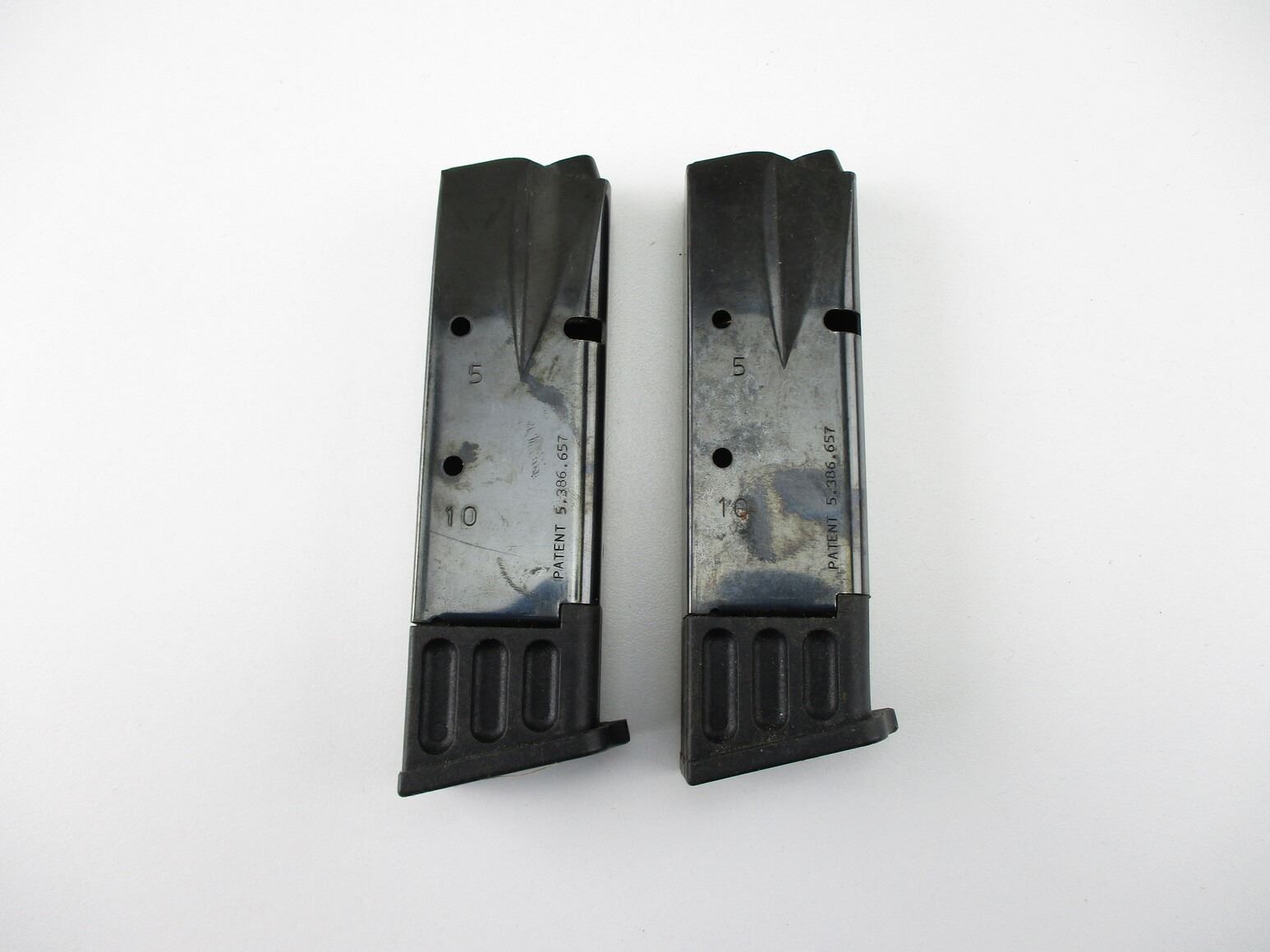 BROWNING HI-POWER PISTOL MAGAZINES , LOT OF 2. 9MM, 10 ROUND MAGS, BLUED STEEL, WITH POLYMER FOLLOWERS & BASES, MFG'D BY MEC-GAR, MISSING MAG EJECTOR SPRINGS.