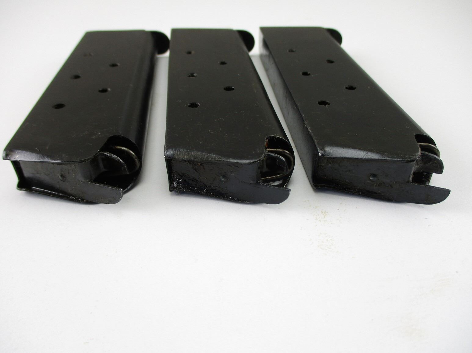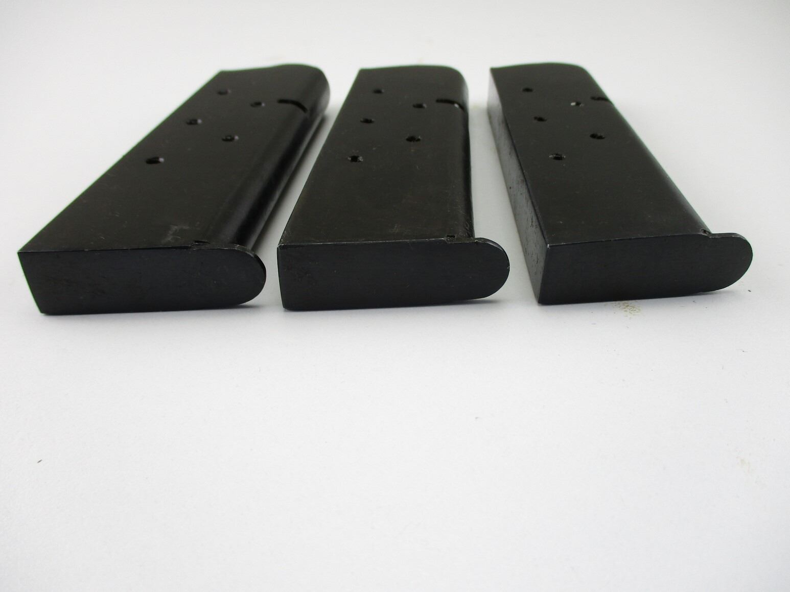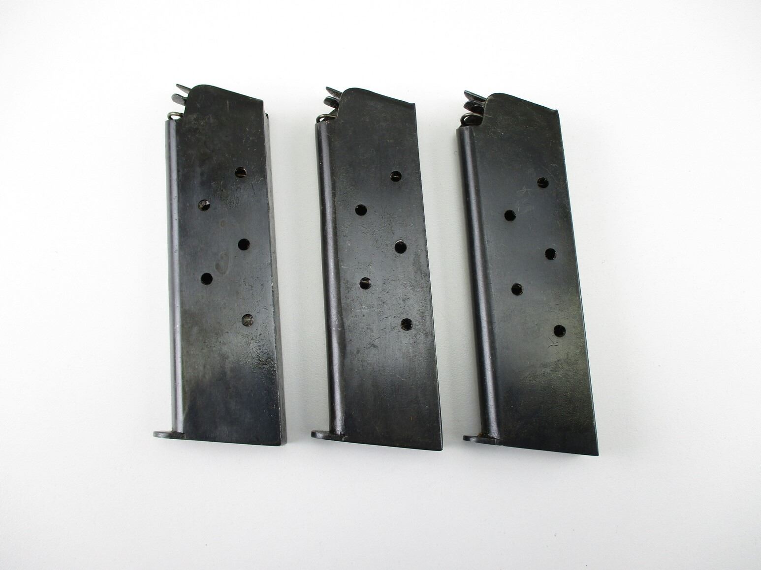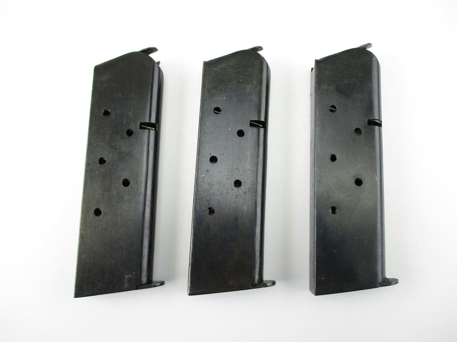 1911 .45 ACP PISTOL MAGAZINES , LOT OF 3. .45 ACP, 7 ROUND MAGS, BLUED, APPEARS NOS, THIN COAT OF STORAGE GREASE ON MAGS, STEEL, UNMARKED, POSSIBLY CHINESE MADE.