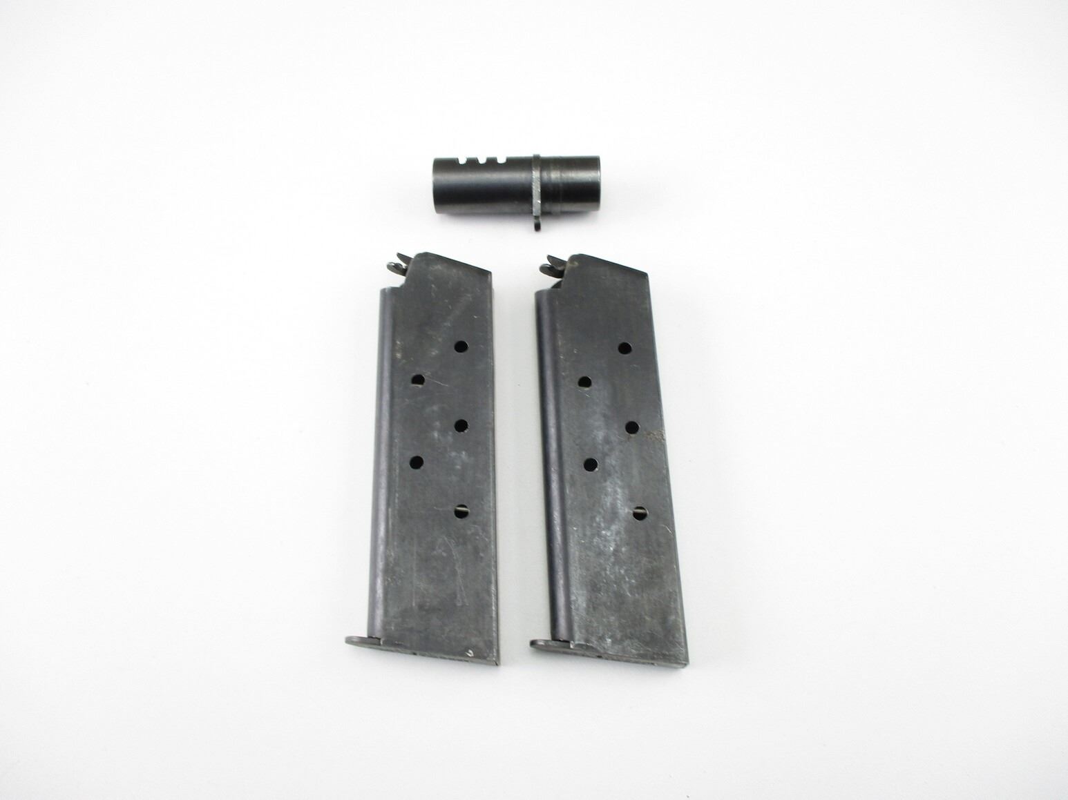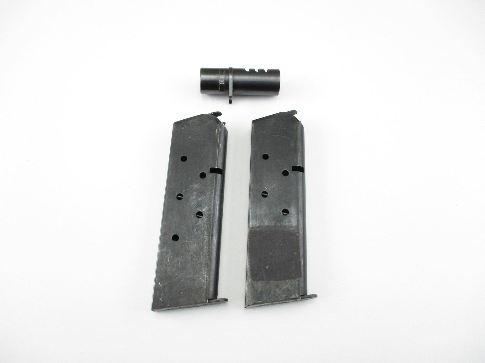 1911 .45 ACP PISTOL MAGAZINES ETC, (2) .45 ACP, 7 ROUND MAGS, BLUED STEEL, DRILLED HOLES ON BASES. (1) BARREL LUG WITH 3 PORT BARREL EXTENSION.