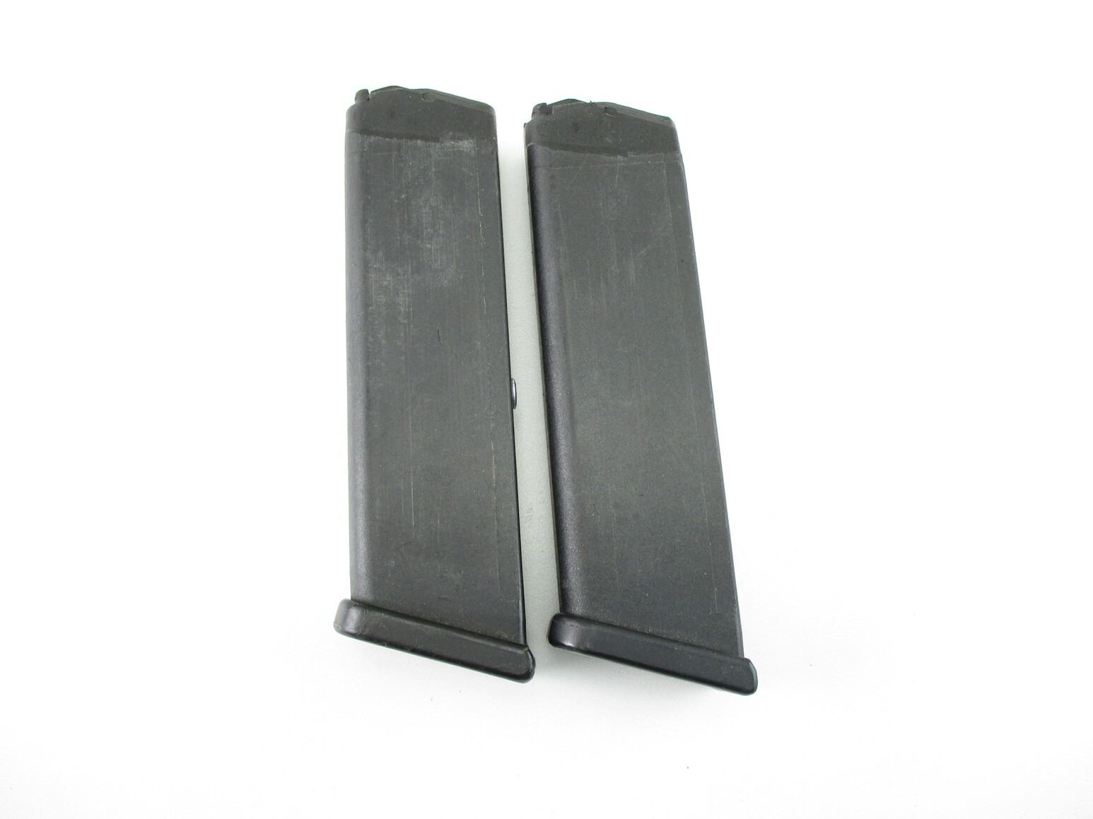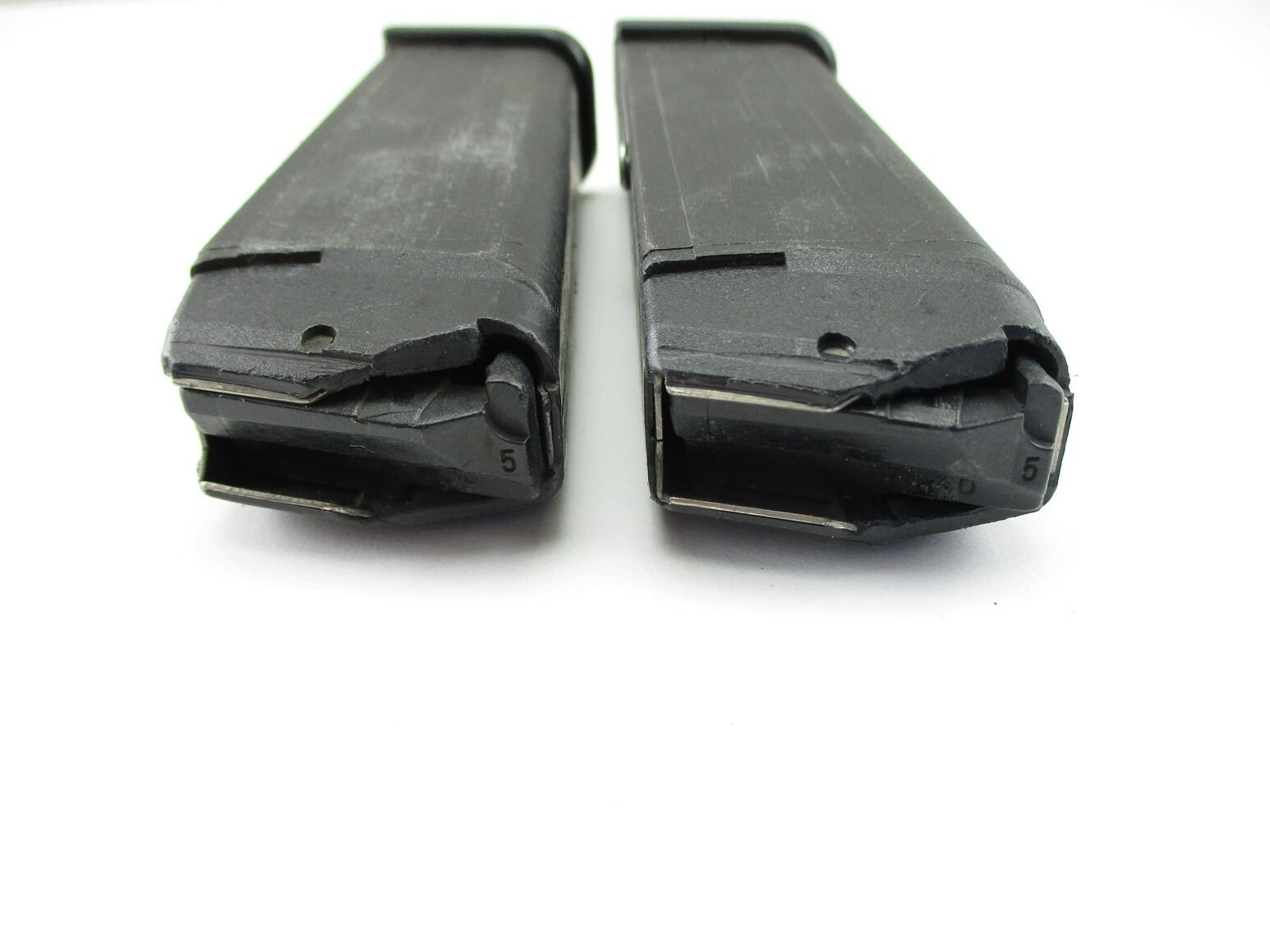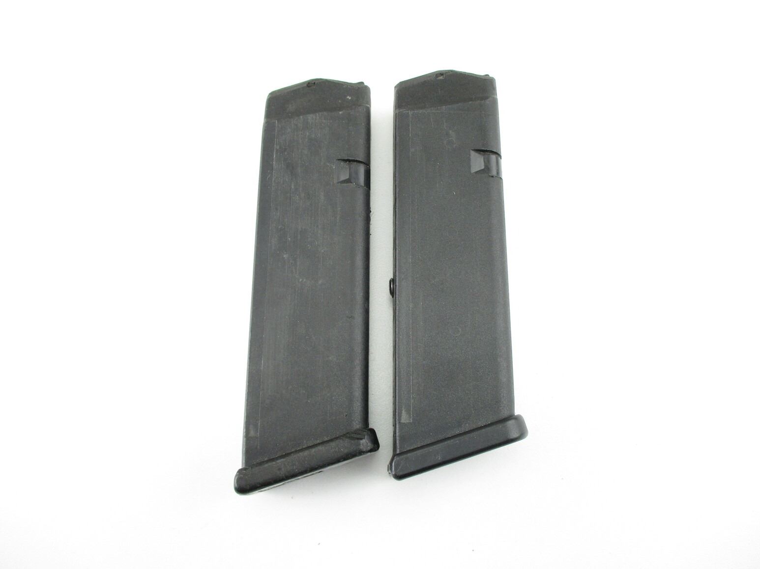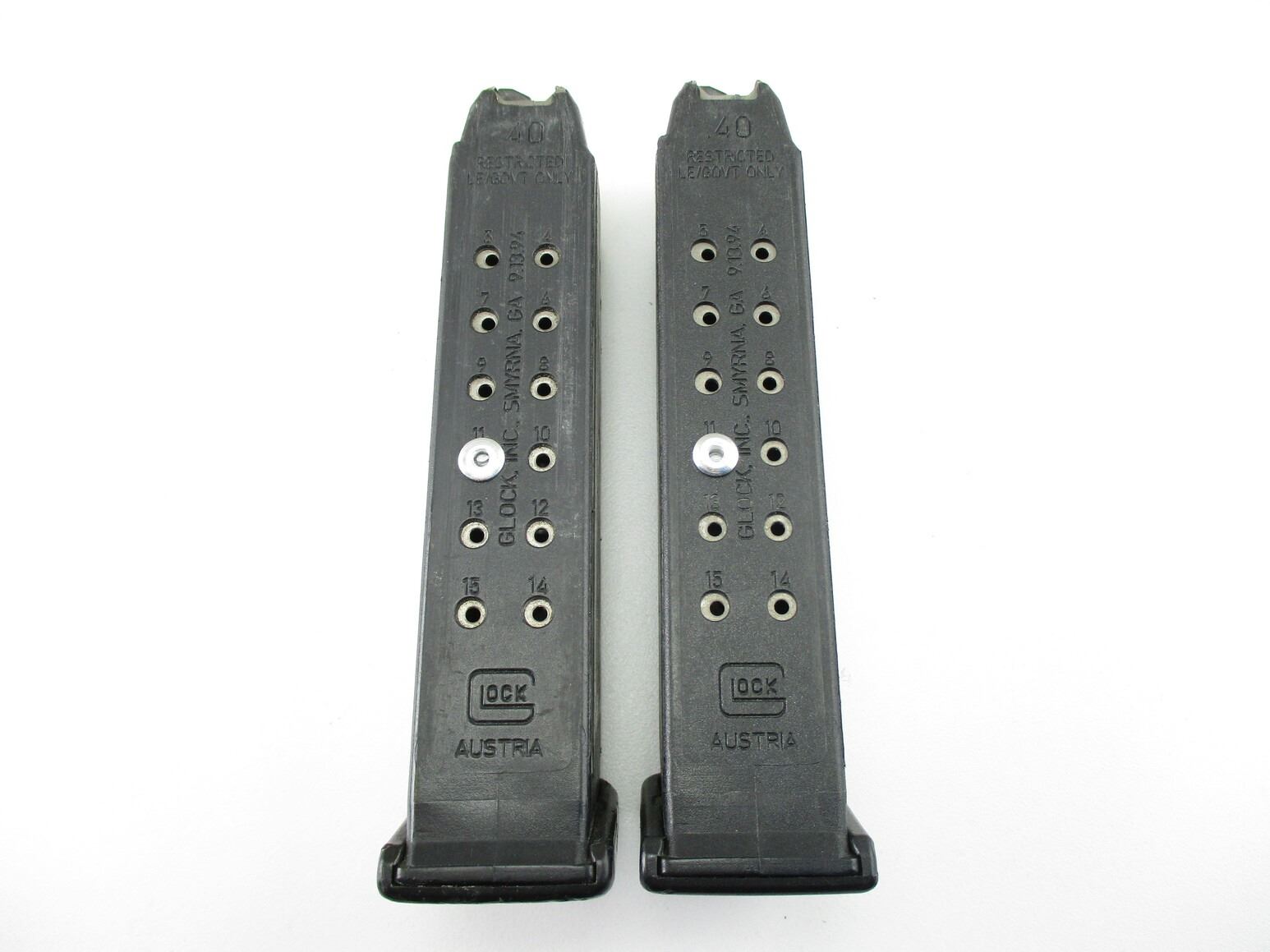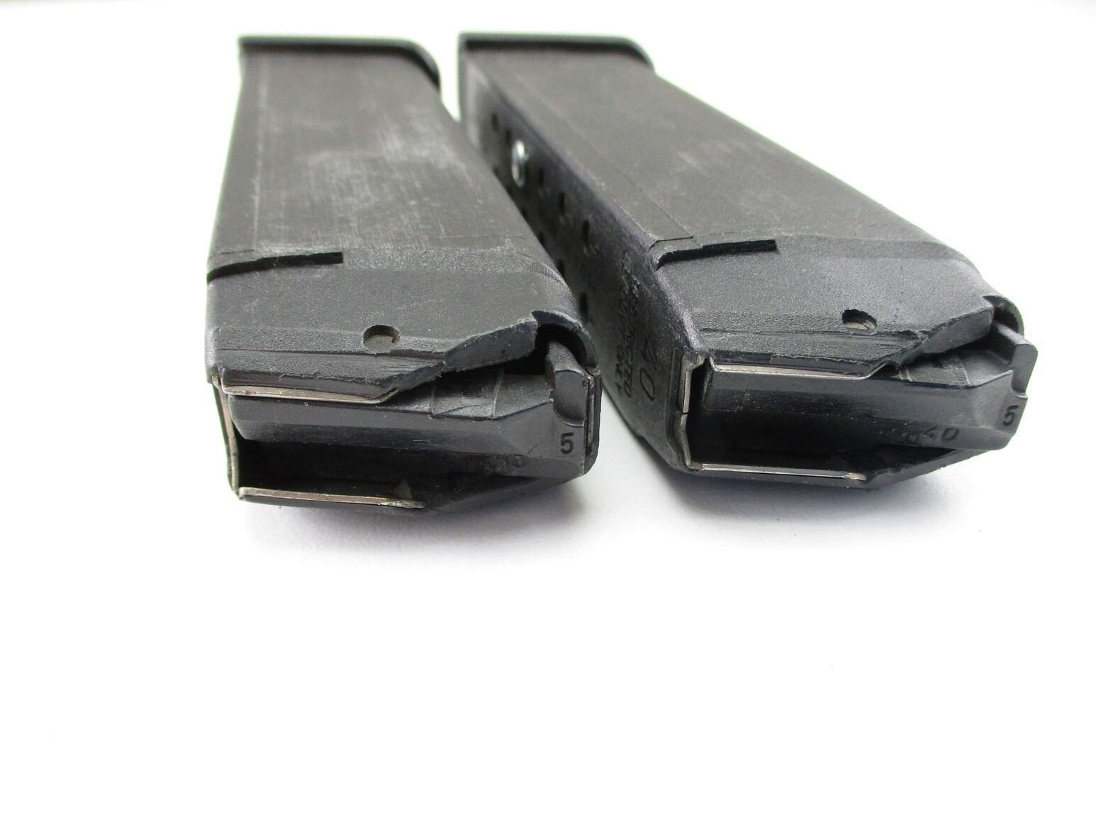 GLOCK 22 PISTOL MAGAZINES , LOT OF 2. .40 S&W 10/15 ROUND PINNED MAGS, POLYMER FOLLOWERS, MAG CATCH ON RIGHT SIDE OF MAG.