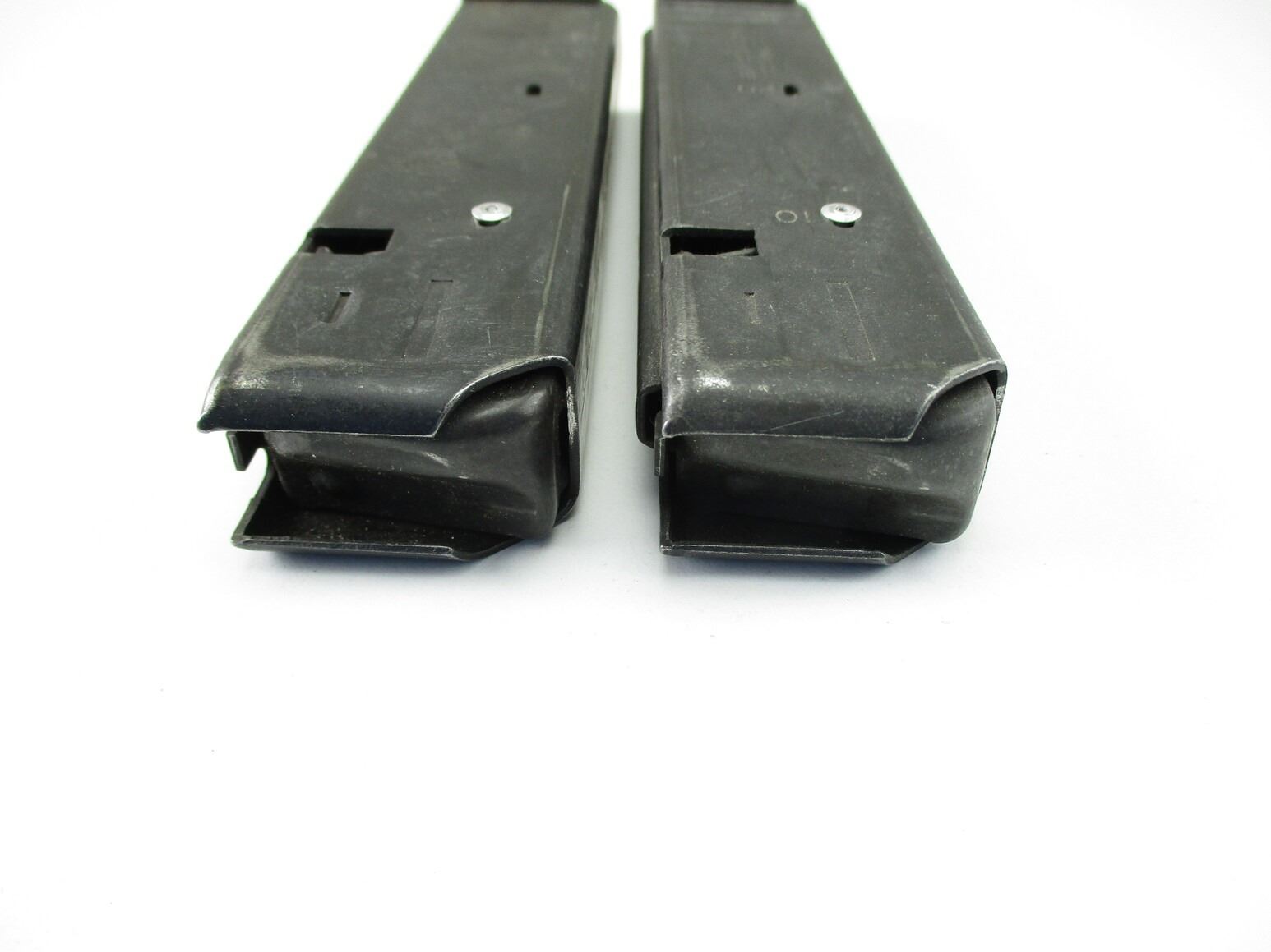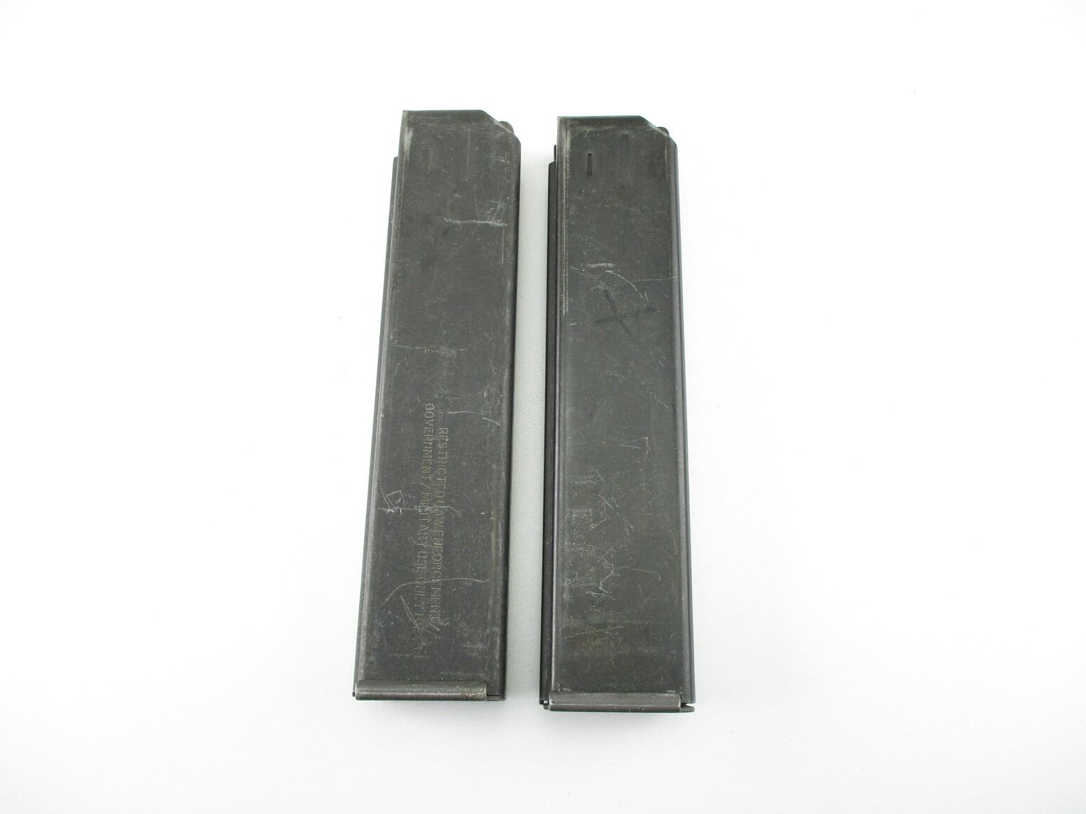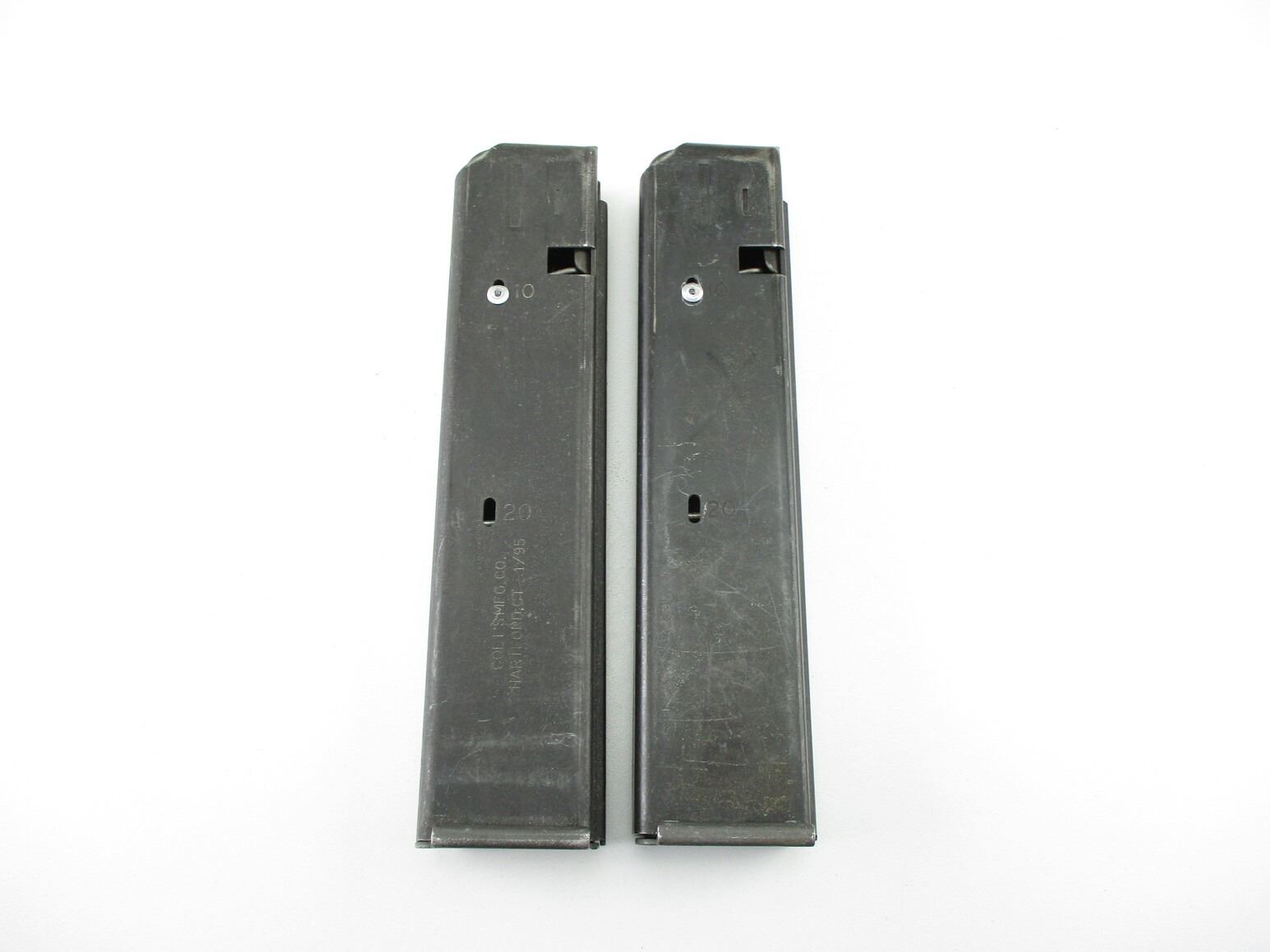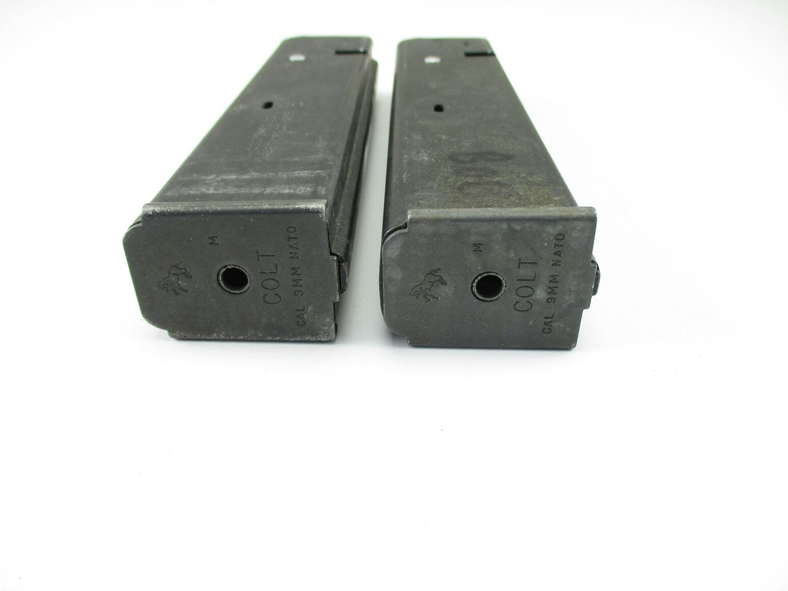 COLT AR-15 9MM PISTOL MAGAZINES , LOT OF 2. 9MM, 5/20 ROUND PINNED MAGS, BLUED STEEL, COLT MARKED ON BASES.
