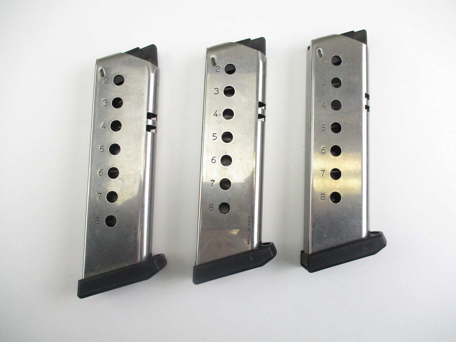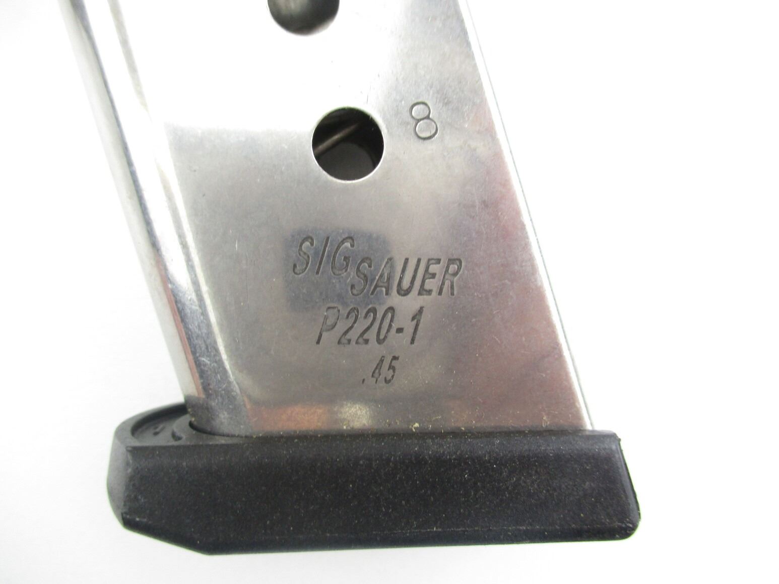 SIG SAUER P220-1 .45 ACP PISTOL MAGAZINES , LOT OF 2. .45 ACP, 8 ROUND MAGS, STAINLESS STEEL, WITH POLYMER FOLLOWERS & BASES. MADE IN ITALY.