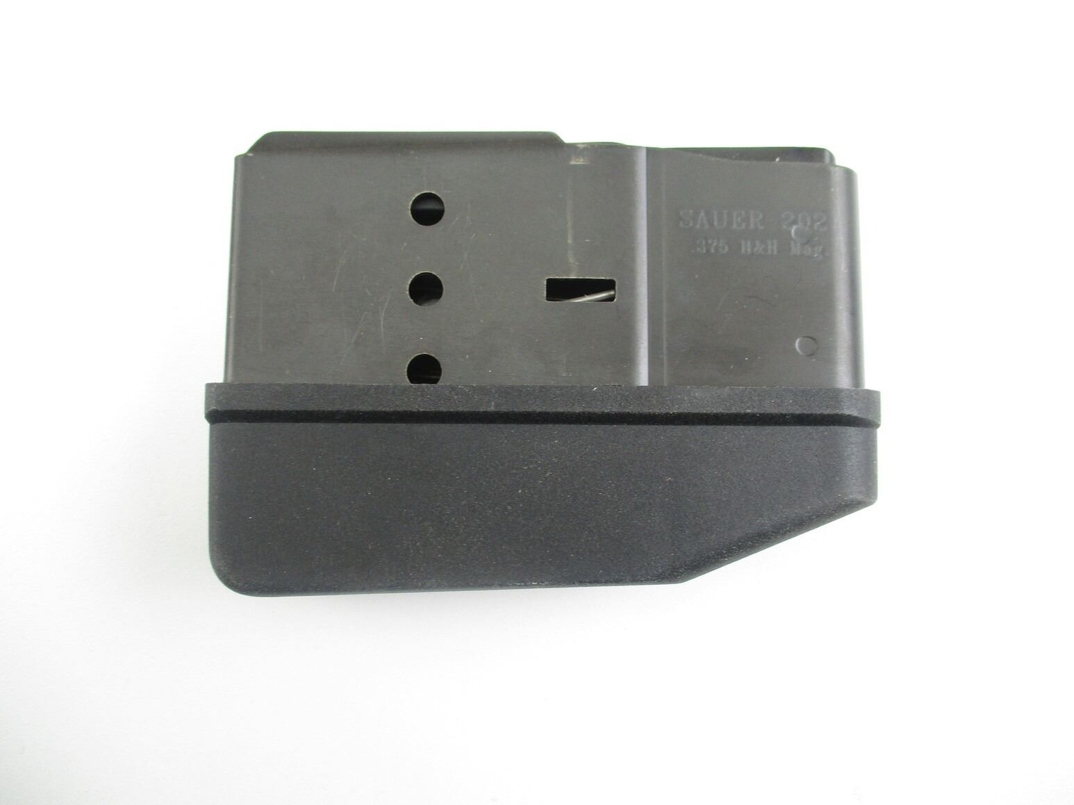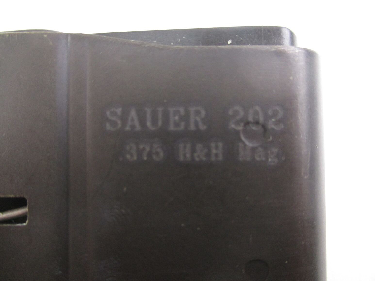 SAUER MODEL 202 RIFLE MAGAZINE , .375 H&H MAG, 5 ROUND MAG, STEEL, WITH POLYMER FOLLOWER & EXTENDED BASE, MARKED ON SIDE OF BED.