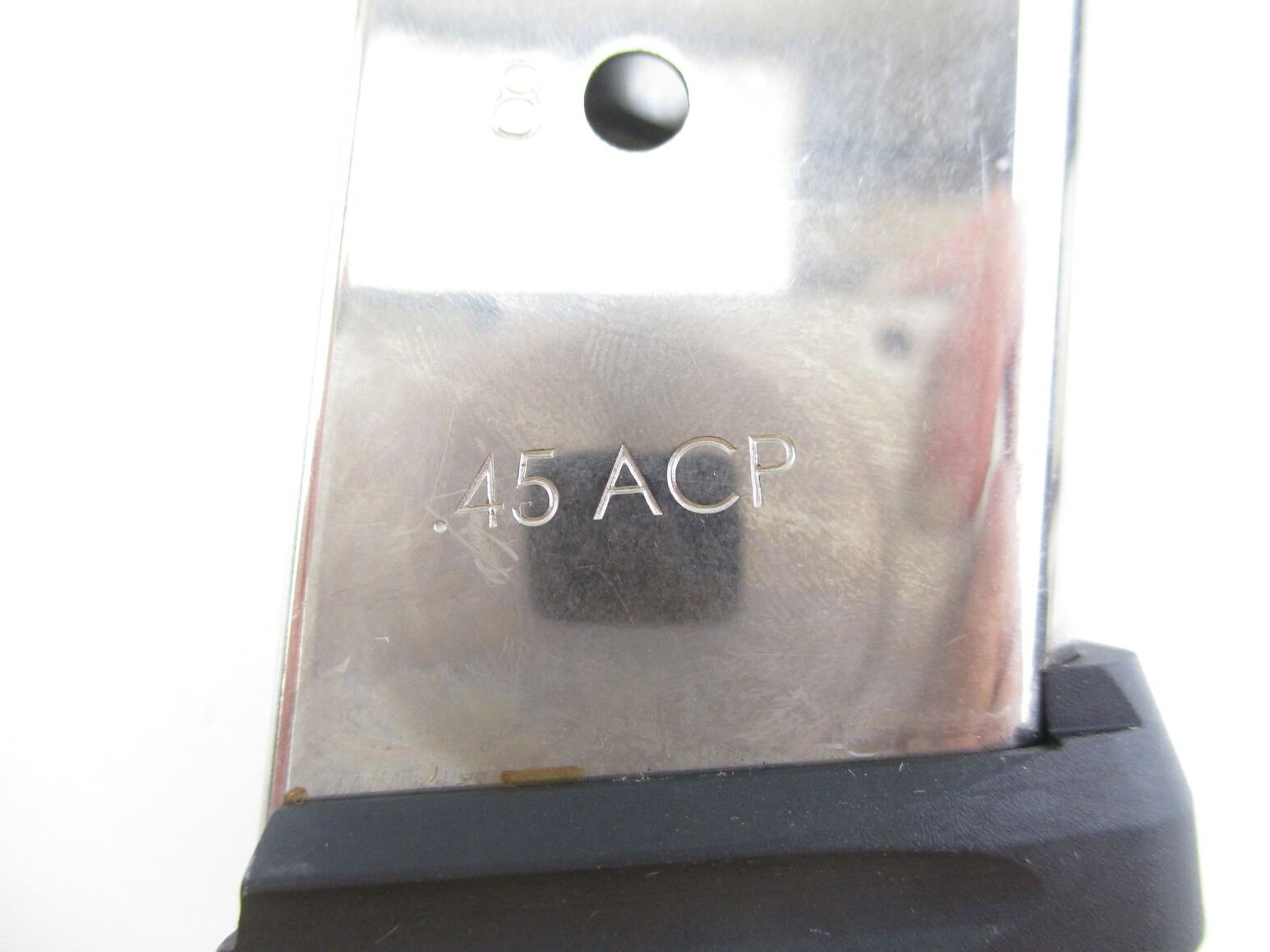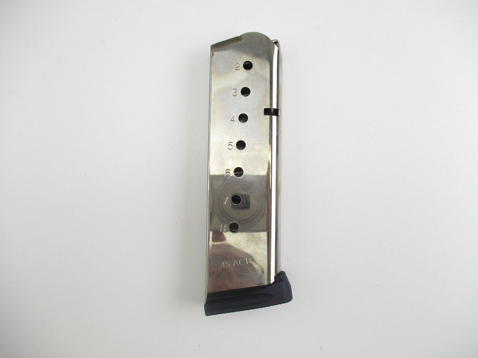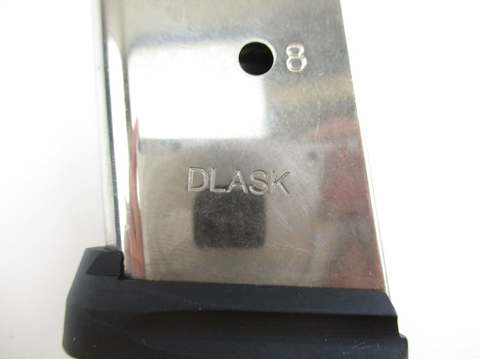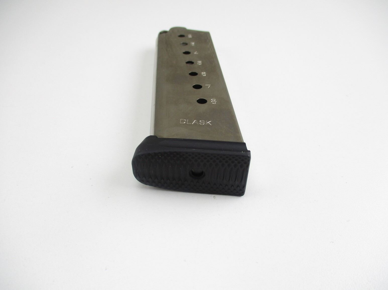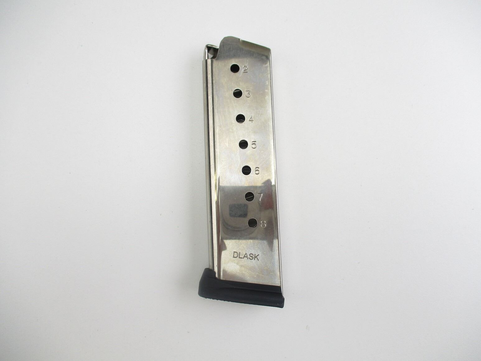 DLASK 1911 .45 ACP PISTOL MAGAZINE , .45 ACP, 8 ROUND MAG, STAINLESS STEEL, WITH POLYMER BOTTOM. DLASK MARKED ON SIDE OF MAG.