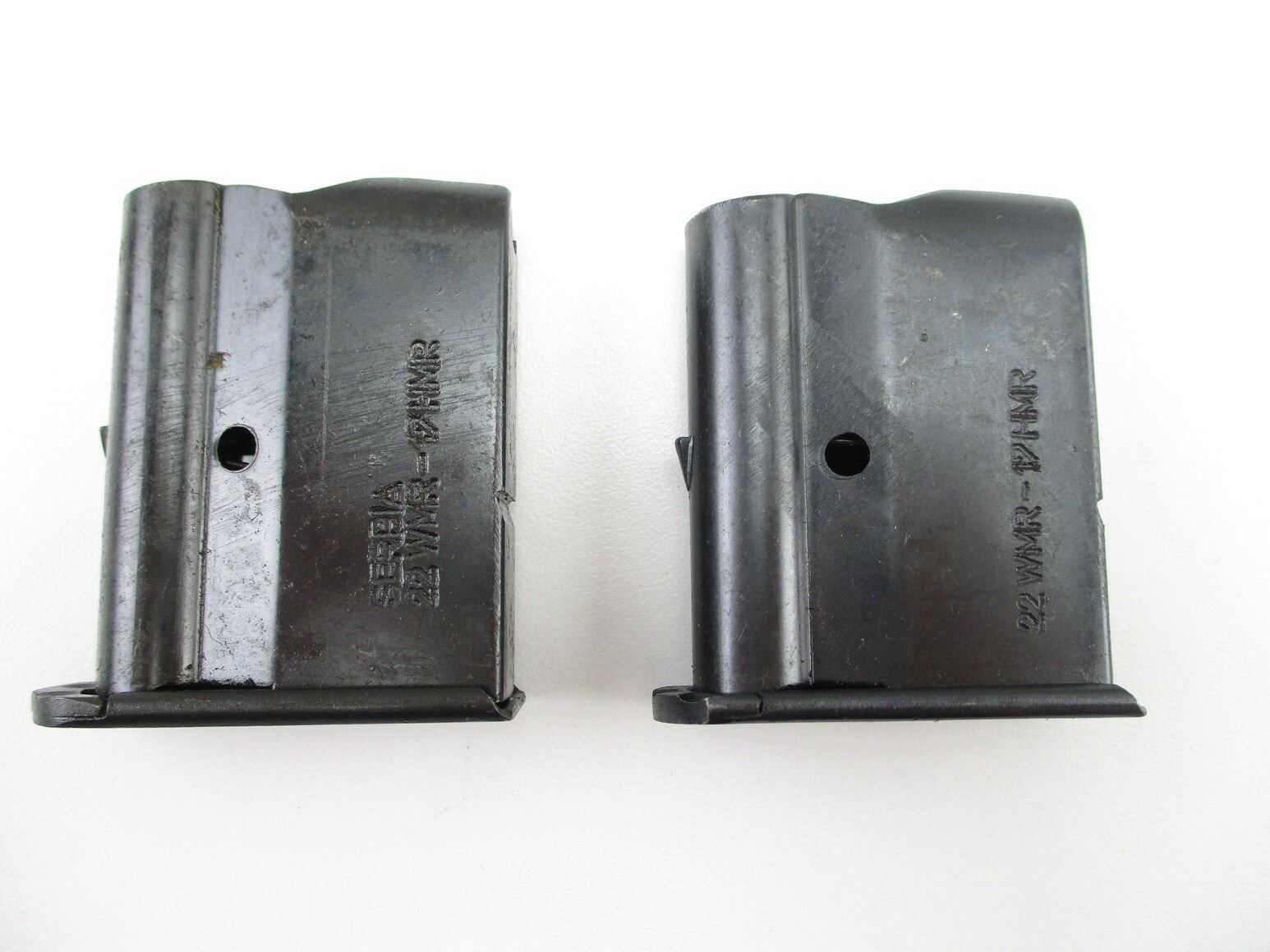 ZASTAVA Z5-MP22 RIFLE MAGAZINES, LOT OF 2. .22MAG / 17 HMR, 5 ROUND MAGS, BLUED STEEL, MAGS MARKED WITH CALIBER, 1 MAG MARKED SERBIA.