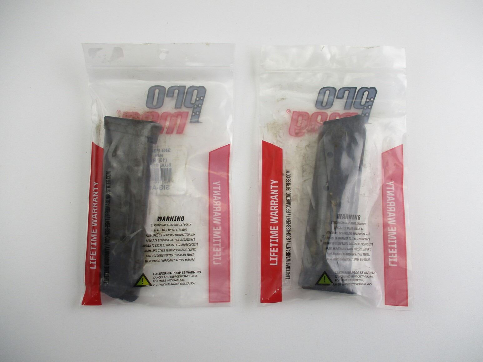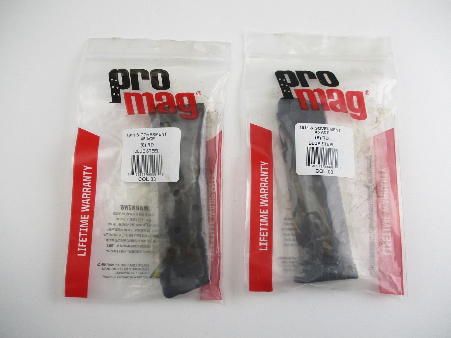 1911 & GOVERNMENT PISTOL MAGAZINES , LOT OF 2. .45 ACP, 8 ROUND MAGS, BLUED STEEL, POLYMER FOLLOWERS, MFG'D BY PRO MAG. IN ORIGINAL PACKAGING.