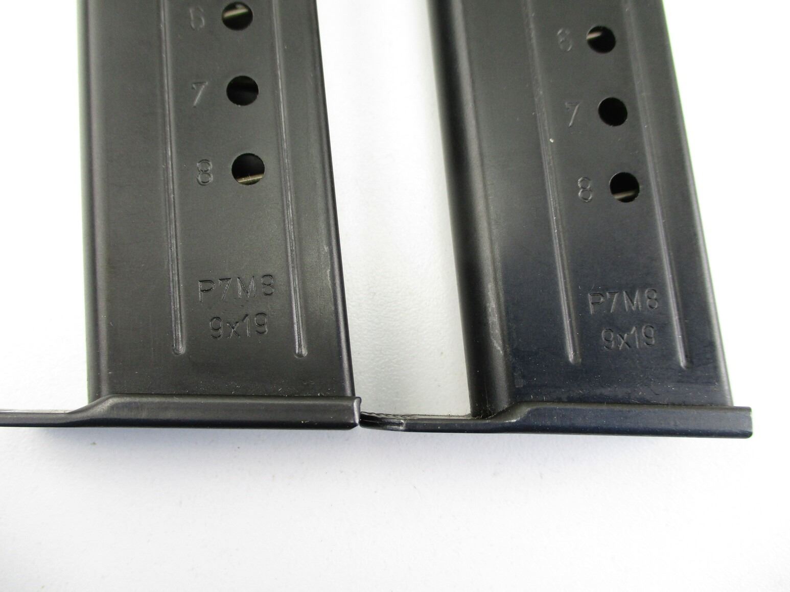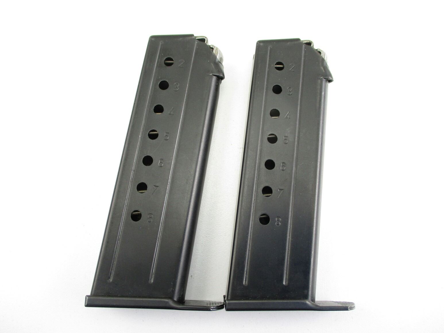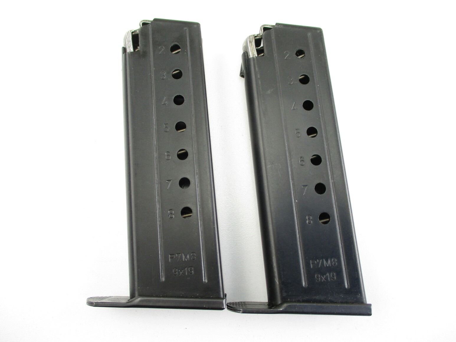 HECKLER & KOCH P7M8 PISTOL MAGAZINES , LOT OF 2. 9MM, 8 ROUND MAGS, BLUED STEEL, WITH ALLOY TYPE FOLLOWERS, MARKED "P7M8" ON SIDES.
