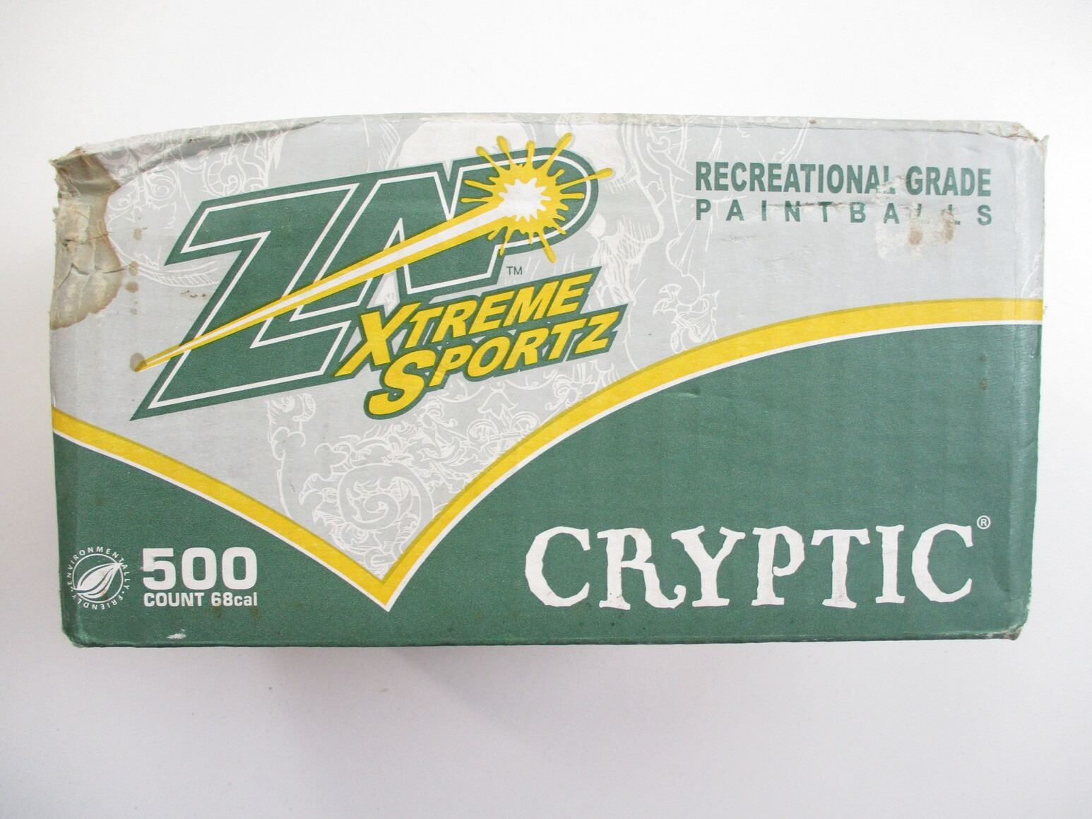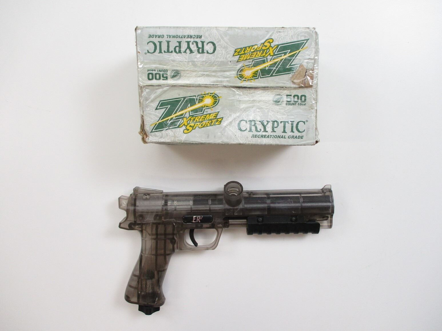 ER2 PISTOL Co2 PAINT BALL GUN WITH PAINT BALLS , 68 CAL, Co2 POWERED, PUMP ACTION, SINGLE SHOT, NO COCKING ISSUES, NOT TESTED, NEEDS Co2, INCLUDES BOX OF ZP CRYPTIC PAINT BALLS, POSSIBLY USED.