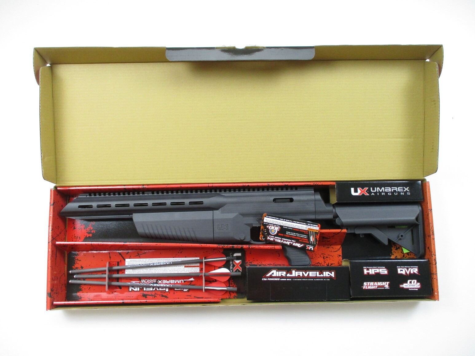 UMAREX AIR-JAVELIN, APPEARS NOS, Co2 POWERED, SINGLE SHOT, INCLUDES 3 BOLTS, NOTE TESTED, IN ORIGINAL PACKAGE, WITH MANUAL & ACCESSORIES.
