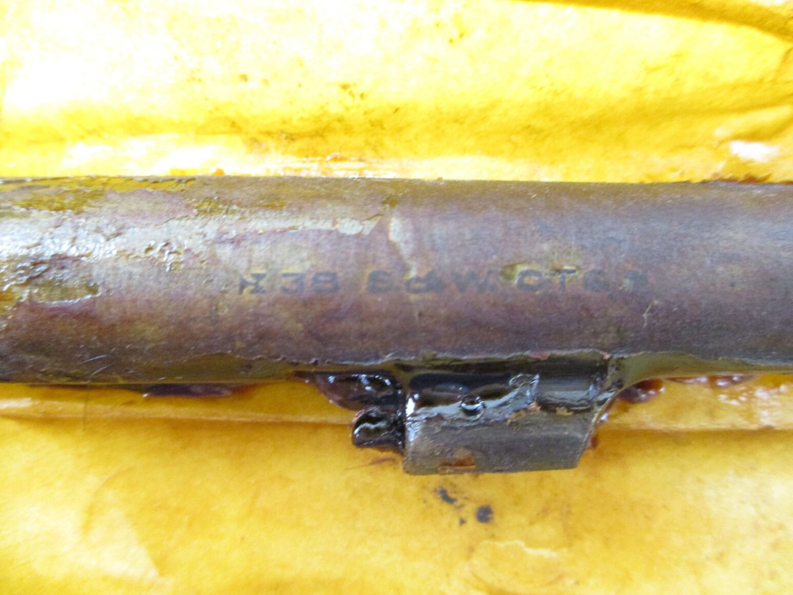 SMITH & WESSON M&P REVOLVER BARREL , NOS. APPROX. 5" BARREL, .38 S&W, WITH FRONT SIGHT BLADE, MARKED ON SIDE OF BARREL, IN GREASE. WRAPPED IN GREASE PAPER.