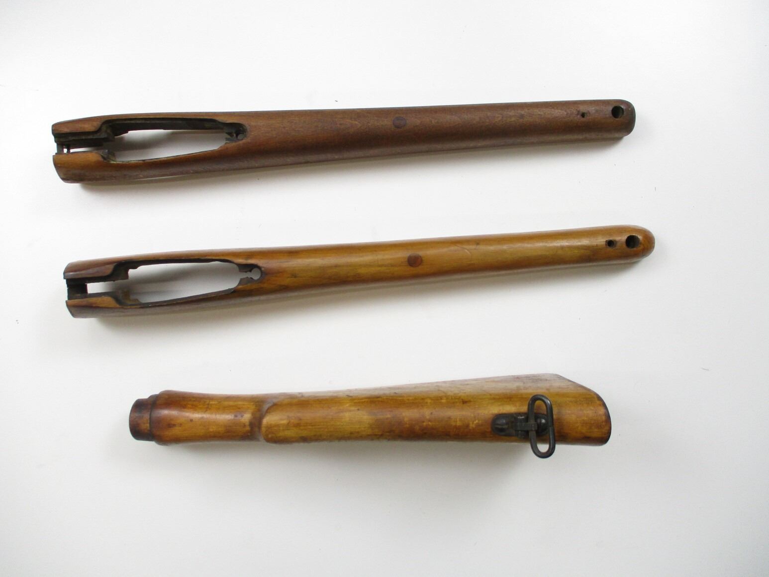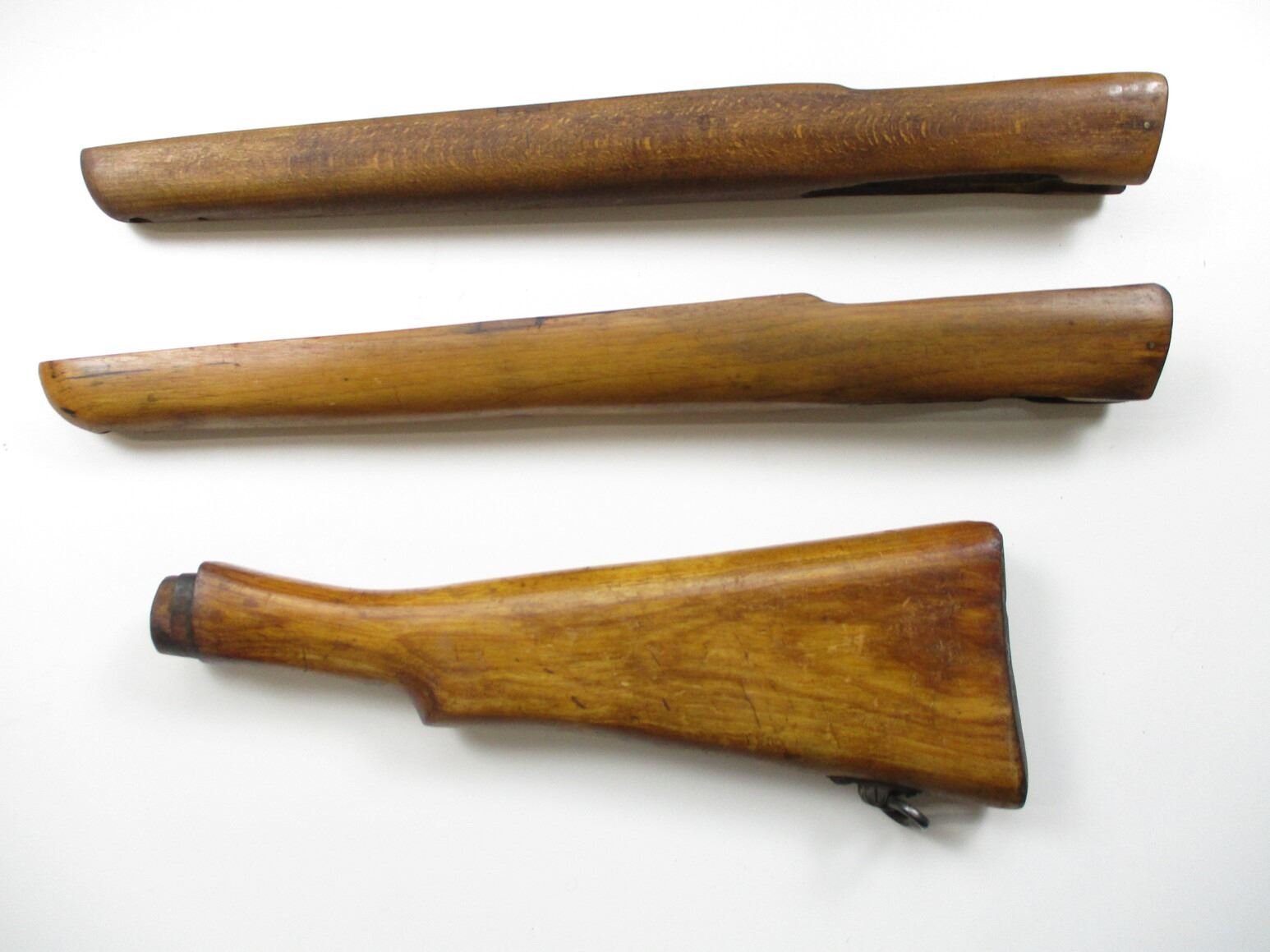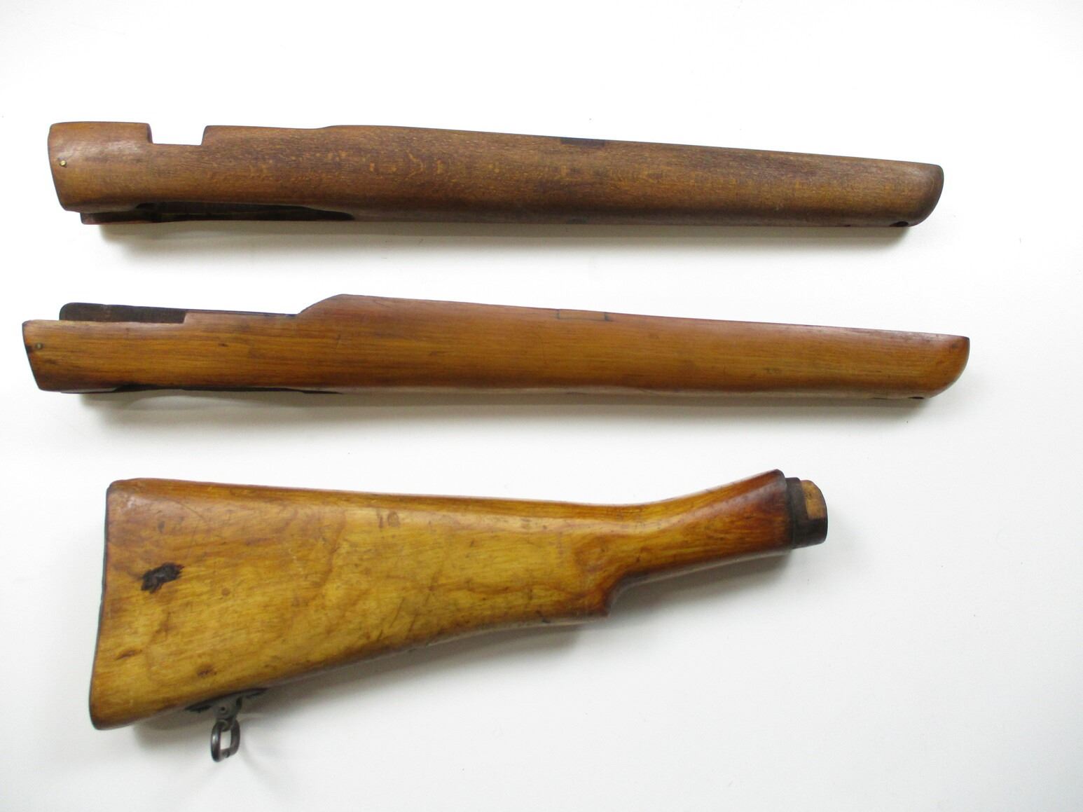 LEE ENFIELD SPORTER STYLE FORENDS & BUTT SOCKS , (1) LEE ENFIELD BUTT STOCK, WITH SWIVEL, APPROX. 13.5" OAL, NO BUTT PLATE, (2) FORENDS, POSSIBLY NO.1 MK.3, CUT OUTS ON STOCKS FOR REAR SIGHTS. STOCKS ON MAY SCUFFS, MARKS, GROOVES, AND OR CRACKS, NO VISIBLE MARKINGS, (1 STOCK WITH WOOD CHIP). MAY REQUIRE REPAIR & FITTING.
