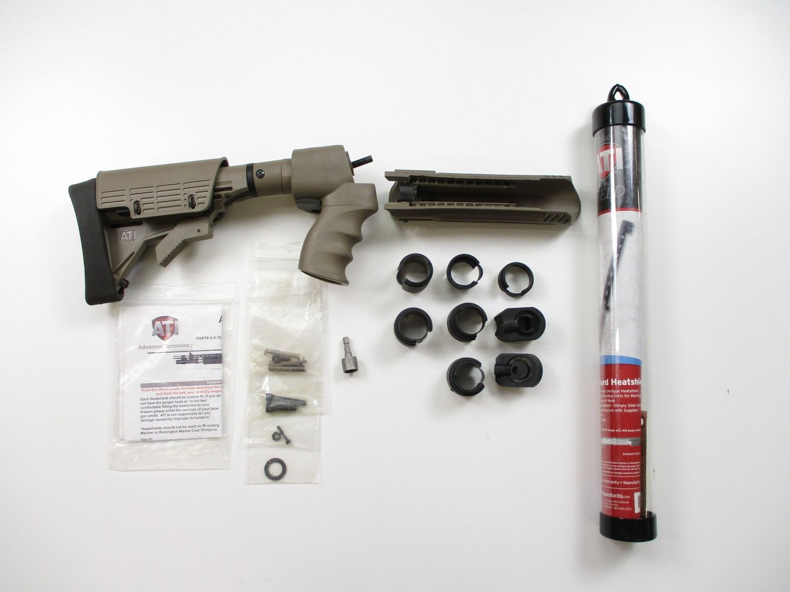 ATI WINCHESTER DEFENDER 12 GAUGE SHOTGUN STOCK & FOREND ETC, FOLDING BUTT STOCK, WITH CHEEK RISER, RECOIL PAD, & MOUNTING BOLT, (1) ATI FOREND, MATCHING COLOUR, POLYMER CONSTRUCTION, (1) ATI HEAT SHIELD, ALSO INCLUDES SOME MOUNTING HARDWARE. ETC.