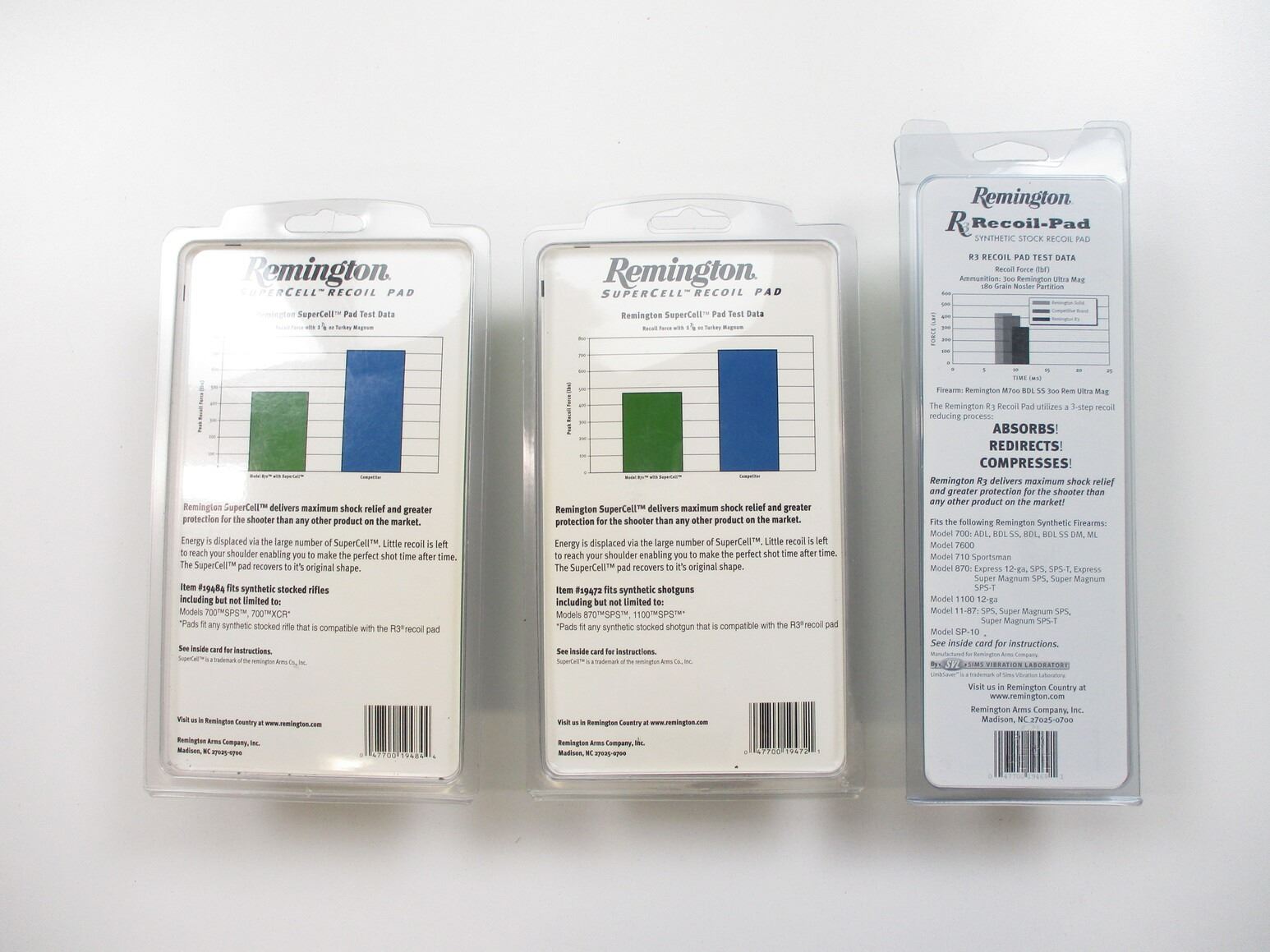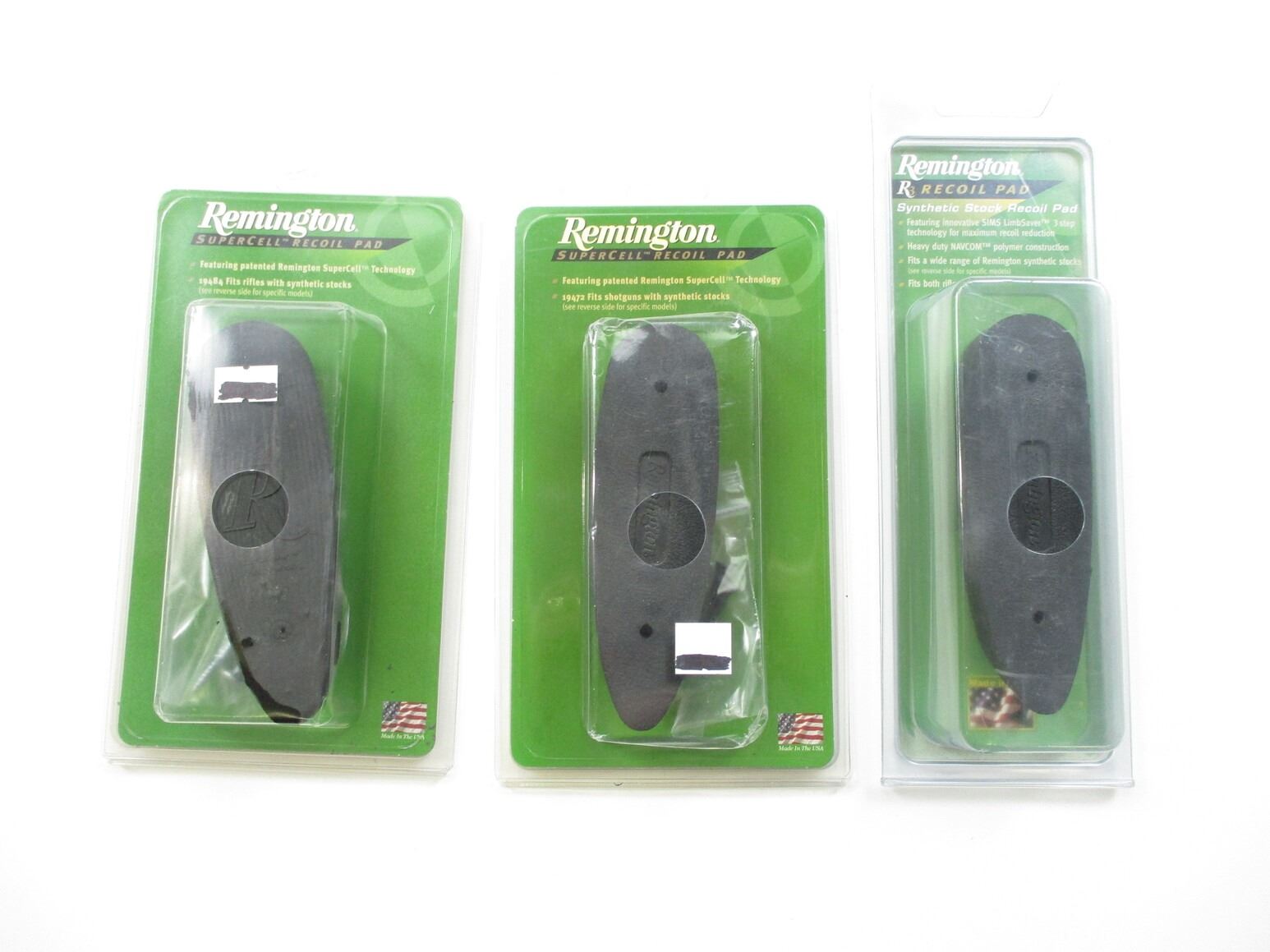 ASSORTED REMINGTON RECOIL PADS, (2) RECOIL PADS FIT MODEL 700, IN ORIGINAL PACKAGE, RECOIL PADS POSSIBLY USED, INCLUDES MOUNTING SCREWS. (1) RECOIL PAD FITS MODEL 870 & 1100 BUTT STOCKS, WITH MOUNTING SCREWS, COMES IN ORIGINAL PACKAGE, POSSIBLY USED.