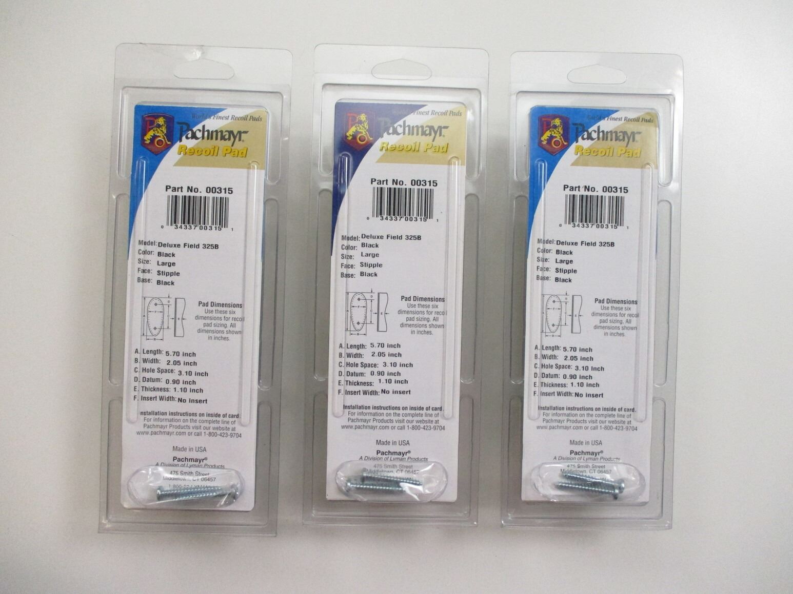 PACHMAYR DELUXE FIELD 325B RECOIL PADS, , LOT OF 3. SIZE: LARGE, BLACK, VENTED PAD, L-5.70". W- 2.05", HOLE SPACE- 3.10", DATUM- 0.90", THICKNESS- 1.10", APPEARS NOS WITH SCREWS.