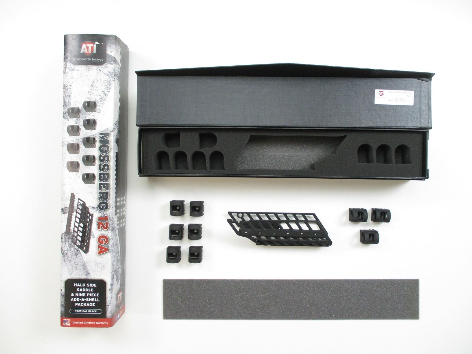 ATI MOSSBERG 12 GAUGE SHOT SHELL SADDLE, HALO SIDE SADDLE & NINE PIECE ADD-A-SHELL PACKAGE, TACTICAL BLACK, APPEARS COMPLETE, POSSIBLY NOS. ASSEMBLED / INSPECTED DATE: 1/23/14. IN ORIGINAL PACKAGE.