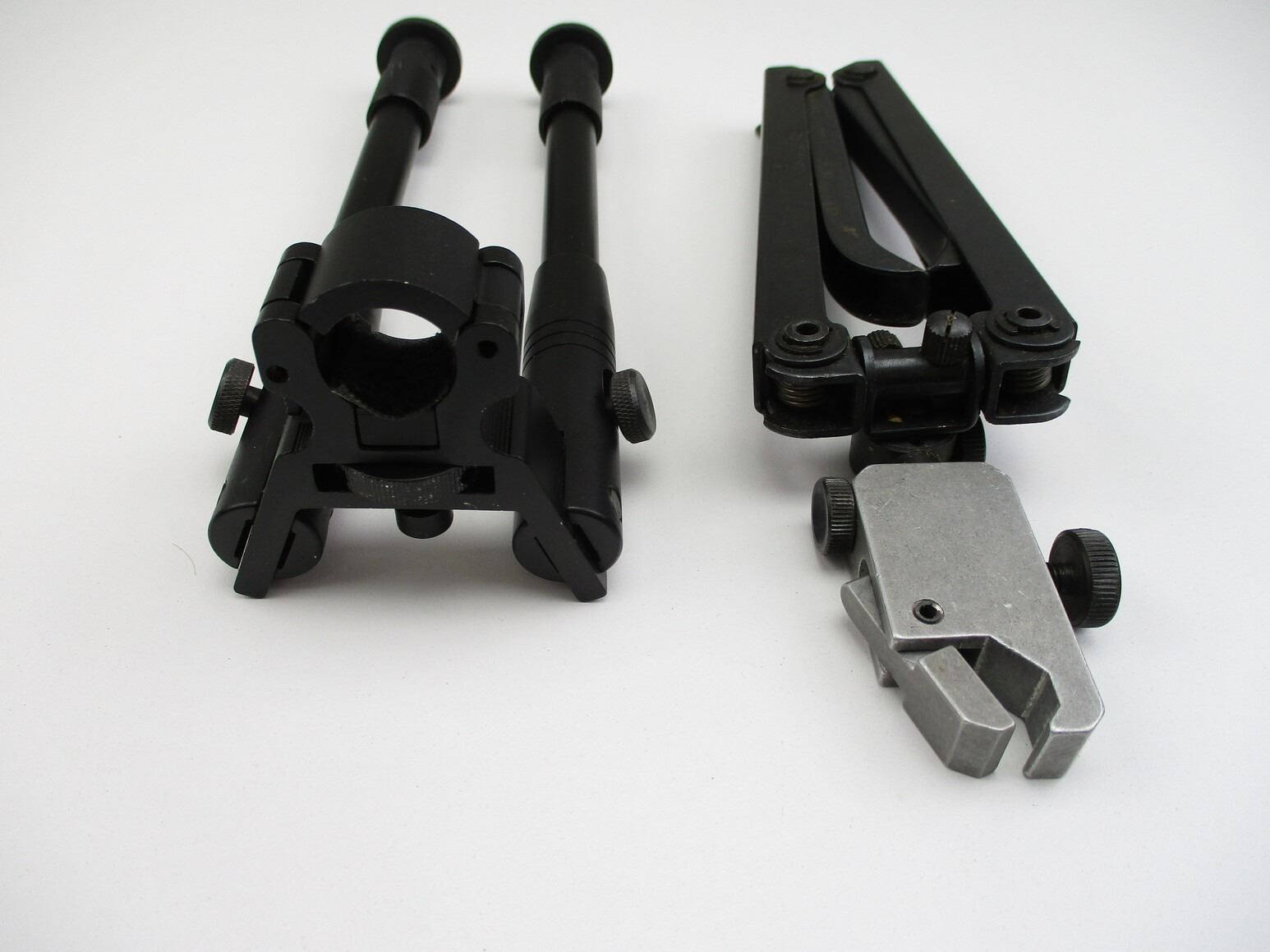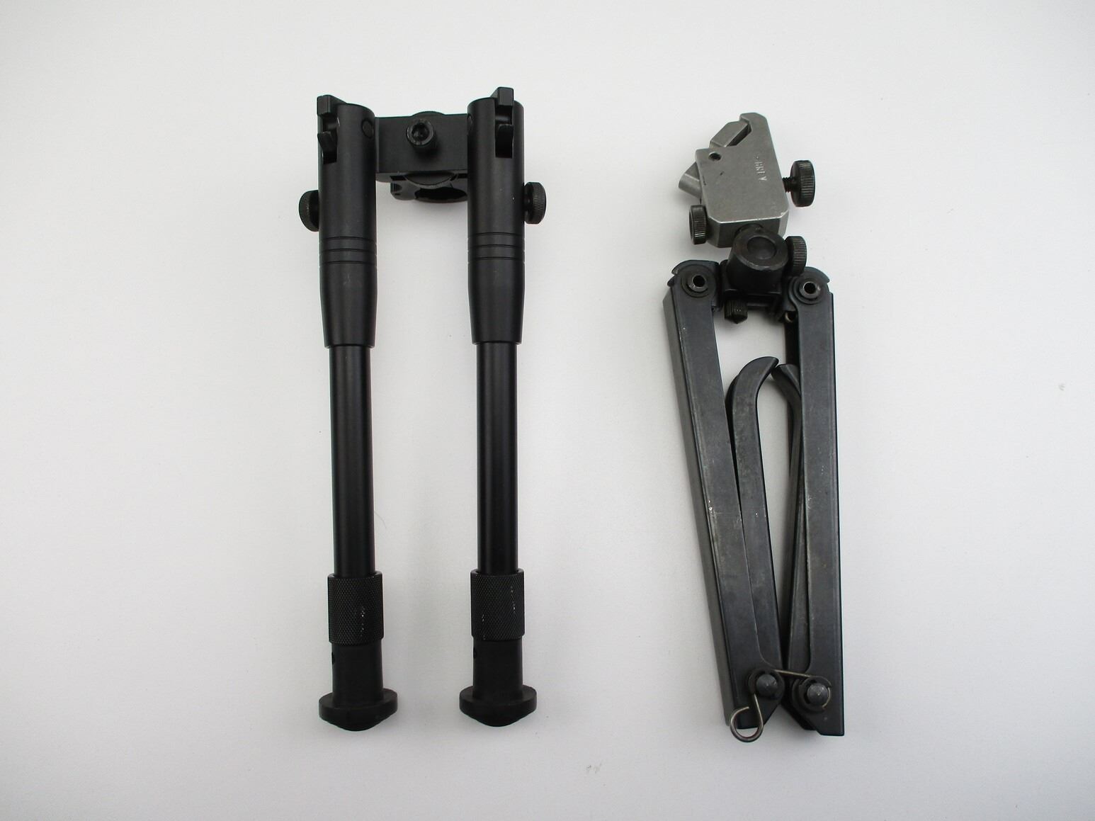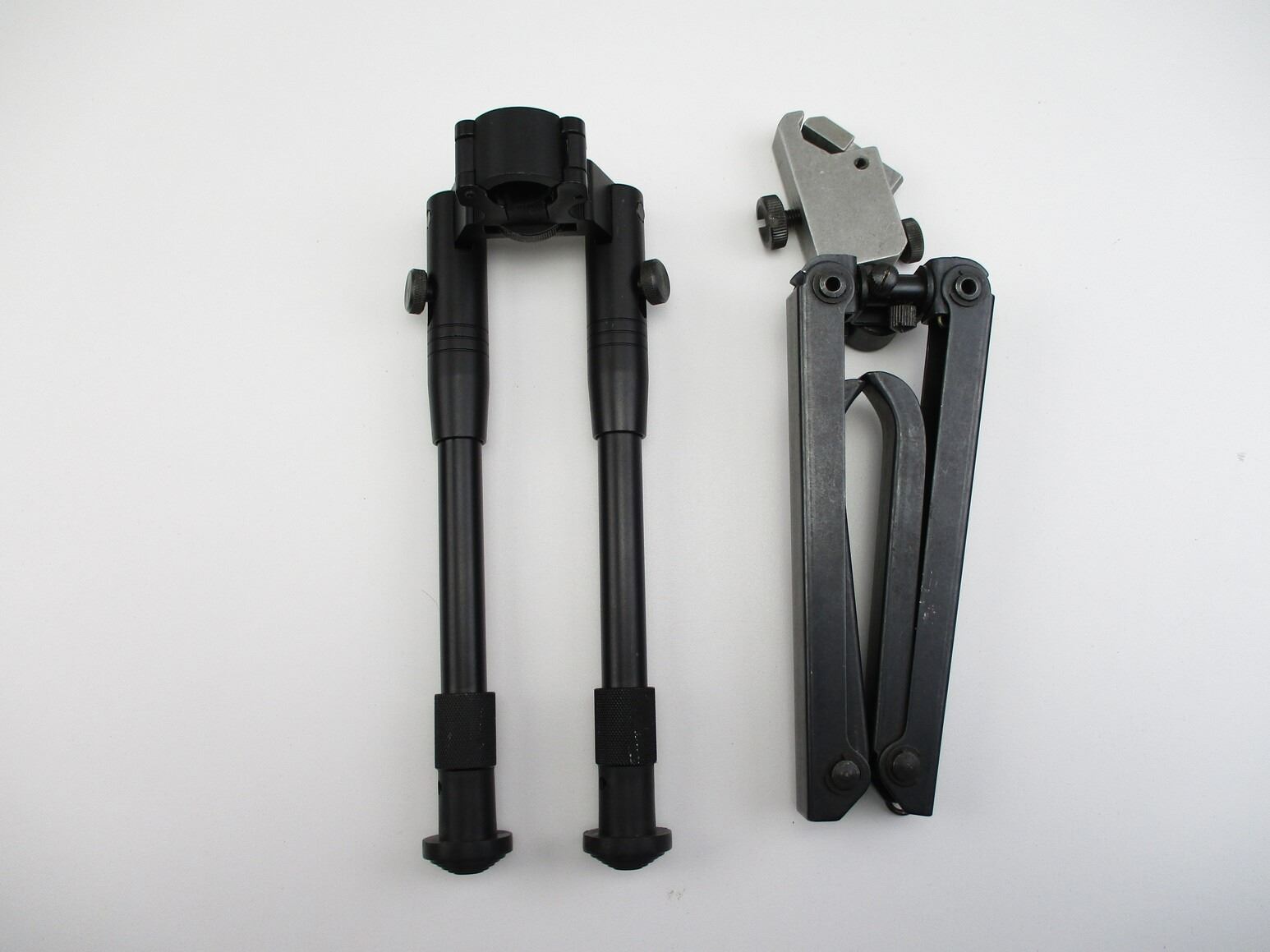 ASSORTED BI-PODS , (1) FOLDING LEG BIPOD, APPROX. 10" OAL, SPRING LOADED, INCLUDES UNKNOWN CLAMP TYPE BI-POD MOUNT, MARKED "BREV". (1) CHINESE TYPE BARREL CLAMP BI-POD, WITH RUBBER FEET, APPROX. 8 - 9.75", UNMARKED. APPROX. 0.77" BARREL CLAMP DIAMETER.