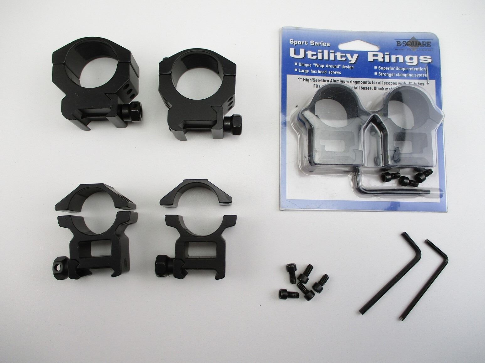 ASSORTED SCOPE RINGS , SCOPE RINGS FIT PICATINNY / WEAVER STYLE RAILS. (1) PAIR OF SPORT SERIES UTILITY RINGS, NOS, (1) PAIR OF 1" SEE-THRU SCOPE RINGS WITH SCREWS FOR TOP HALF OF RINGS, WITH QD THUMB SCREWS, (1) PAIR OF 30MM SCOPE RINGS WITH QD THUMB SCREWS.
