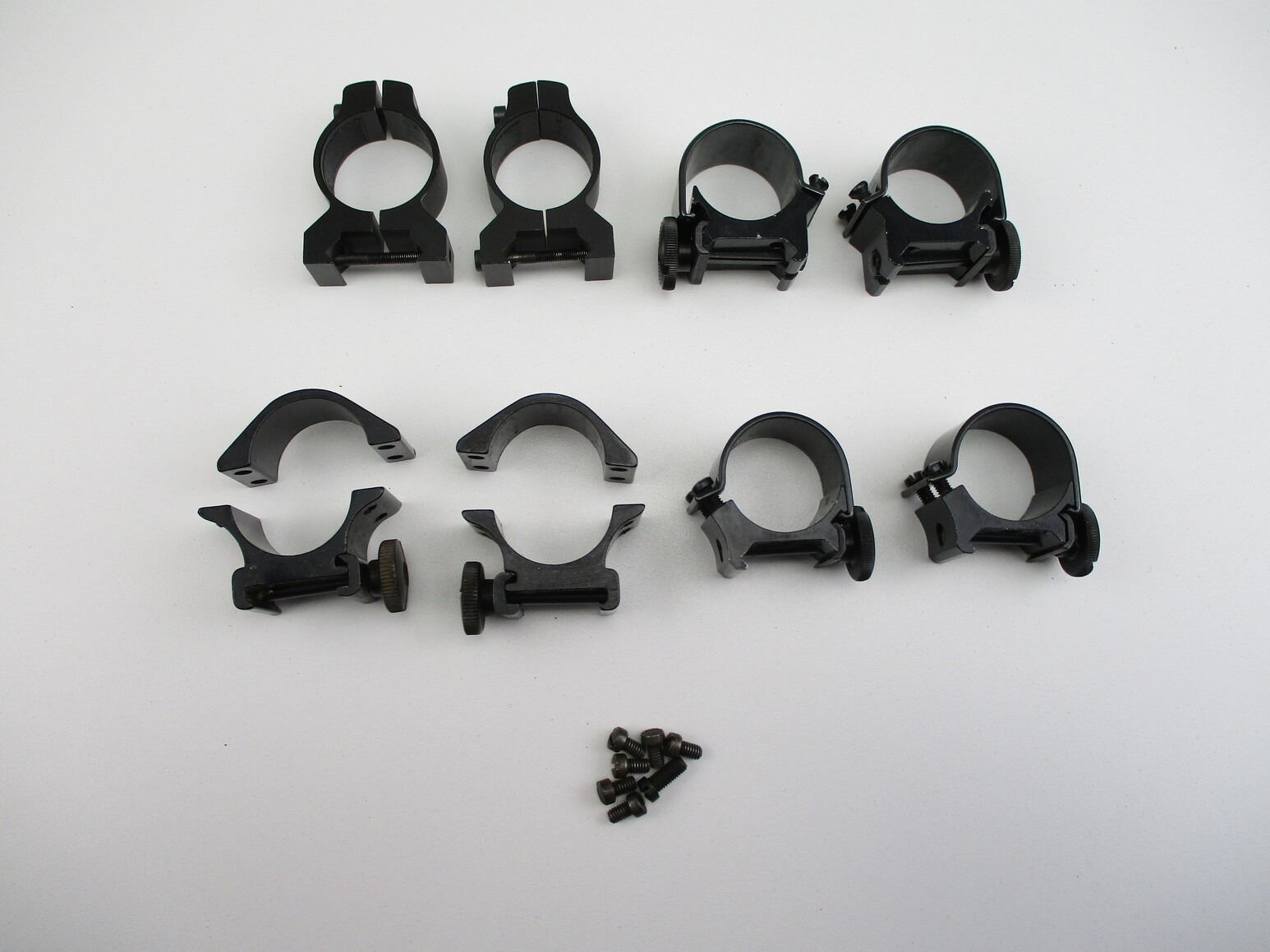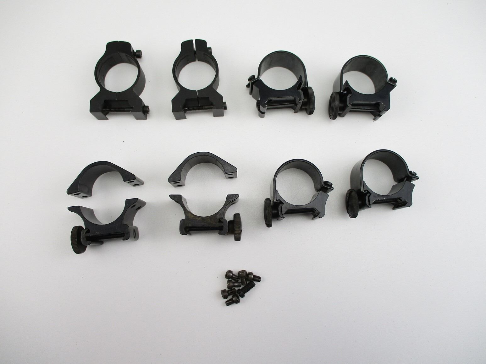 ASSORTED 1" WEAVER SCOPE RINGS ETC, INCLUDES (2) PAIRS OF QD LOW TYPE SCOPE RINGS, (1) PAIR OF UNKNOWN SLIP 1" SCOPE RINGS. (1) PAIR OF UNKNOWN QD SCOPE RINGS. ALL FIT ON PICATINNY / WEAVER STYLE RAILS.
