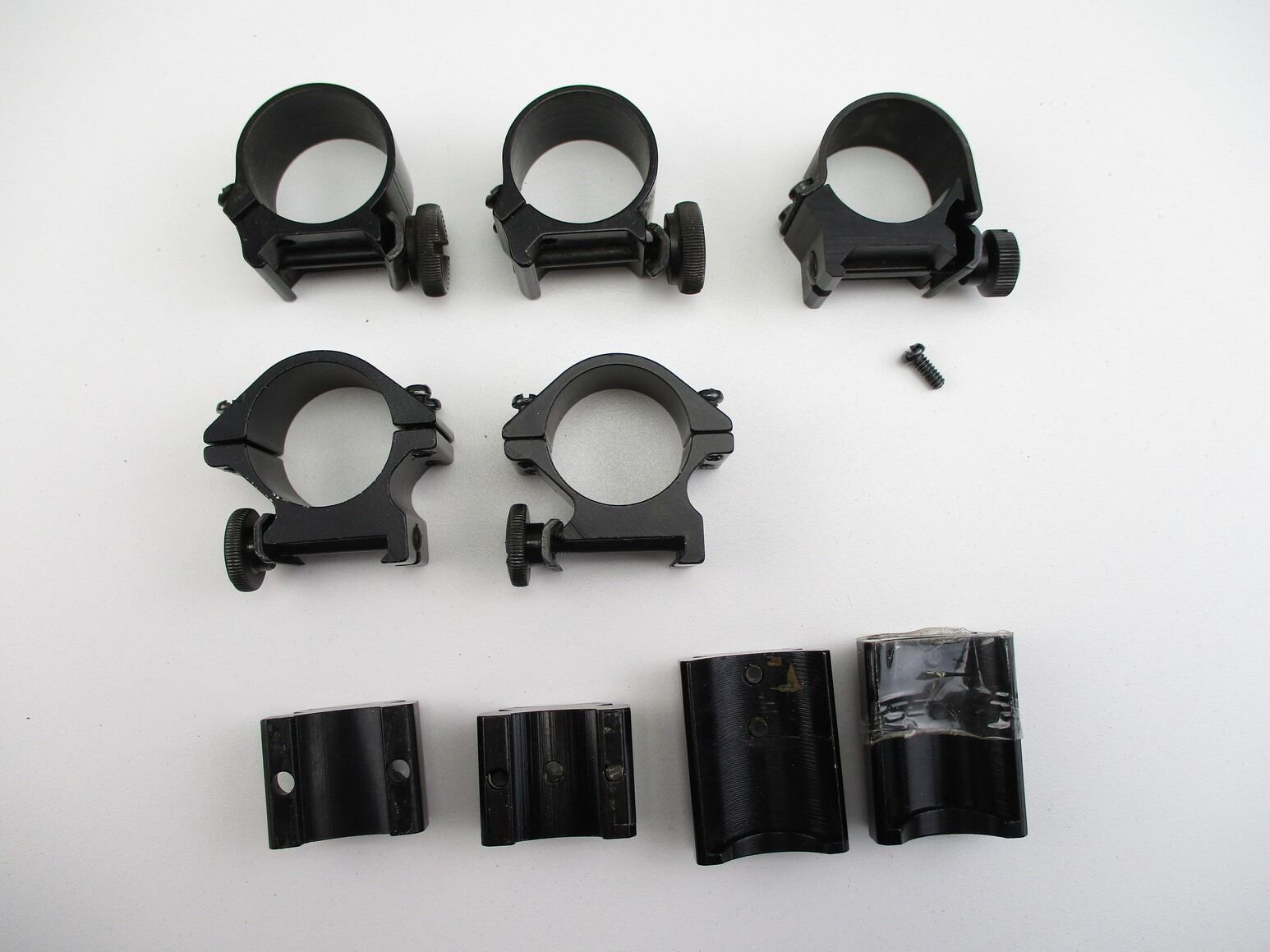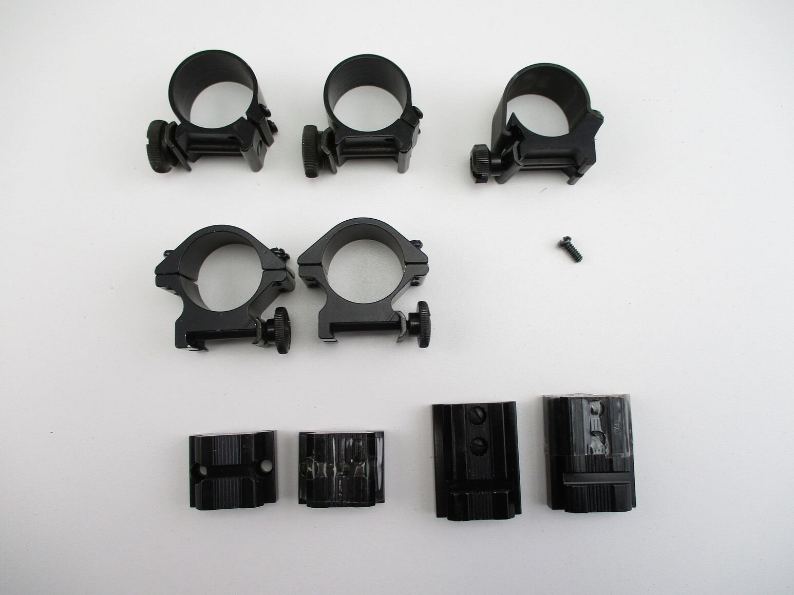 ASSORTED 1" WEAVER SCOPE RINGS ETC, INCLUDES (1) PAIRS OF QD LOW TYPE SCOPE RINGS, (1) SINGLE QD LOW TYPE SCOPE RING, (1) PAIR OF UNKNOWN QD SCOPE RINGS, (2) SETS OF SCOPE RINGS BASES, MARKED 94 & 95.