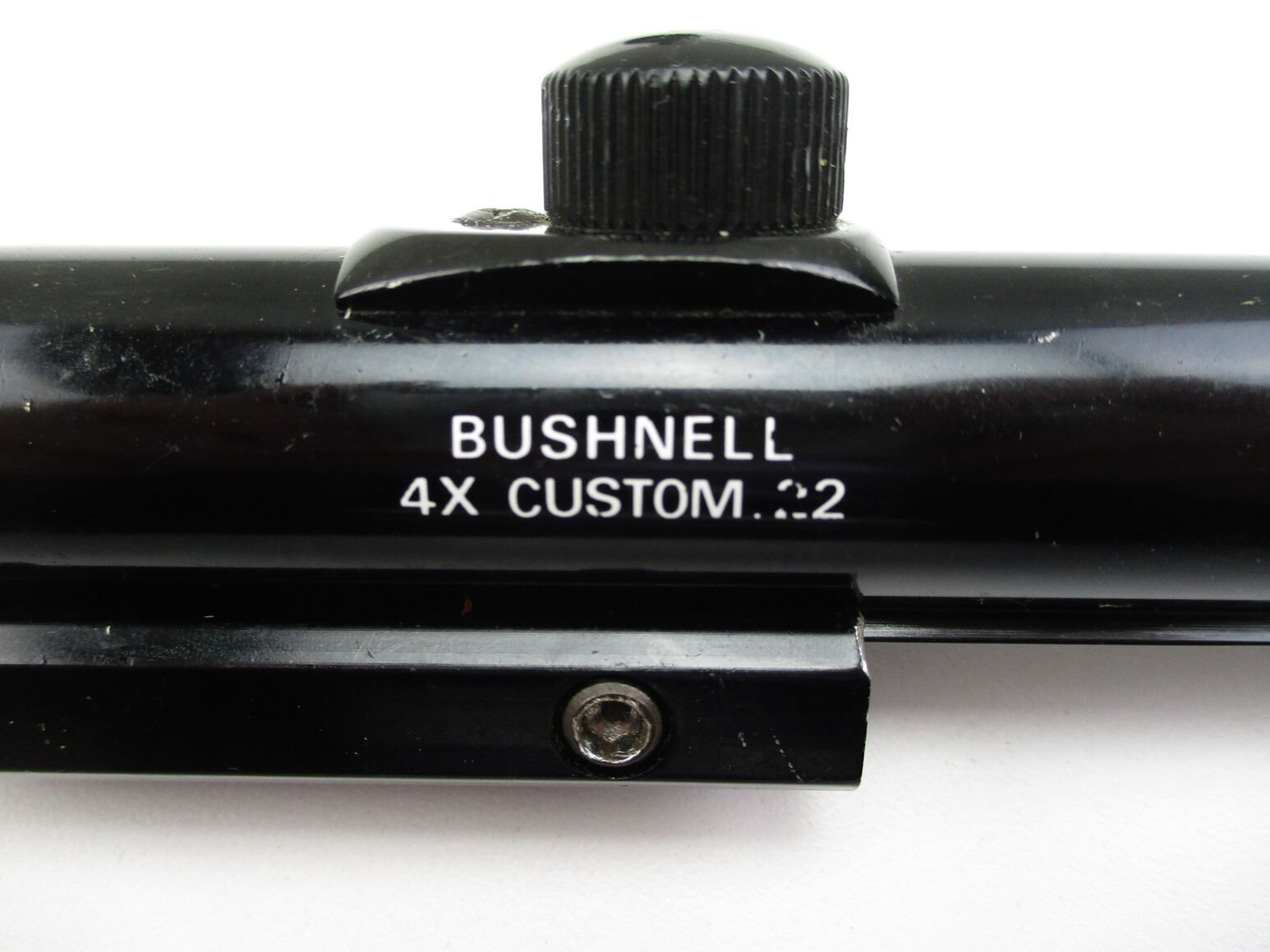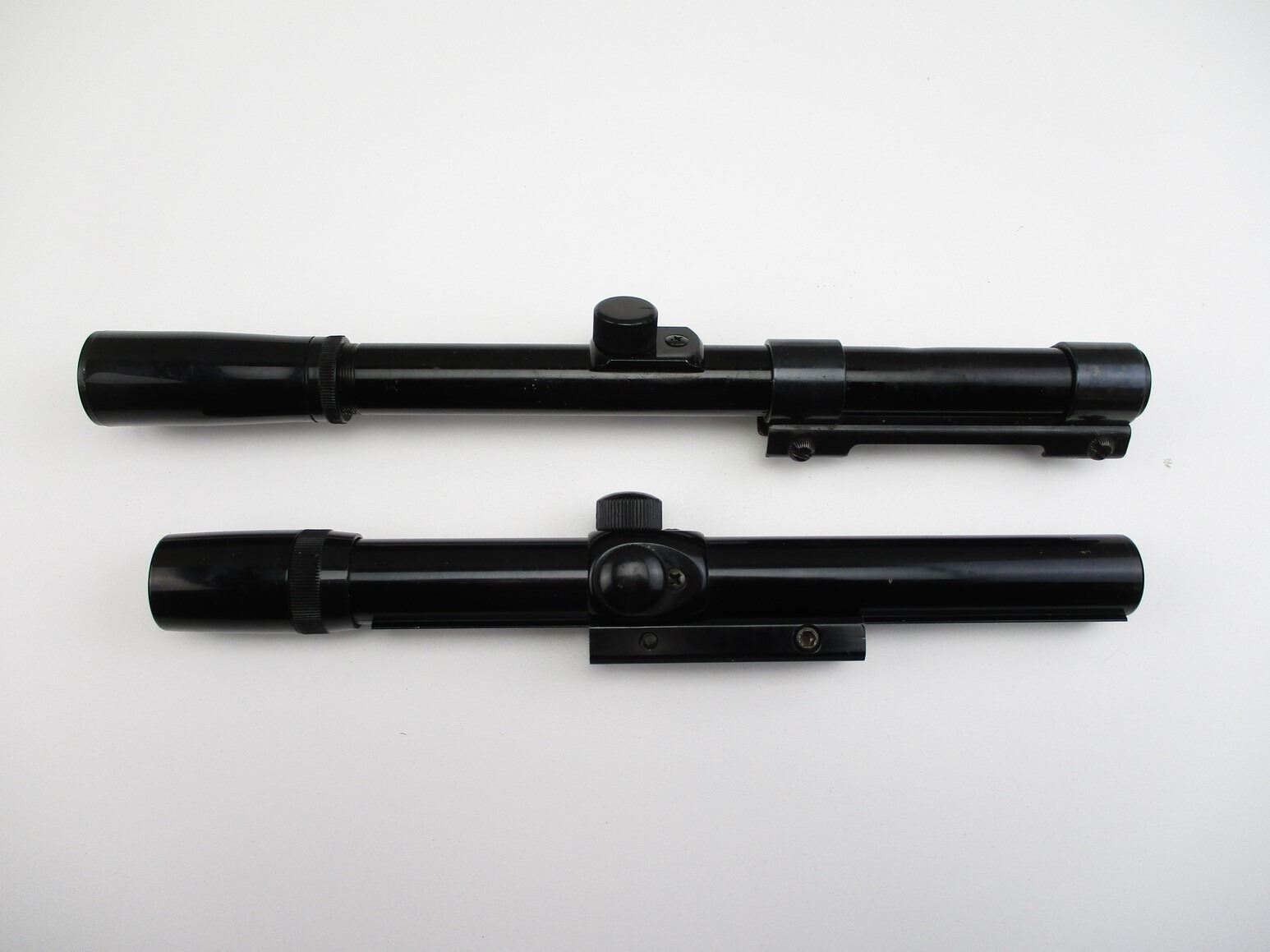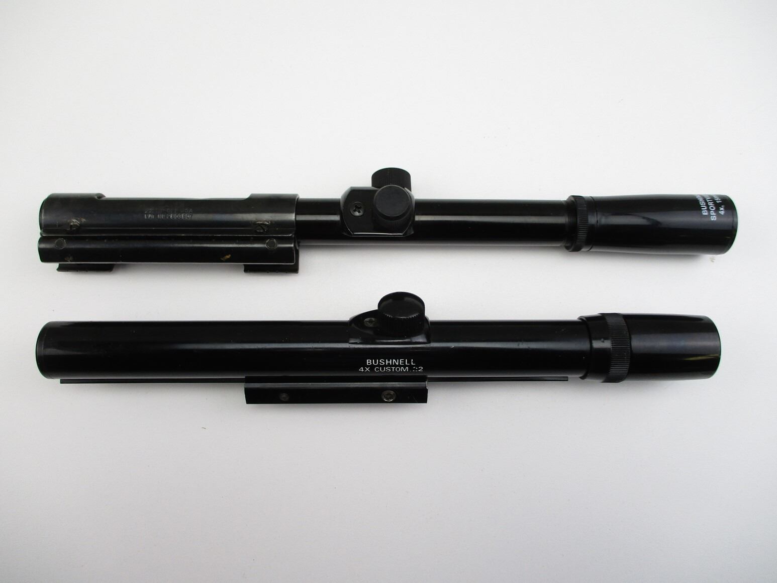.22 STYLE RIFLE SCOPES , LOT OF 2. (1) BUSHNELL 4X CUSTOM .22 SCOPE, CLEAR OPTICS, DUPLEX RETICLE, INCLUDES .22 STYLE MOUNTING BRACKET, (1) BUSHNELL SPORTVIEW 4X 15MM SCOPE, CLEAR OPTICS, DUPLEX RETICLE, WITH WEAVER .22 TIP-OFF MOUNT BRACKET.