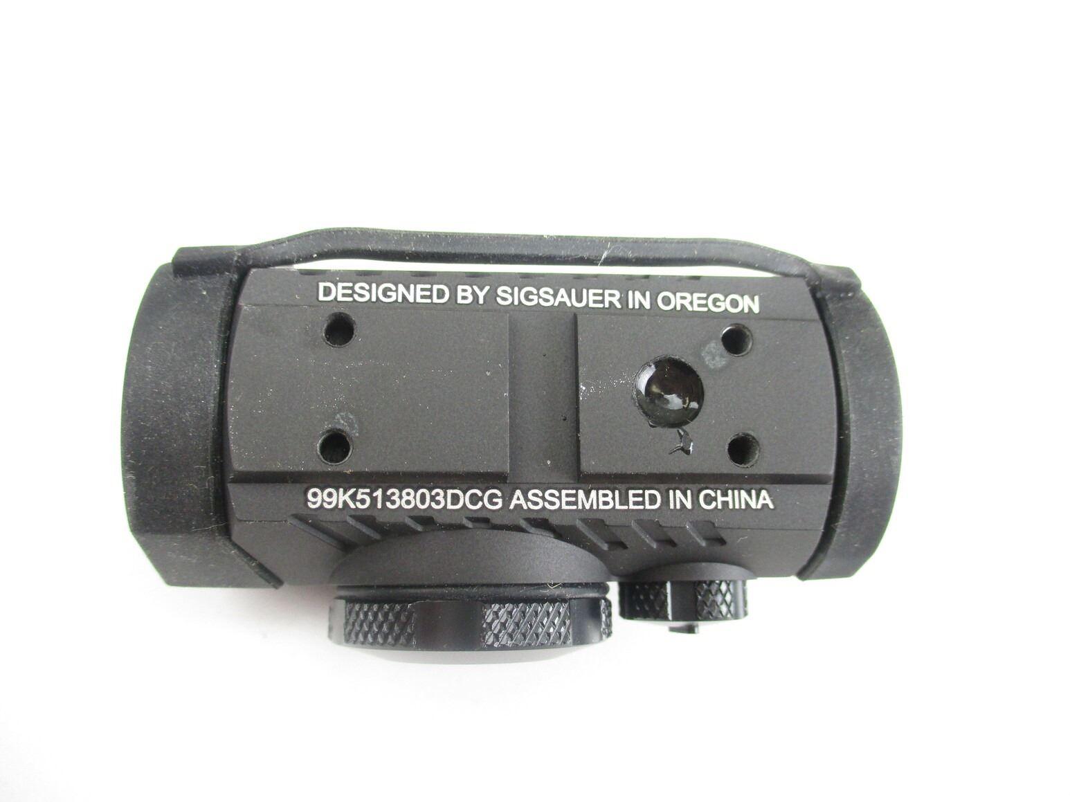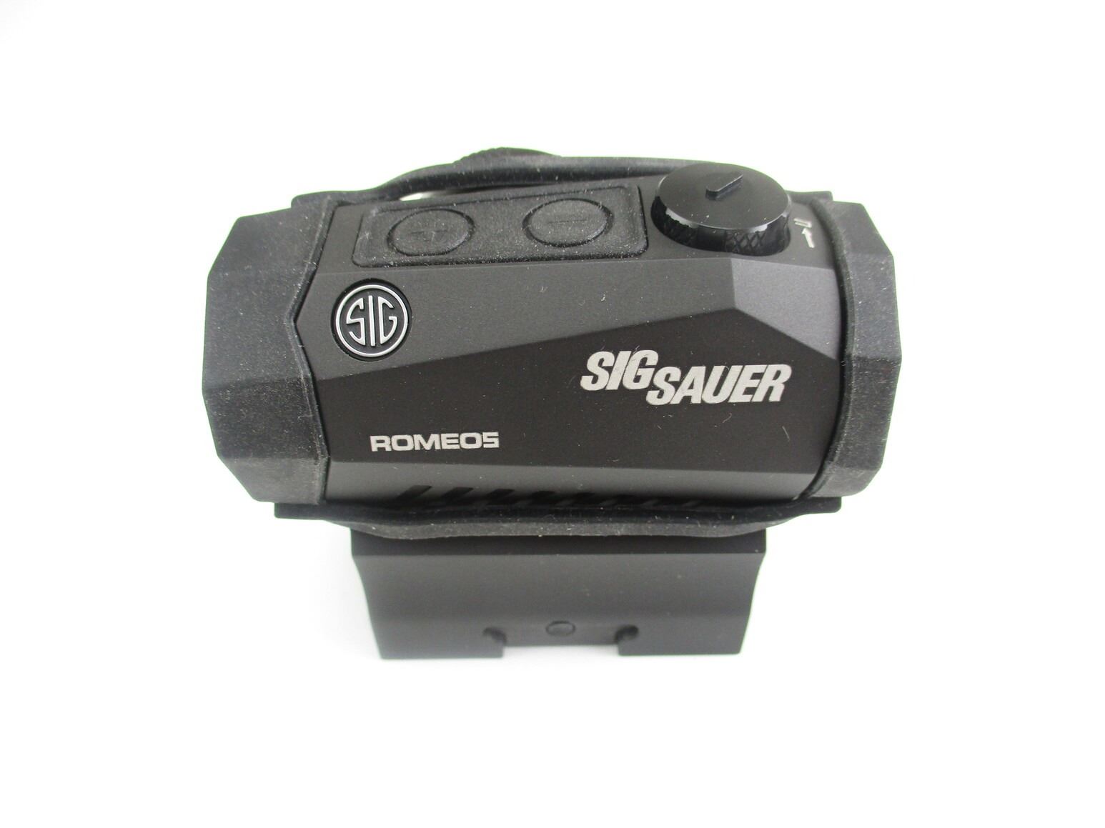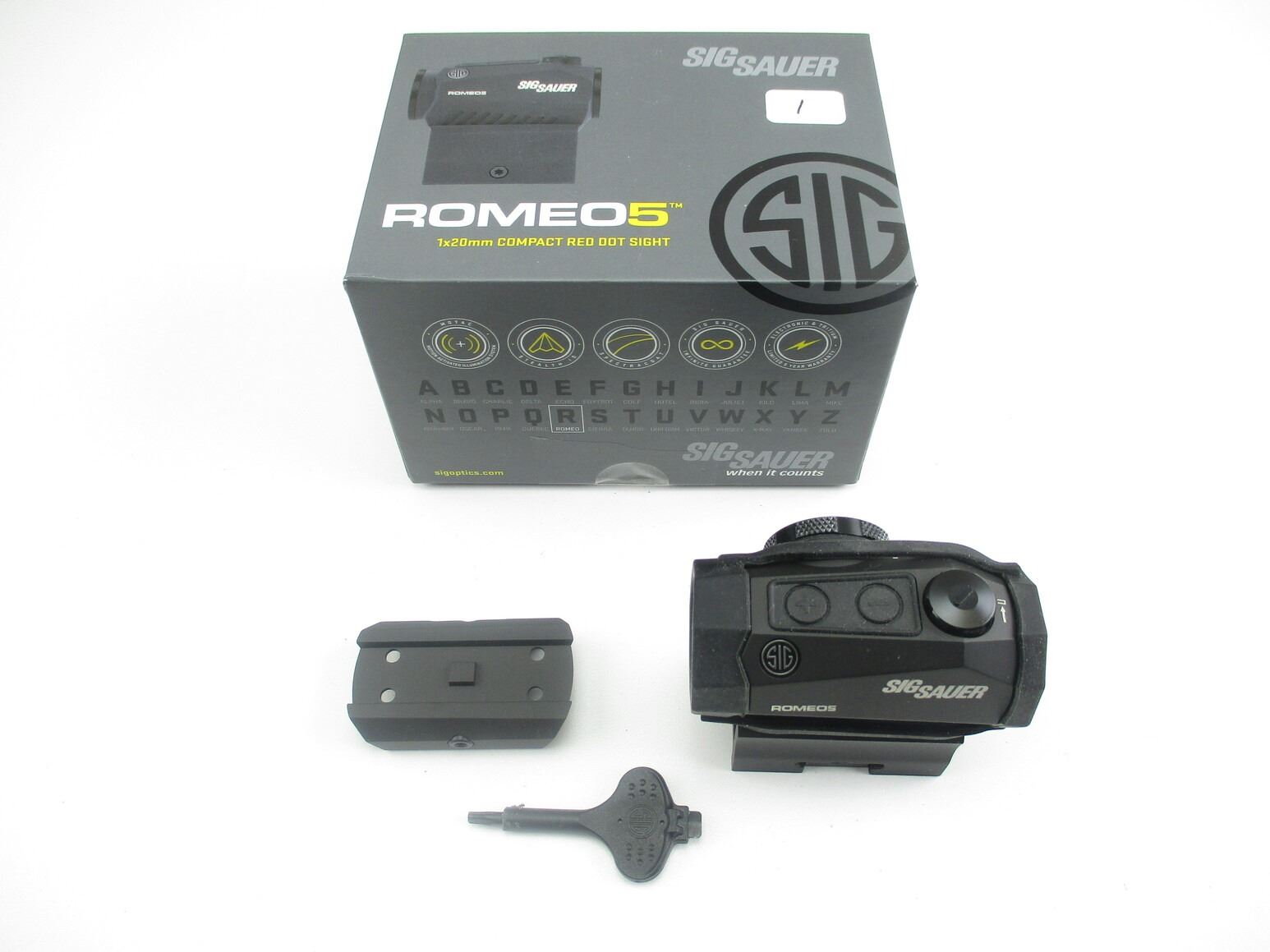 SIG SAUER ROMEO5 RED- DOT SIGHT , 1X 20, CLEAR OPTICS, 2 MOA RED-DOT RETICLE, WORKS, WITH RUBBER BIKINI STYLE LENS CAPS, SERIAL # 99K513803DCG, ASSEMBLED IN CHINA MARKED, INCLUDES LOW & HIGH PICATINNY BRACKETS, WITH MOUNTING SCREWS & TOOL. COMES WITH MANUAL & ORIGINAL PACKAGE.