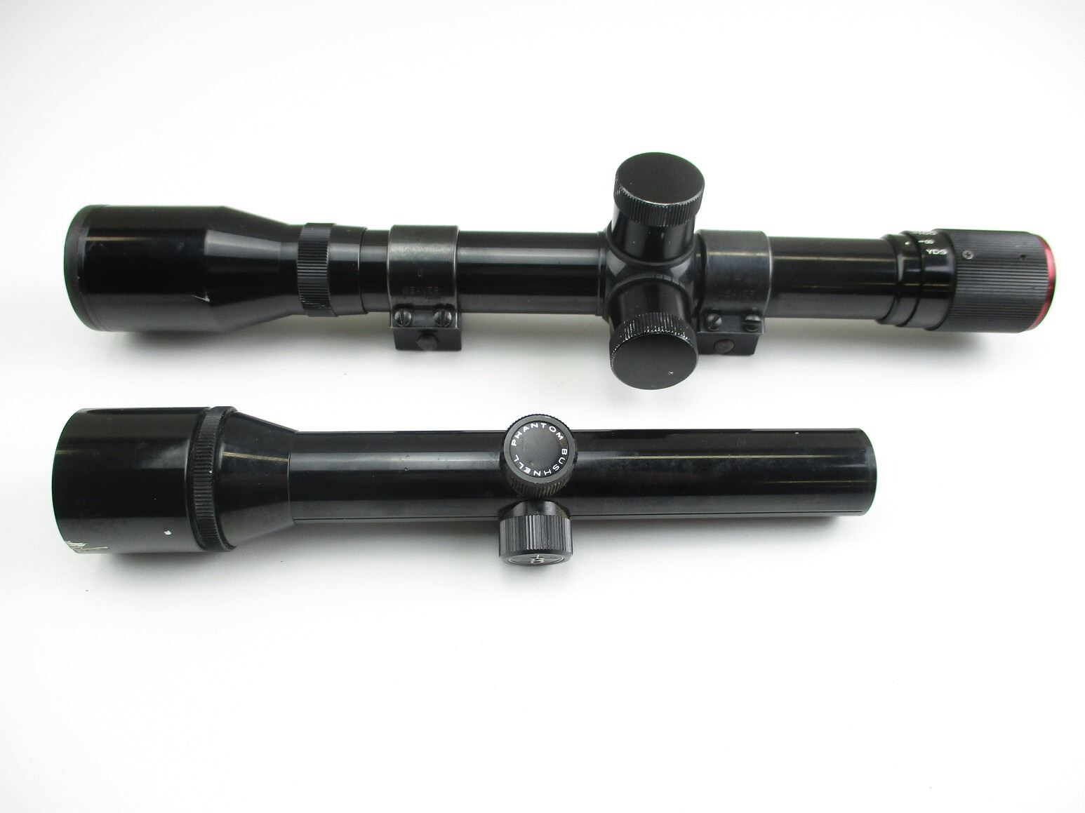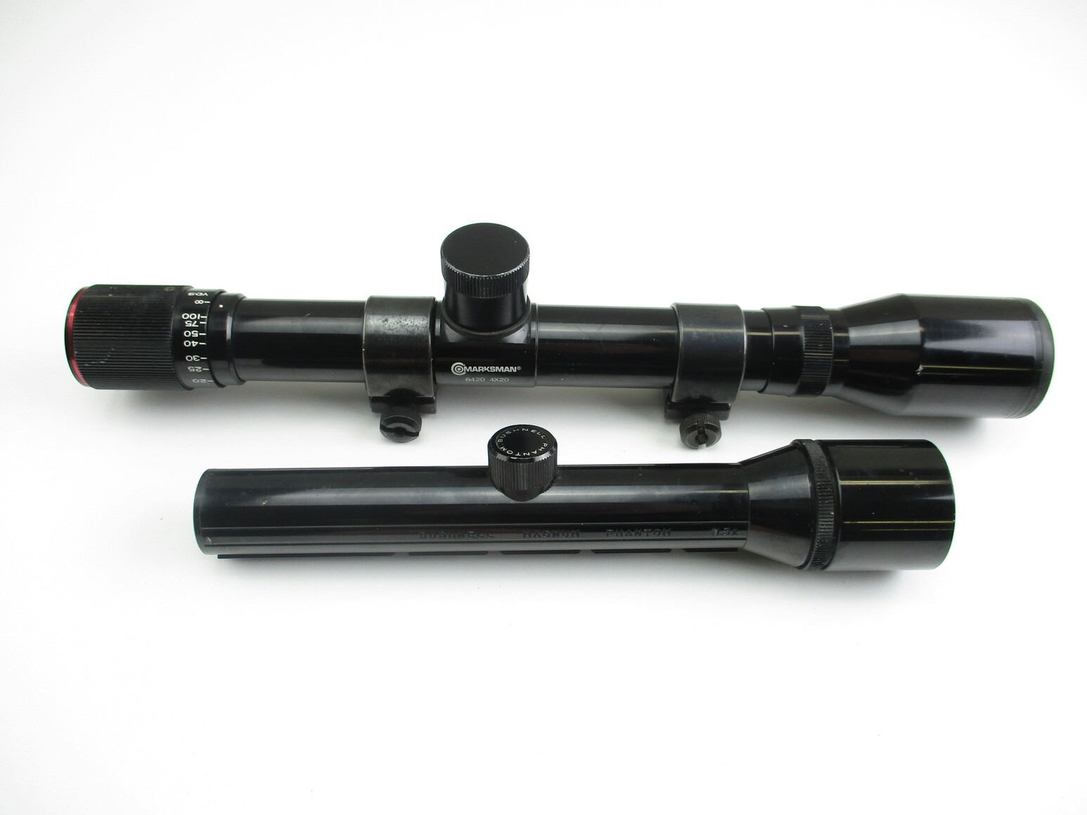 ASSORTED SCOPES , (1) MARKSMAN 4X 20 SCOPE, CLEAR OPTICS, DUPLEX RETICLE, 1" TUBE DIAMETER, PARALLAX: 10 YARDS TO ∞, WITH 1" WEAVER SCOPE RINGS, WITH QD THUMB SCREWS, (1) BUSHNELL MAGNUM PHANTOM 1.3X 20 PISTOL SCOPE, CLEAR OPTICS,