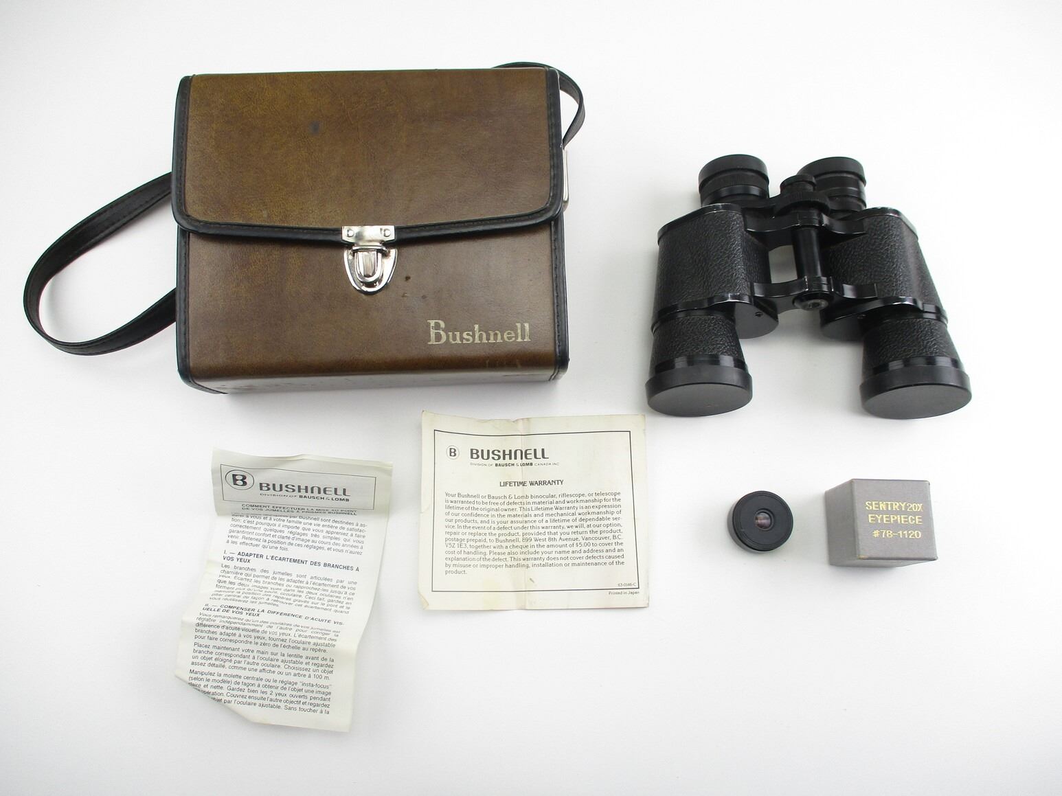 BUSHNELL 8X40 WA SPORTVIEW BINOCULARS ETC, LEFT LENS CRACKED, LEFT OPTICS SLANTED, COMES WITH LENS CAPS & CARRY CASE. INCLUDES (1) SENTRY 20X EYEPIECE #78-1120.