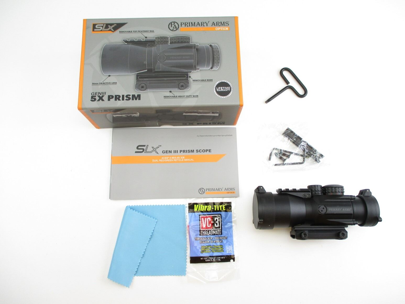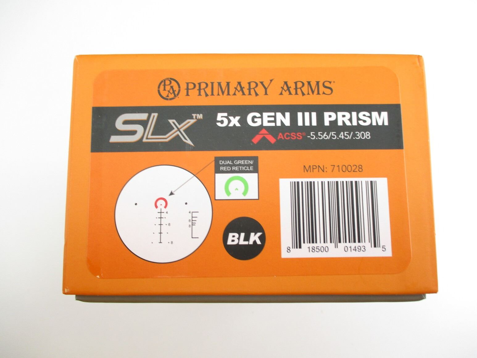 PRIMARY ARMS SLX 5X 36MM PRISM GEN III SCOPE , CLEAR OPTICS, ACSS 5.56 STYLE RETICLE, ILLUMINATES RED & GREEN, (WORKS), INCLUDES MOUNTING BRACKET FOR PICATINNY STYLE & WEAVER STYLE RAILS, WITH FLIP UP LENS CAPS. COMES IN ORIGINAL PACKAGE WITH MANUAL & CLEANING CLOTH.